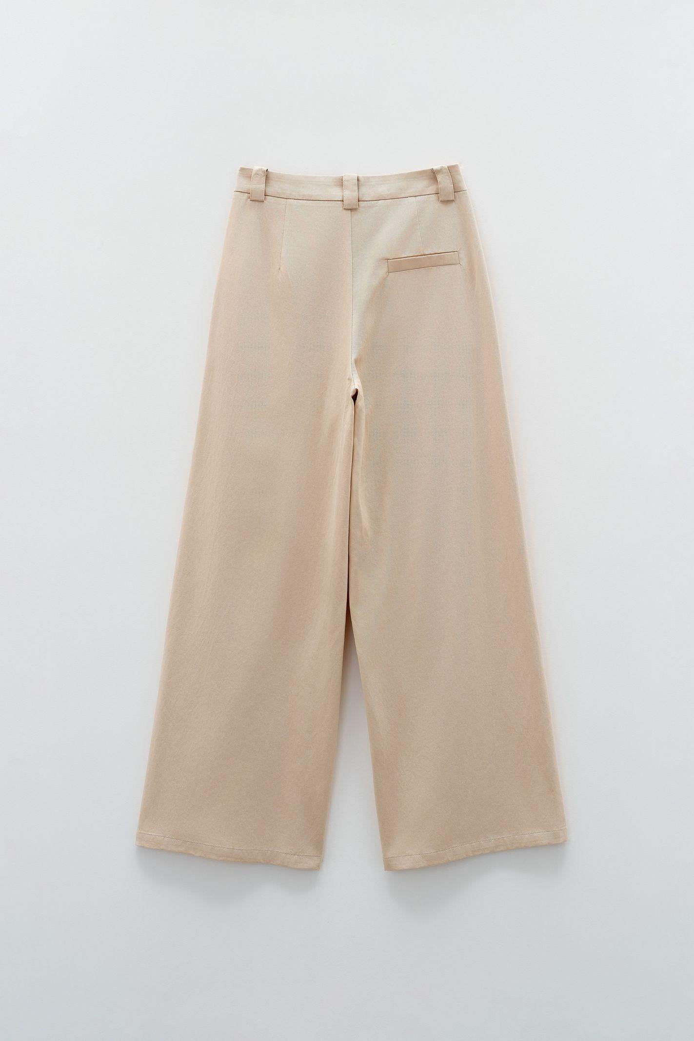 Pantalone realizzato in misto cotone e tencel, con una leggere lucentezza, taglio palazzo con gamba larga e fluida, che scende morbida e leggermente svasata fino al fondo, caratterizzato da due pence ben marcate sulla parte anteriore, favorendo una vestibilità comoda, due tasche laterali inserite nei fianchi, un fondo ampio con orlo semplice.