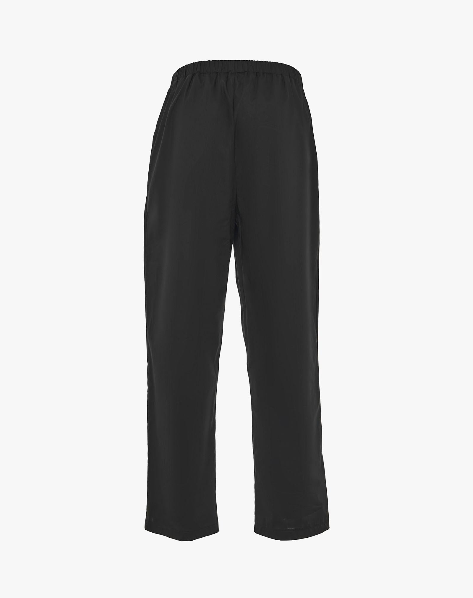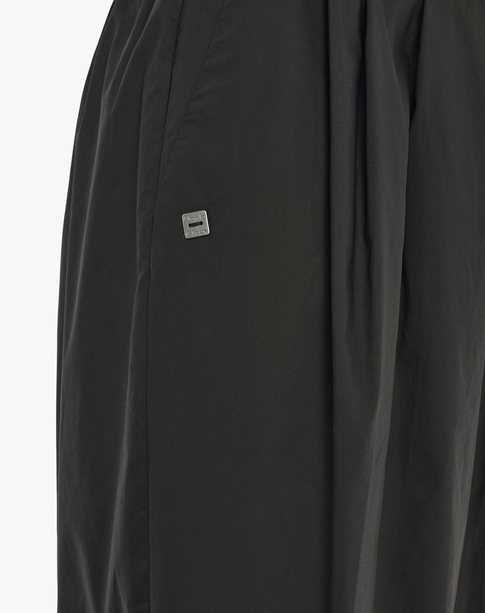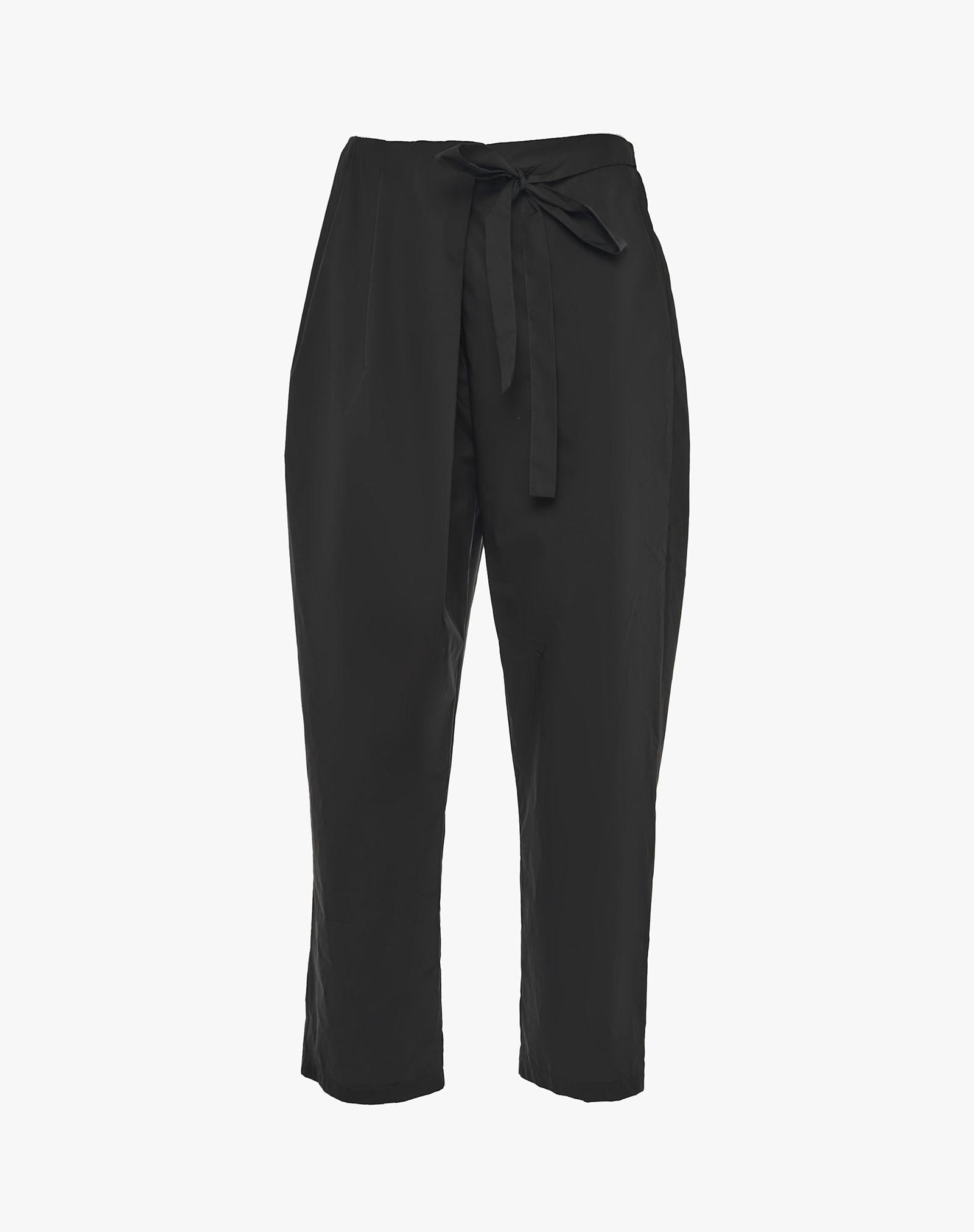 Pantalone momfit realizzato in cotone popeline, caratterizzato da vita bassa, particolarità del bustino accavallato con pieghe, abbottonatura asimmetrica e regolabile mediante una fusciacca posta al fianco destro.