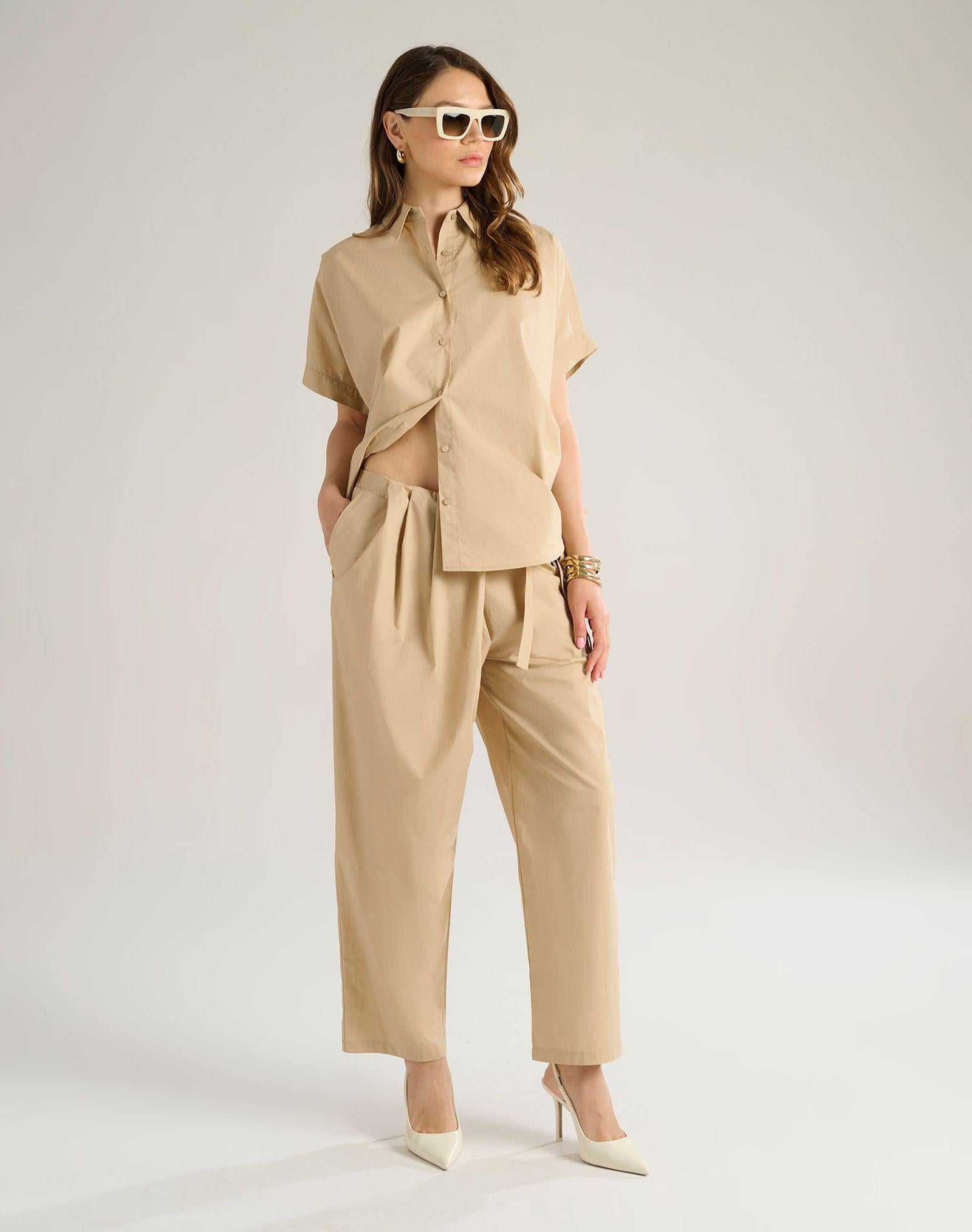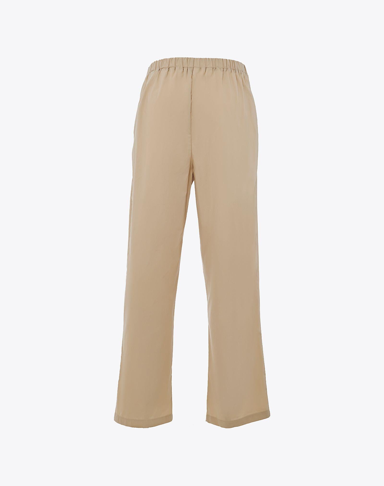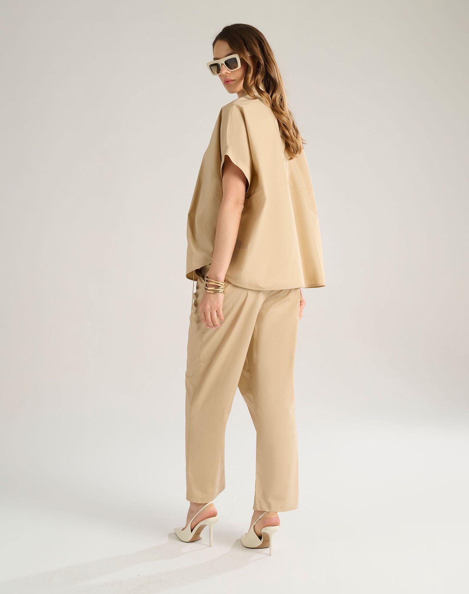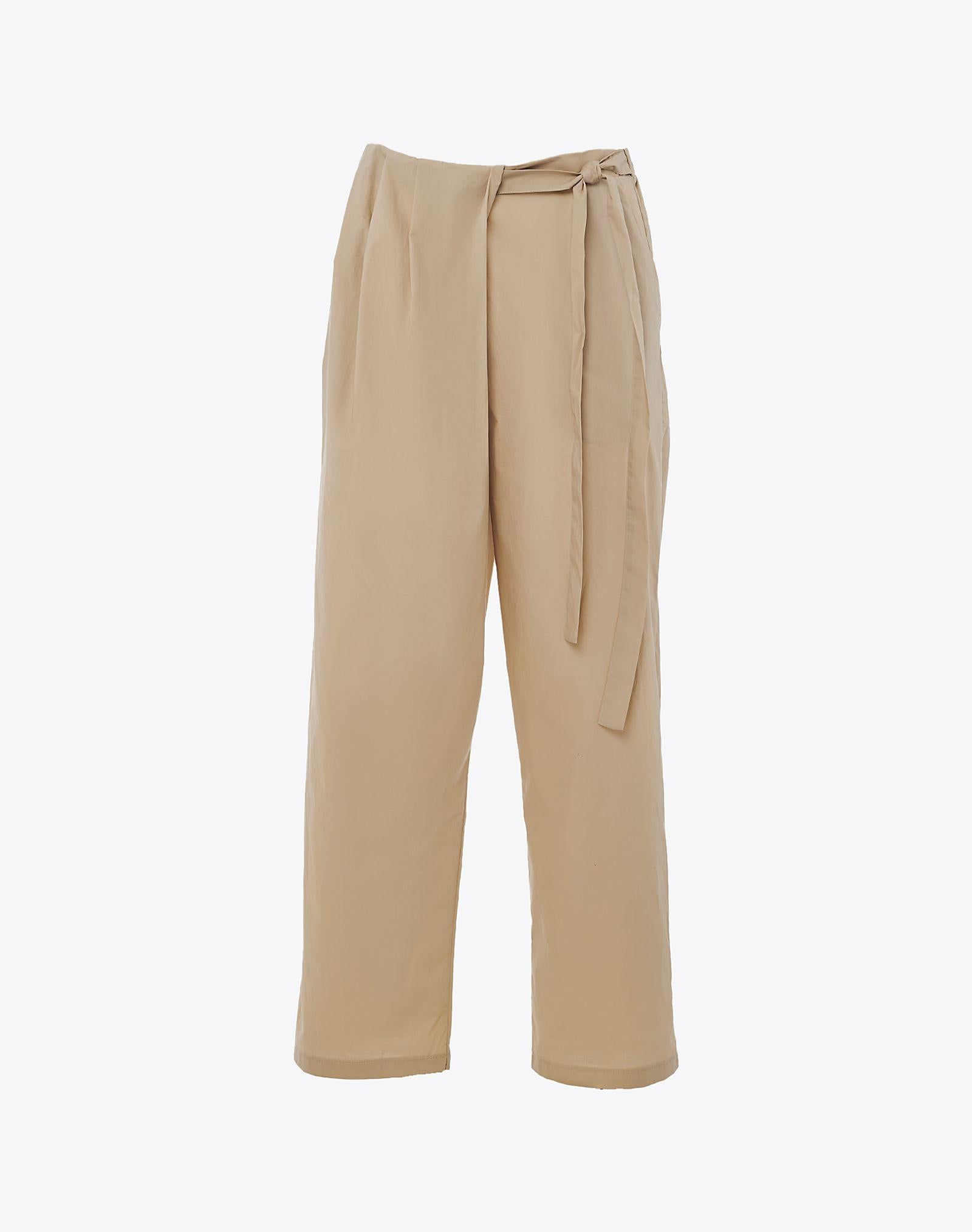 Pantalone momfit realizzato in cotone popeline, caratterizzato da vita bassa, particolarità del bustino accavallato con pieghe, abbottonatura asimmetrica e regolabile mediante una fusciacca posta al fianco destro.