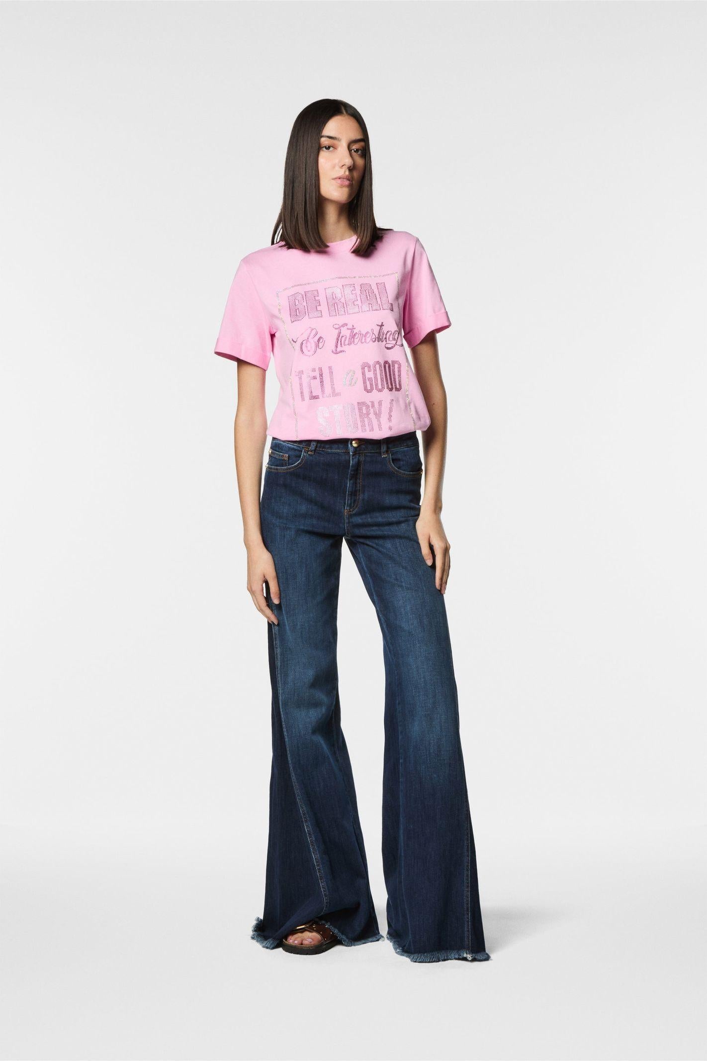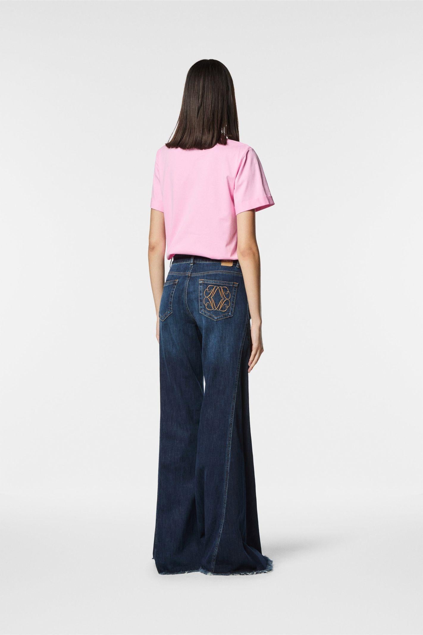 Pantalone jeans denim wide leg in tessuto comfort, con monogram ricamato sulla tasca posteriore per un dettaglio esclusivo, tasche all'americana e chiusura con bottone oro in vita, orlo sfrangiato al fondo. La vestibilità ampia garantisce libertà di movimento e un look moderno. Versatili e raffinati, uniscono stile e praticità, aggiungendo un tocco di eleganza all'outfit quotidiano.