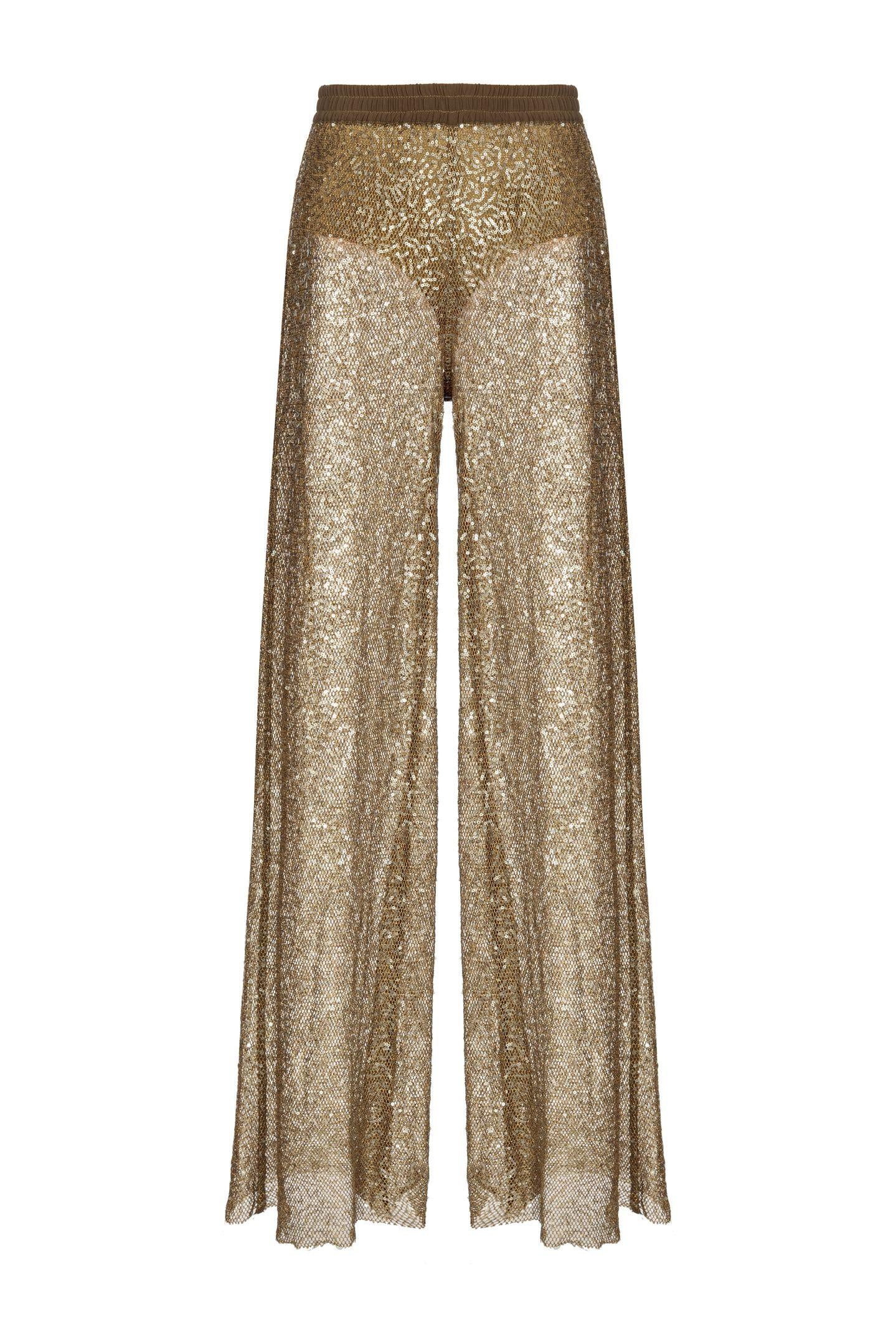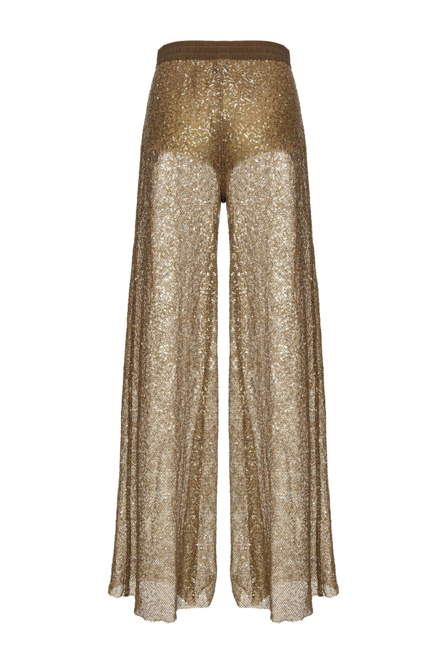 Pantalone ampio realizzato in tessuto tecnico lavorato a rete decorato con paillettes in tono colore ricamate che formano un disegno particolare su tutto il capo. La trasparenza del tessuto è attenuata da coulotte in tessuto inserito sotto. La vita regolare con elastico e punto smock crea un motivo arricciato.