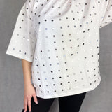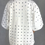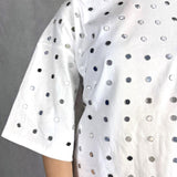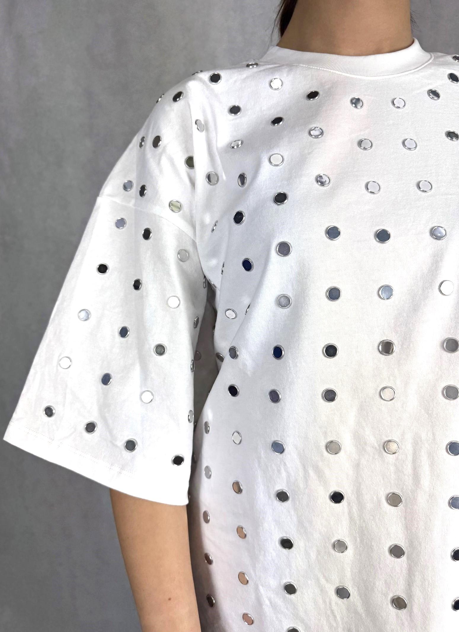 T- shirt girocollo a mezze maniche, impreziosita da mini specchietti davanti su tutta la lunghezza, realizzata in cotone con vestibilità regular, ed una lunghezza sopra ai fianchi.