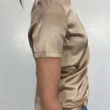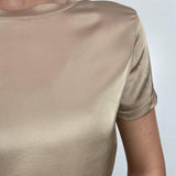 T-shirt realizzata in viscosa lucida elasticizzata, con scollatura tonda, maniche corte, vestibilità aderente, una lunghezza fino ai fianchi. Ideale indossarla sotto un blazer oppure con un jeans per un look più comodo e casual.