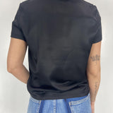 T-shirt realizzata in viscosa lucida elasticizzata, con scollatura tonda, maniche corte, vestibilità aderente, una lunghezza fino ai fianchi. Ideale indossarla sotto un blazer oppure con un jeans per un look più comodo e casual.