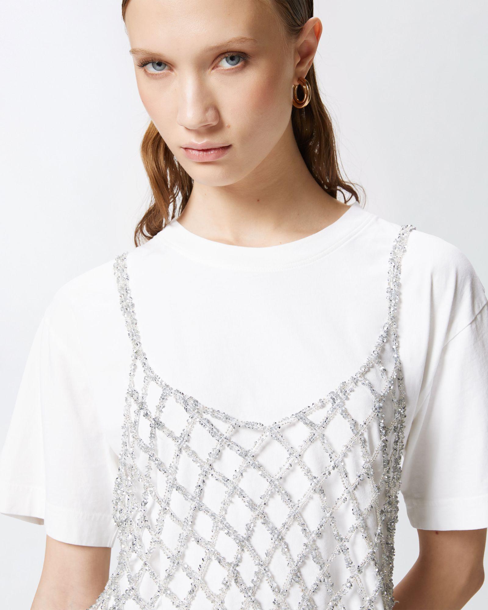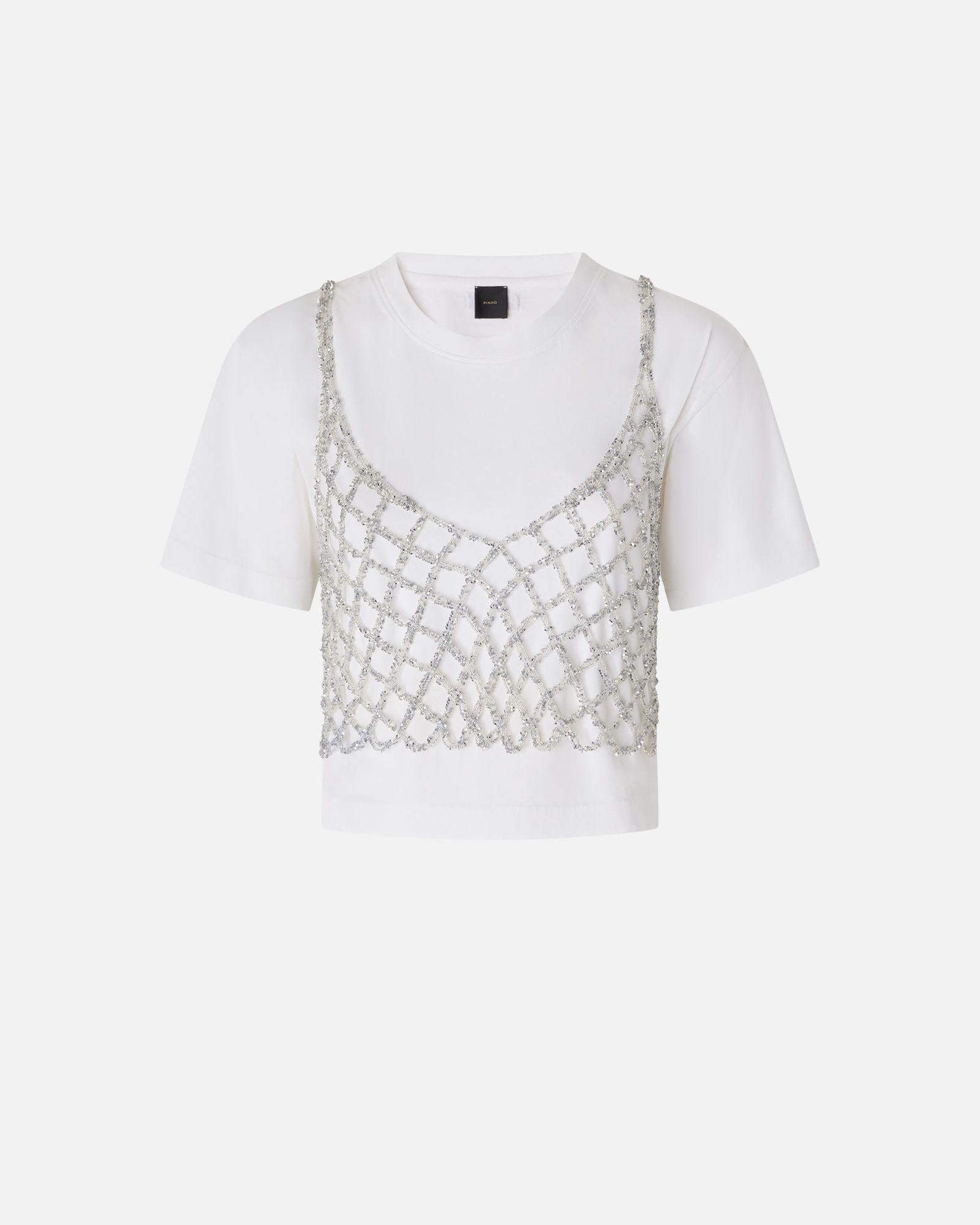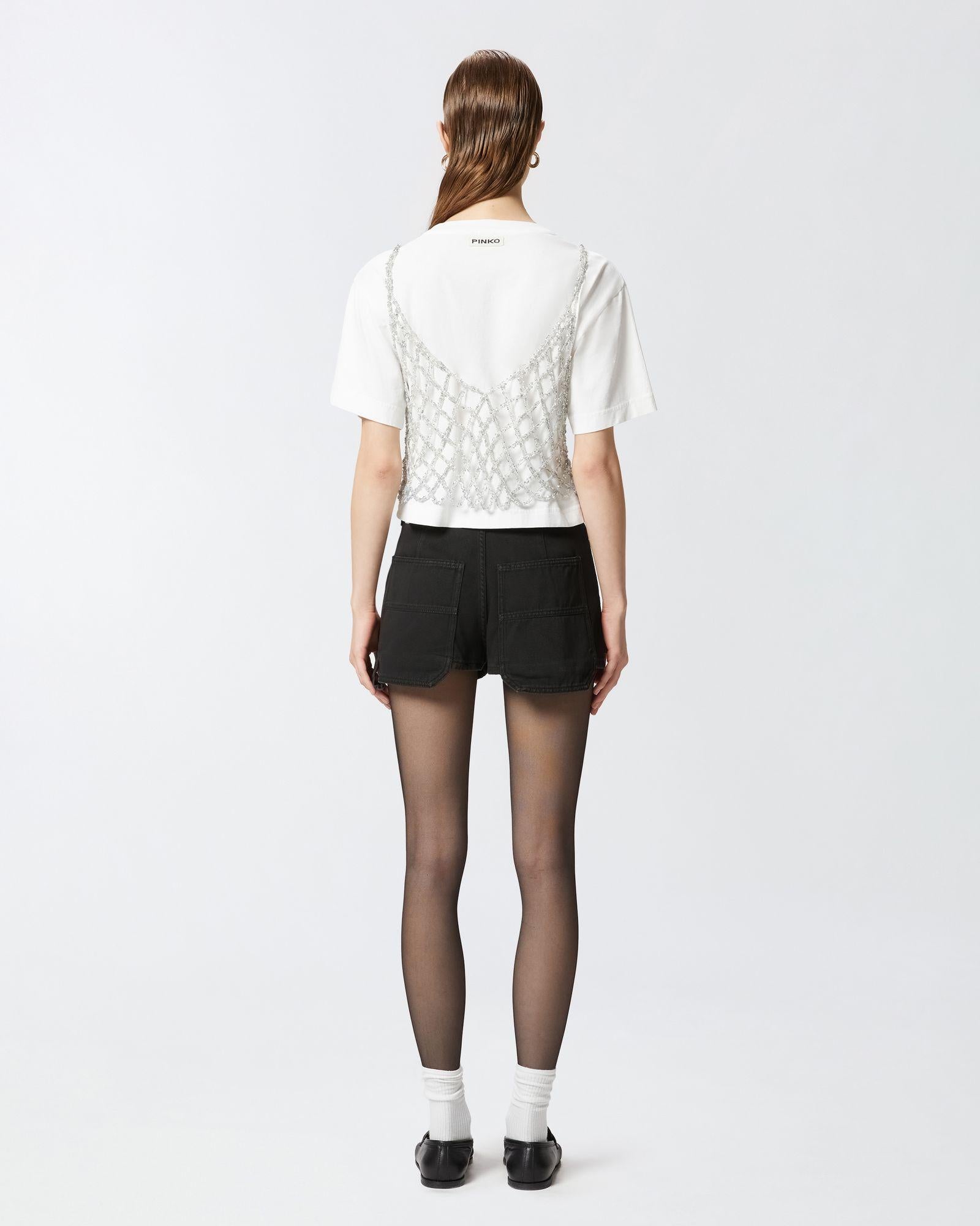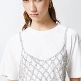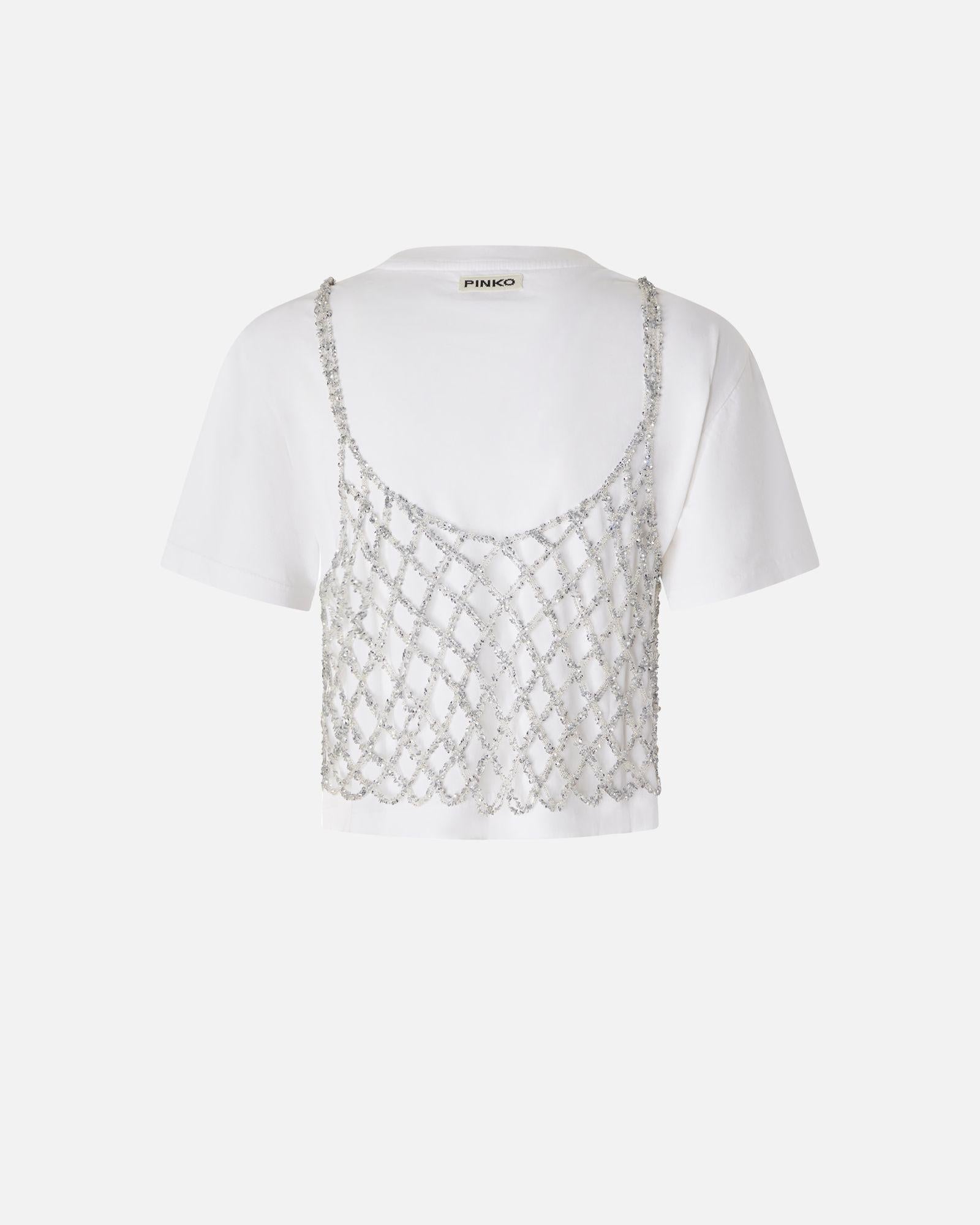 Maglia a maniche corte in cotone, corta in vita e completata da top a canotta da indossare sopra e realizzato in rete crochet metallizzata, che aggiunge un tocco scintillante grazie al filo utilizzato che include delle piccole paillettes.