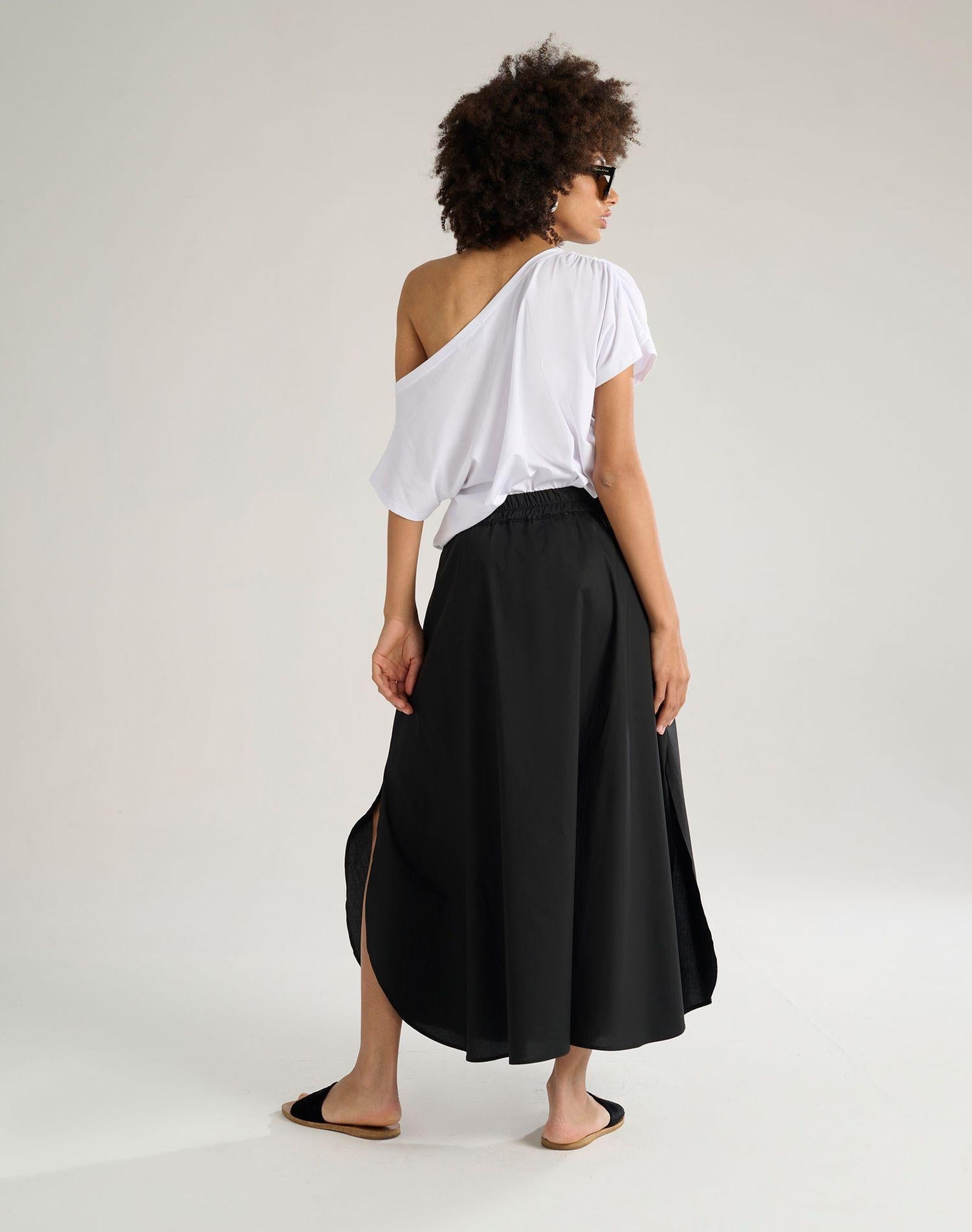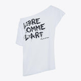 T-shirt realizzata in cotone caratterizzata da scollo asimmetrico, vestibilità larga, una manica arricciata sulla spalla, stampa lettering e logo sul davanti.