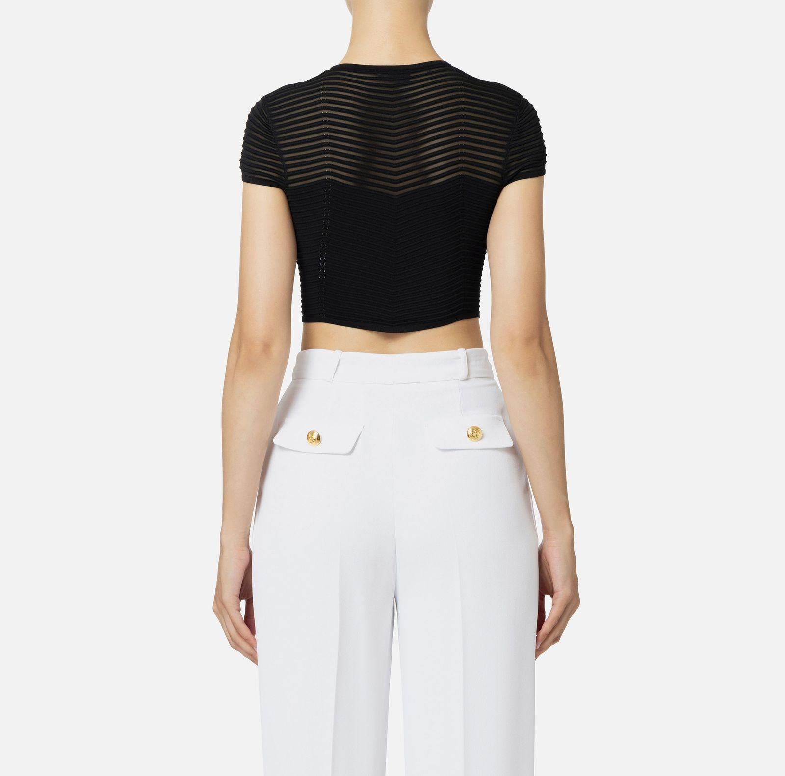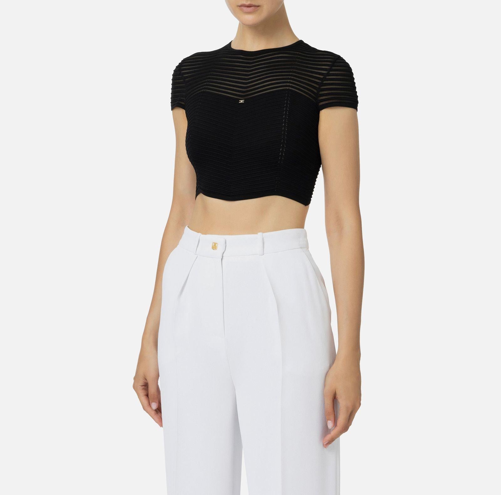 Top cropped in viscosa con lavorazione motivo chevron tridimensionale alternato a un punto rete, caratterizzato da maniche corte trasparenti e una scollatura a giro con accessorio in metallo dorato, dalla vestibilità aderente.