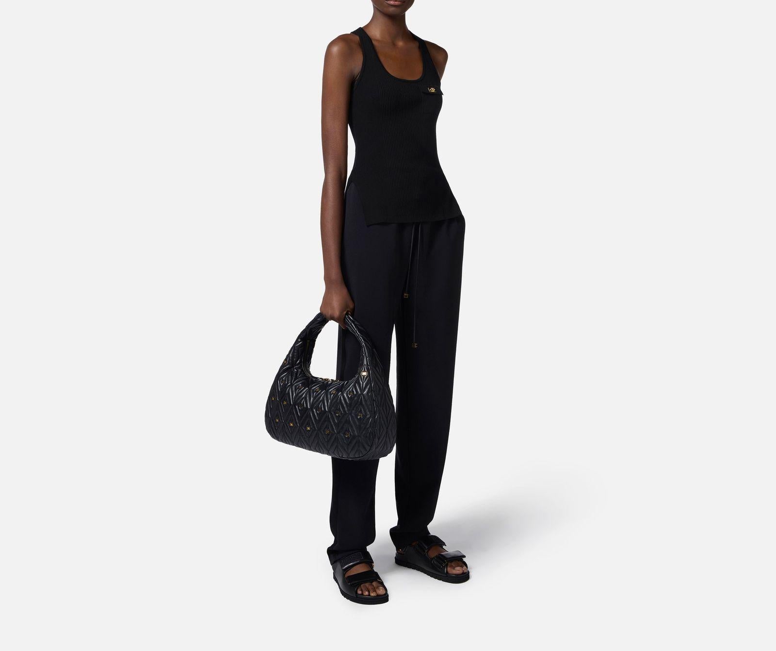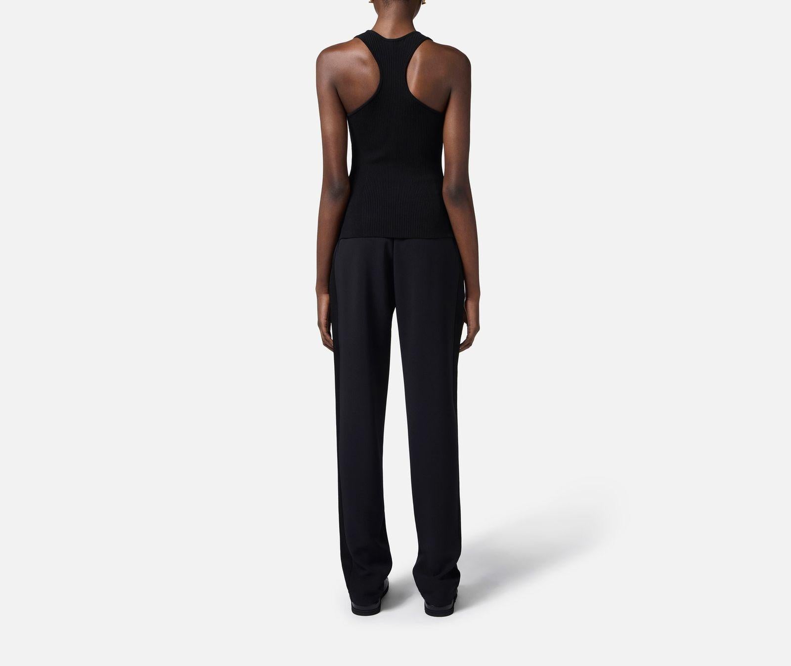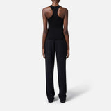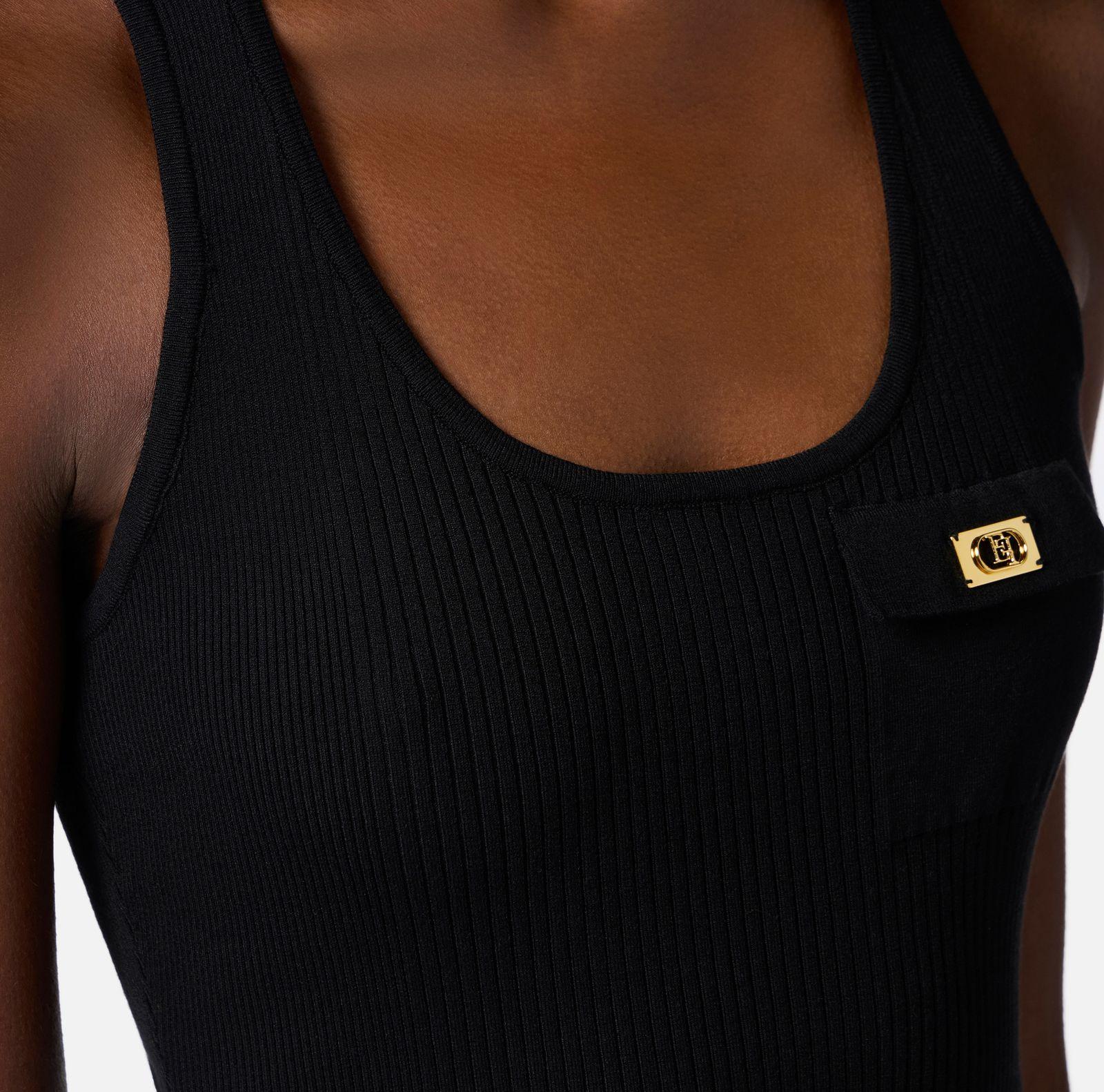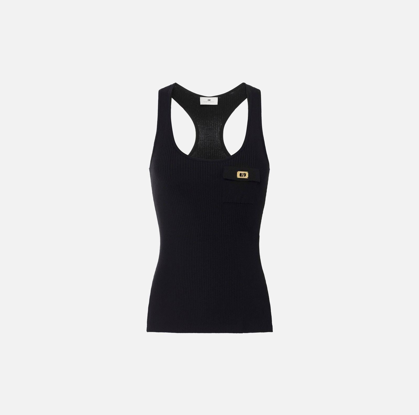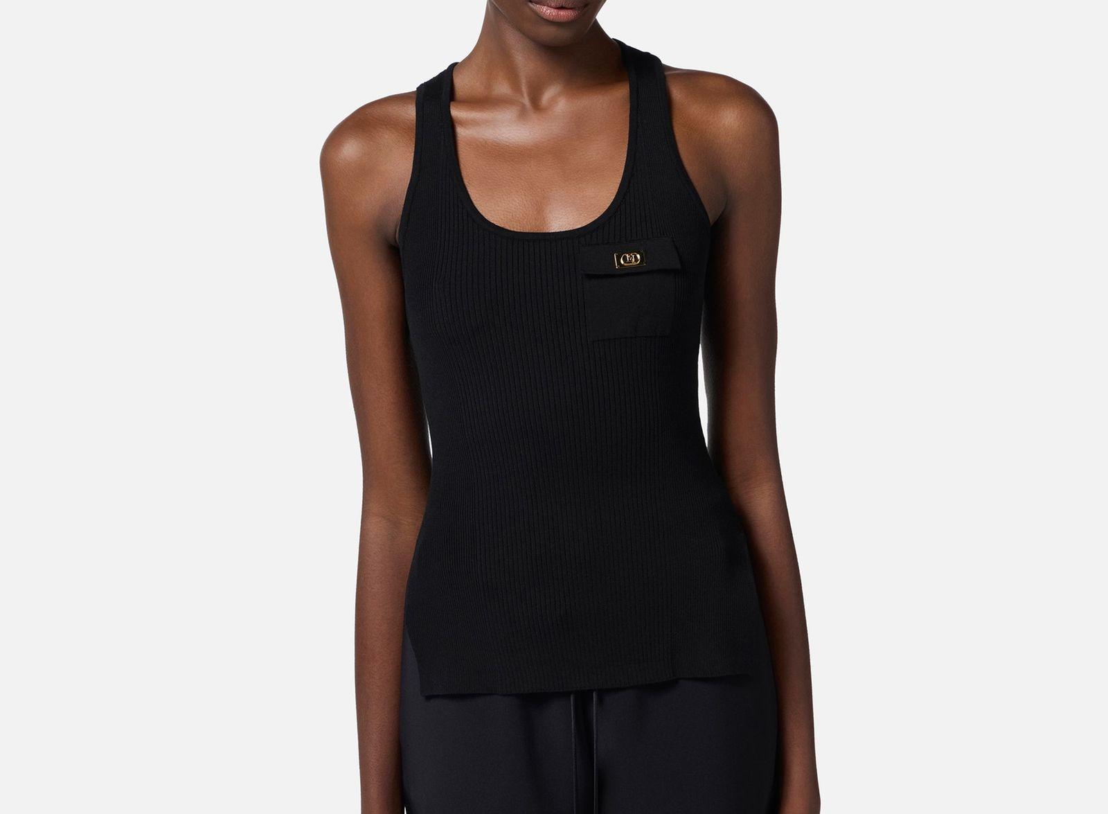Top a canotta realizzato in misto lyocell e seta, lavorato a micro costine con schiena a vogatore e un taschino illuminato da una piccola placchetta in metallo dorato con logo e con vestibilità aderente.