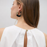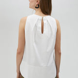 Top girocollo in popeline di cotone con spalline larghe, chiusura posteriore con bottone in galvanica dorata e caratterizzato da spacchi laterali e mini balza davanti.