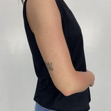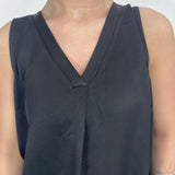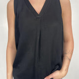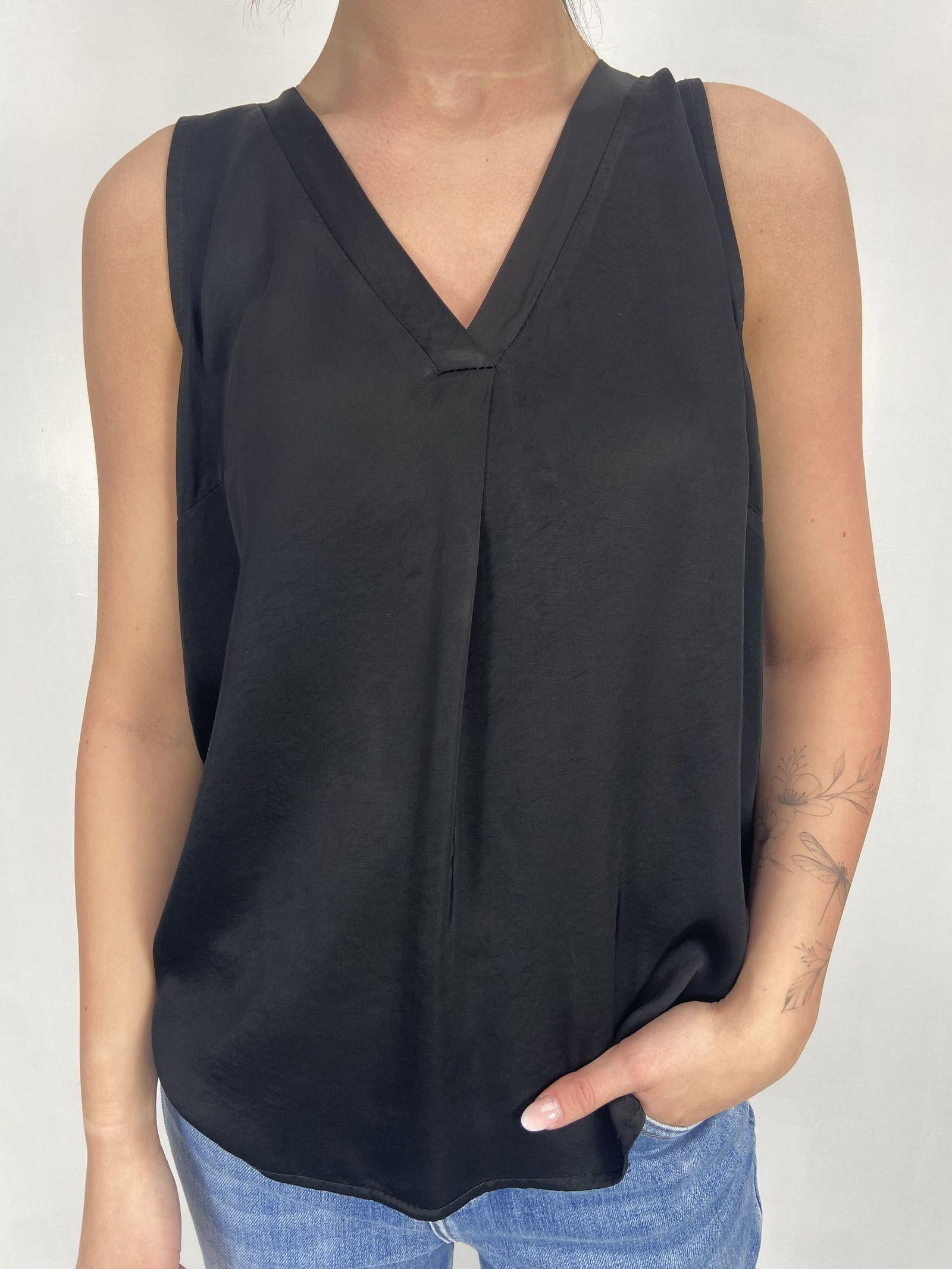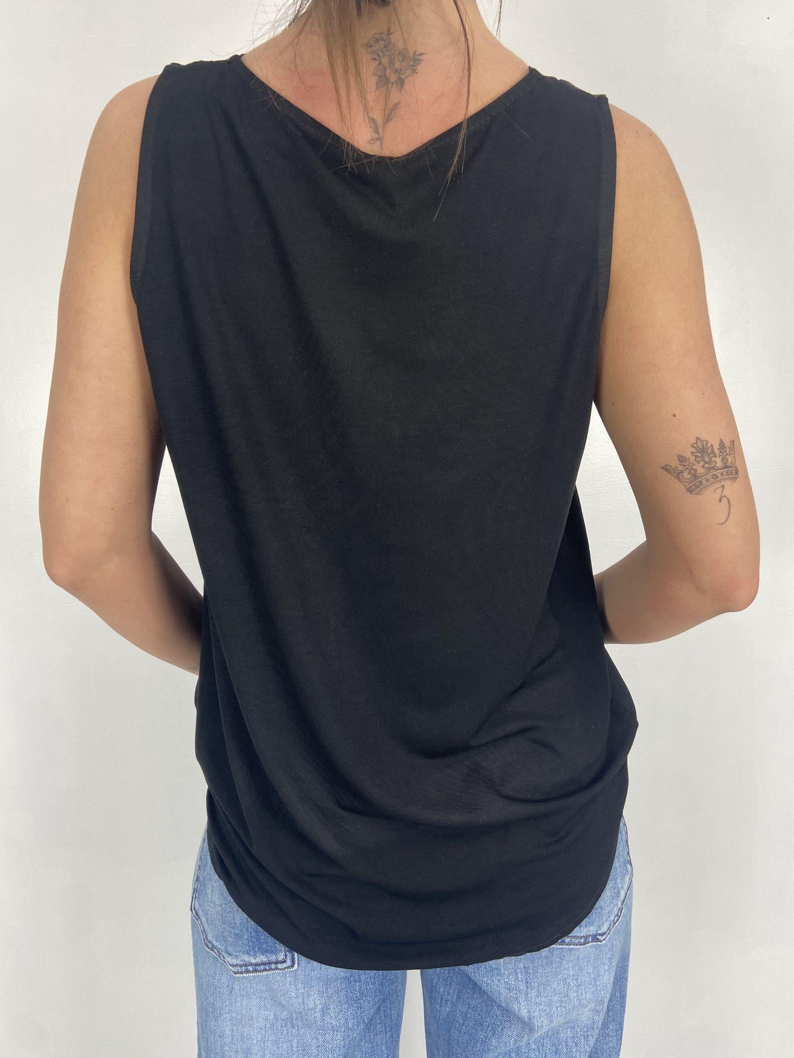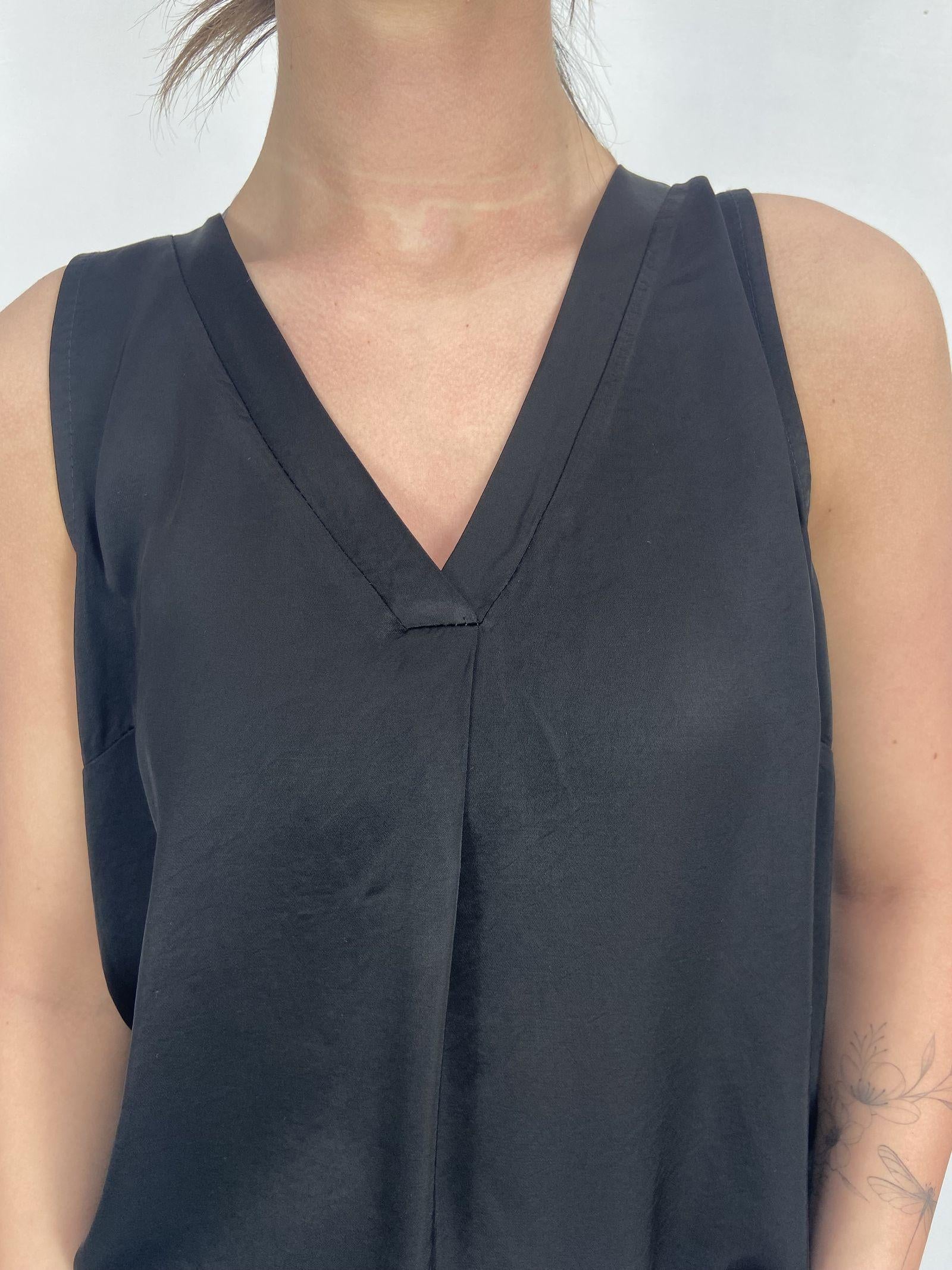 Top smanicato con scollatura a V, realizzato in doppio materiale, davanti un misto viscosa e seta, dietro jersey elasticizzato, con una vestibilità comoda, leggermente svasata su lati, una lunghezza sotto ai fianchi.