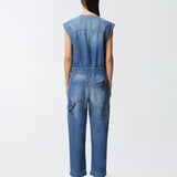 Tuta jumpsuit senza maniche realizzata in tessuto denim leggero di cotone e lino con un lavaggio medio. La linea senza maniche è completata da una scollatura a V davanti, patte a punta applicate e impunture verticali. I jeans che completano questa tuta sono caratterizzati da linea dritta, leggermente affusolata al fondo, con tasche utility e passante laterale, chiusura con bottoni a chiodo in metallo e zip coperta sui jeans.