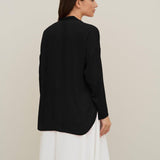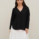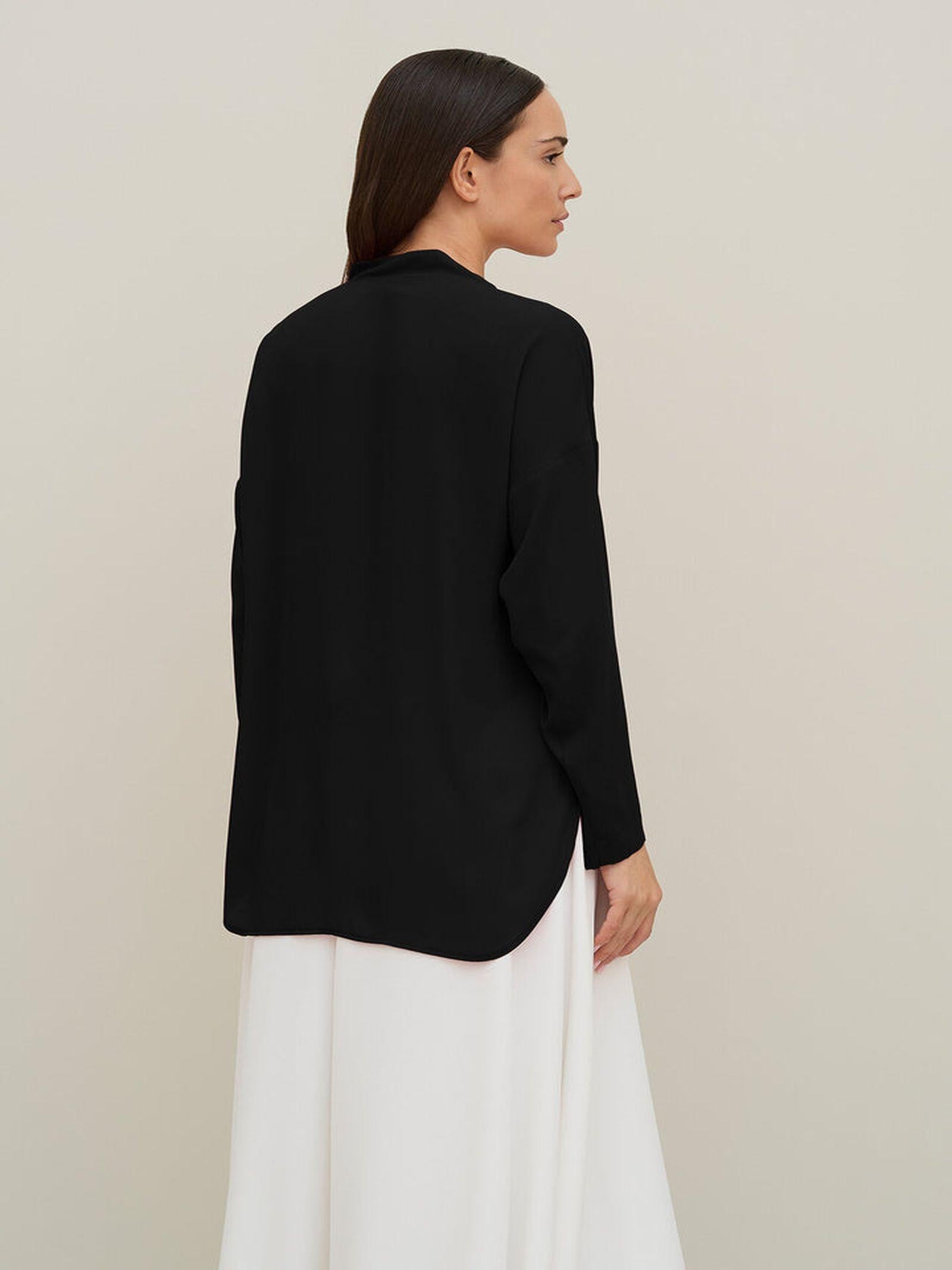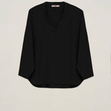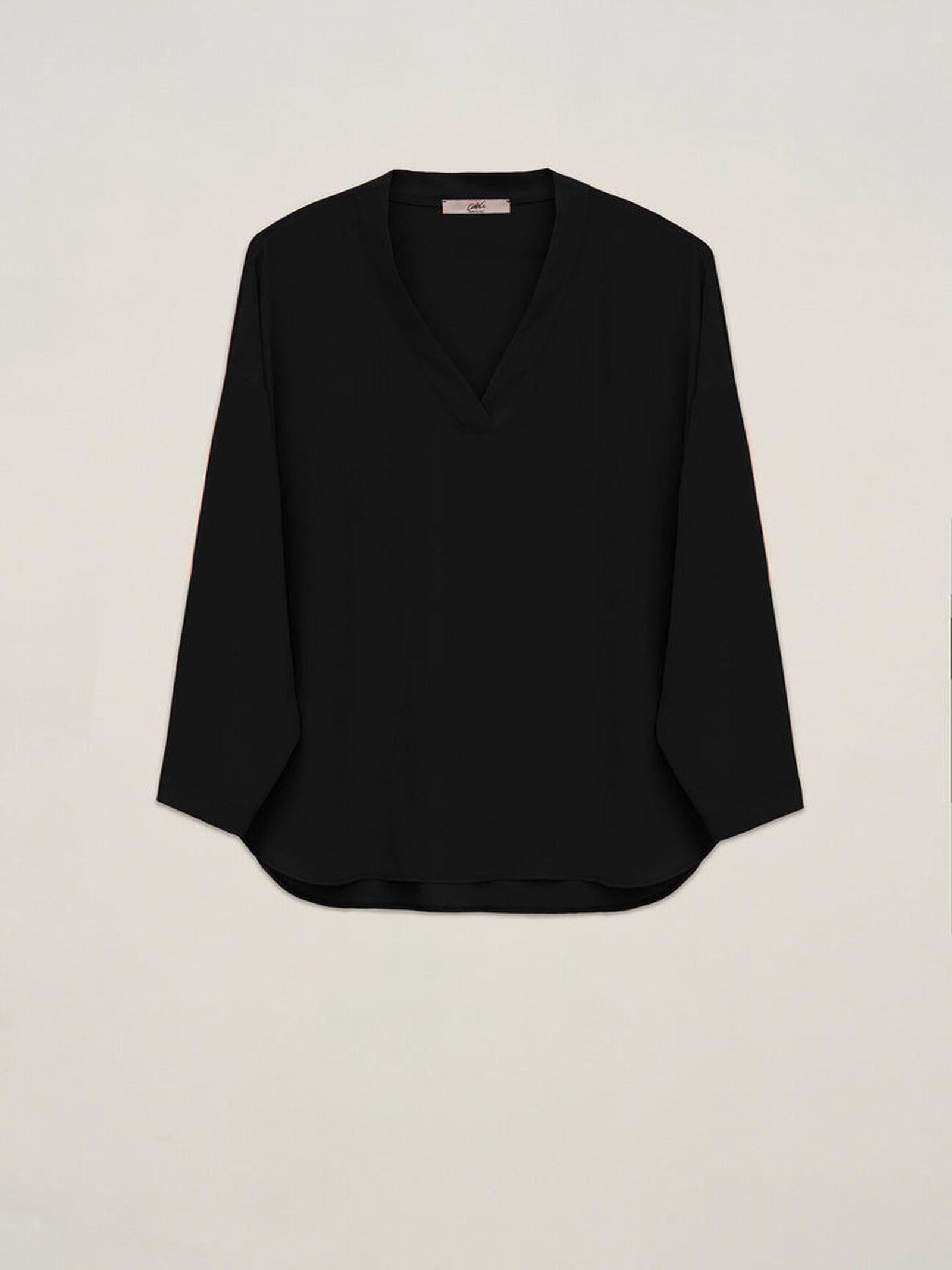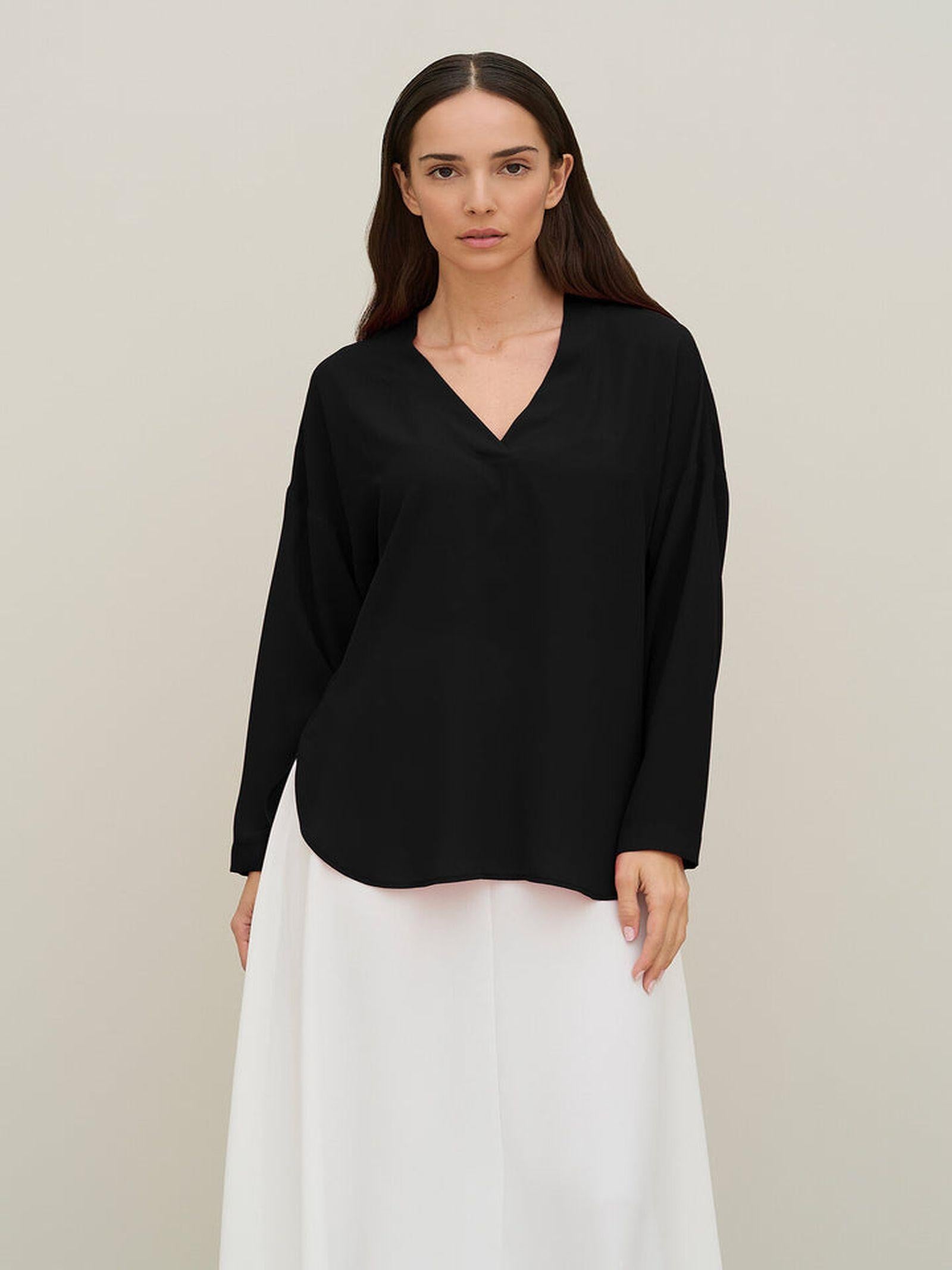 Maglia a maniche lunghe in crepe di poliestere, con scollatura a V e un giromanica sceso. Ha un fondo con spacchetti laterali e parte anteriore leggermente più corta e una lunghezza ai fianchi.