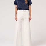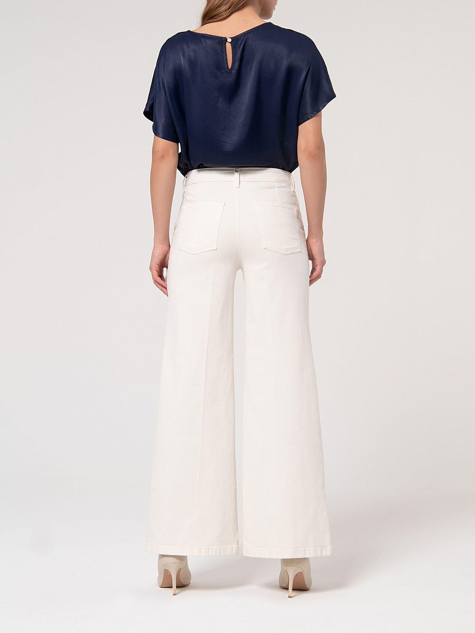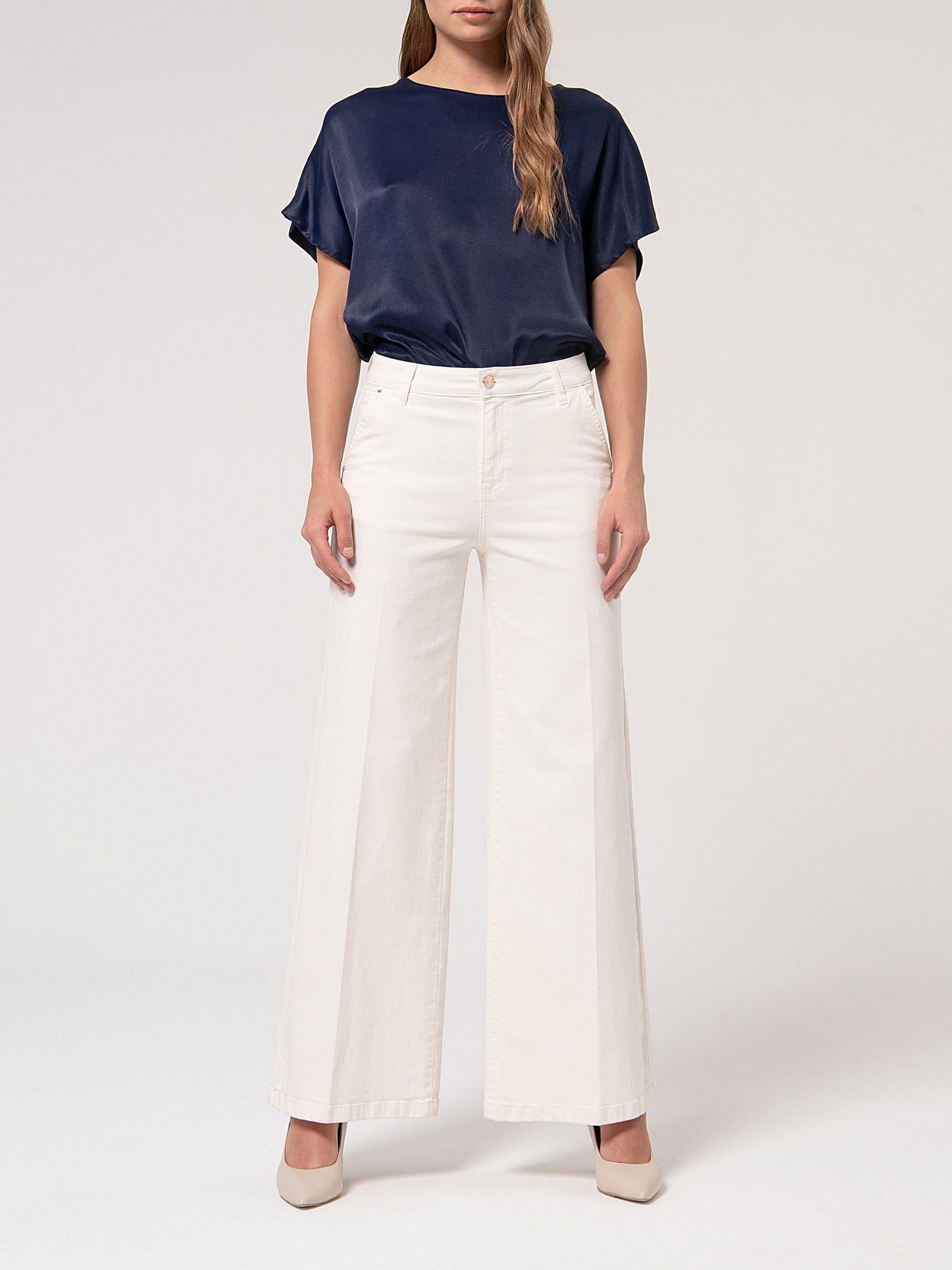 Pantalone flare in gabardina stretch con vita regolare, modello cinque tasche e gamba con fondo ampio.