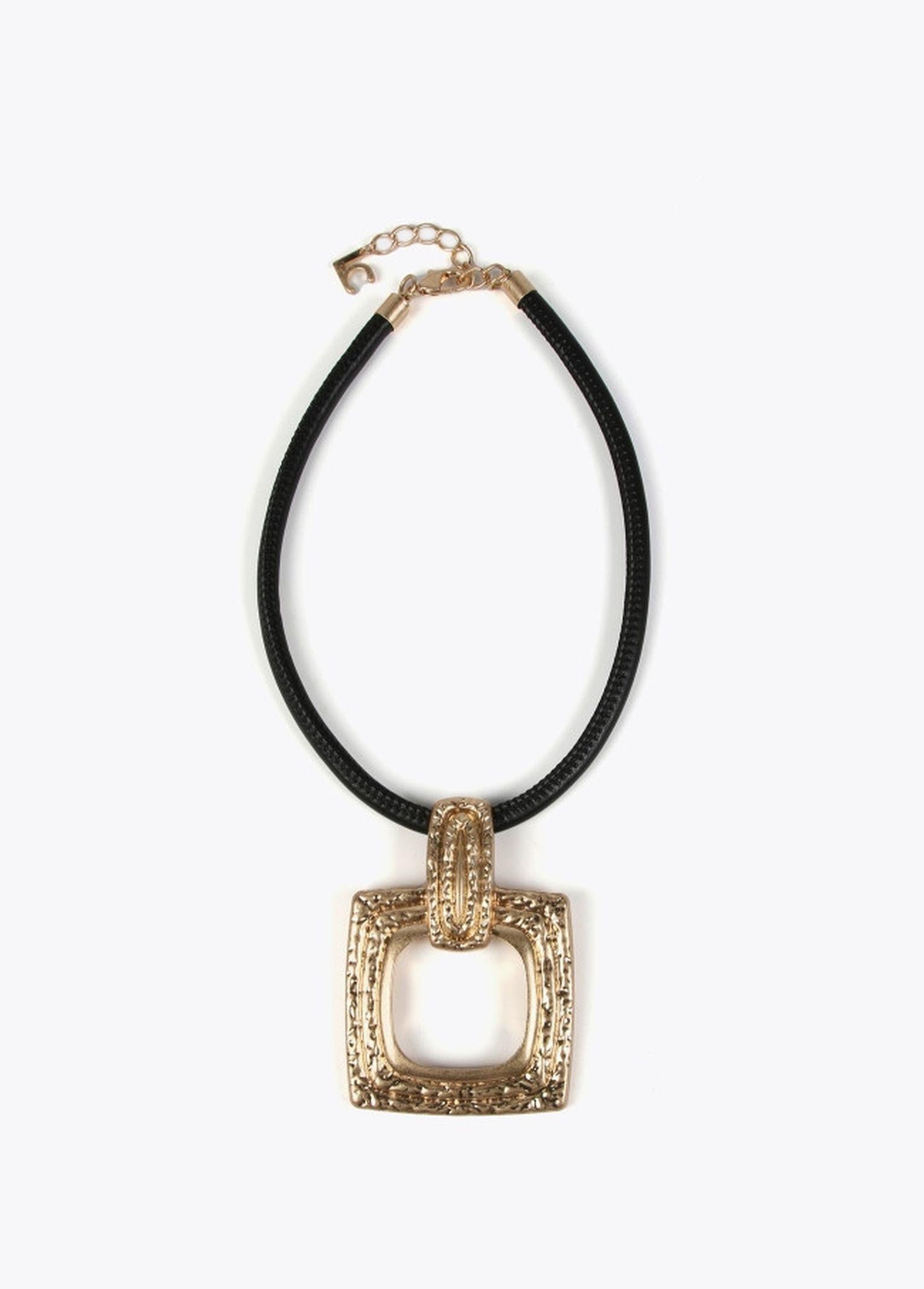 Collana con maxi elemento quadrato e texture perforata dal colore dorato e un laccio nero in cuoio.