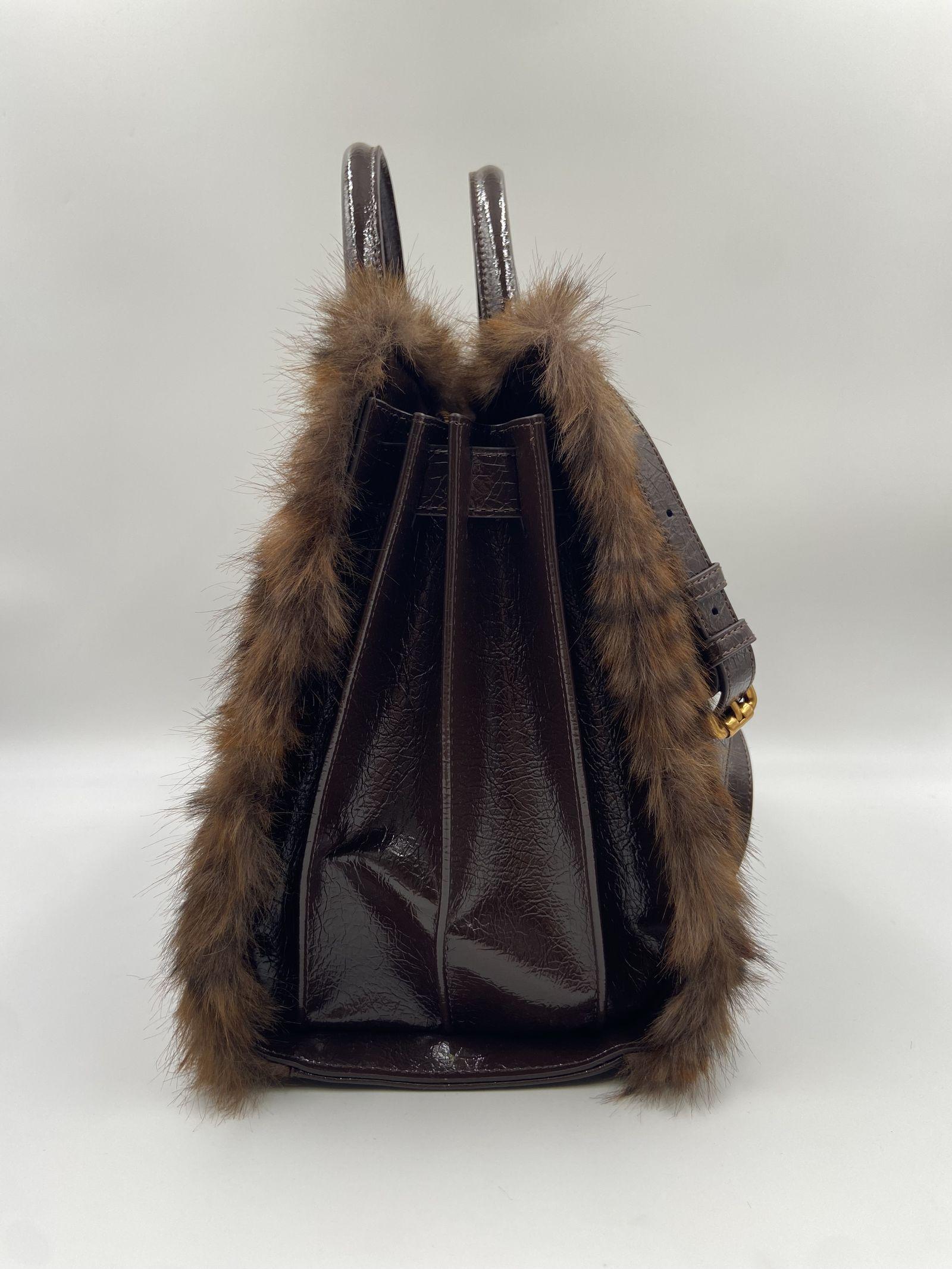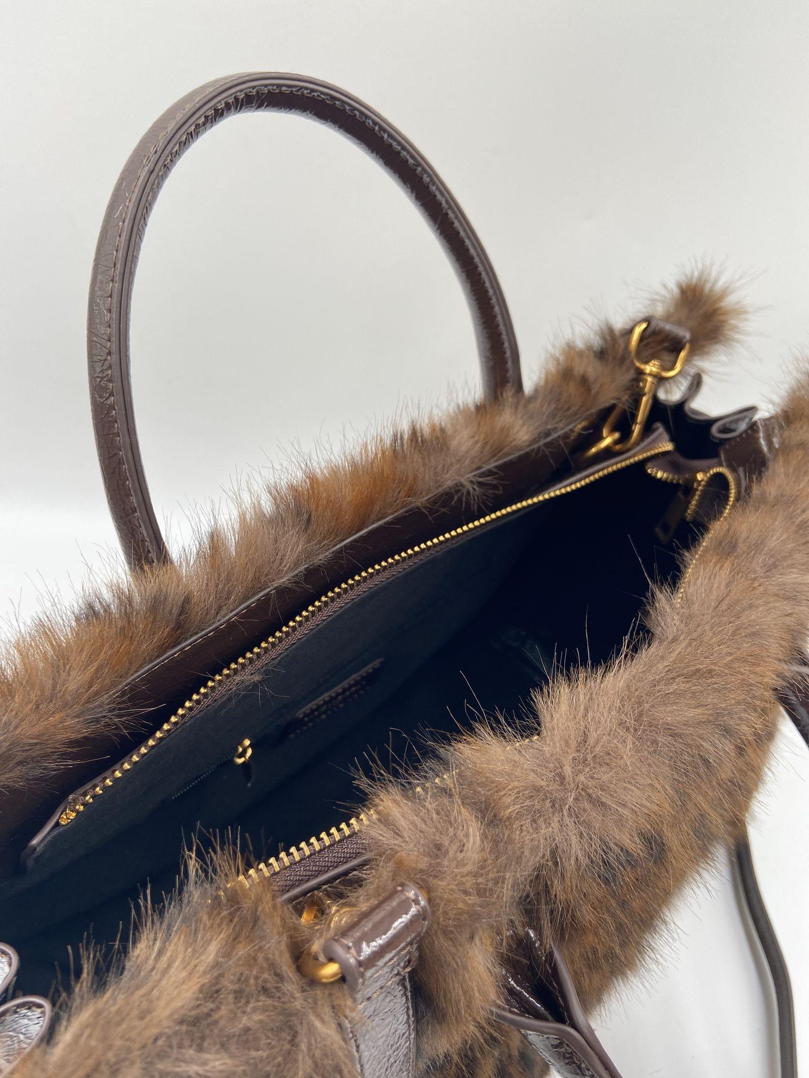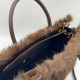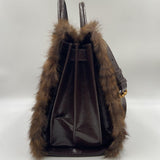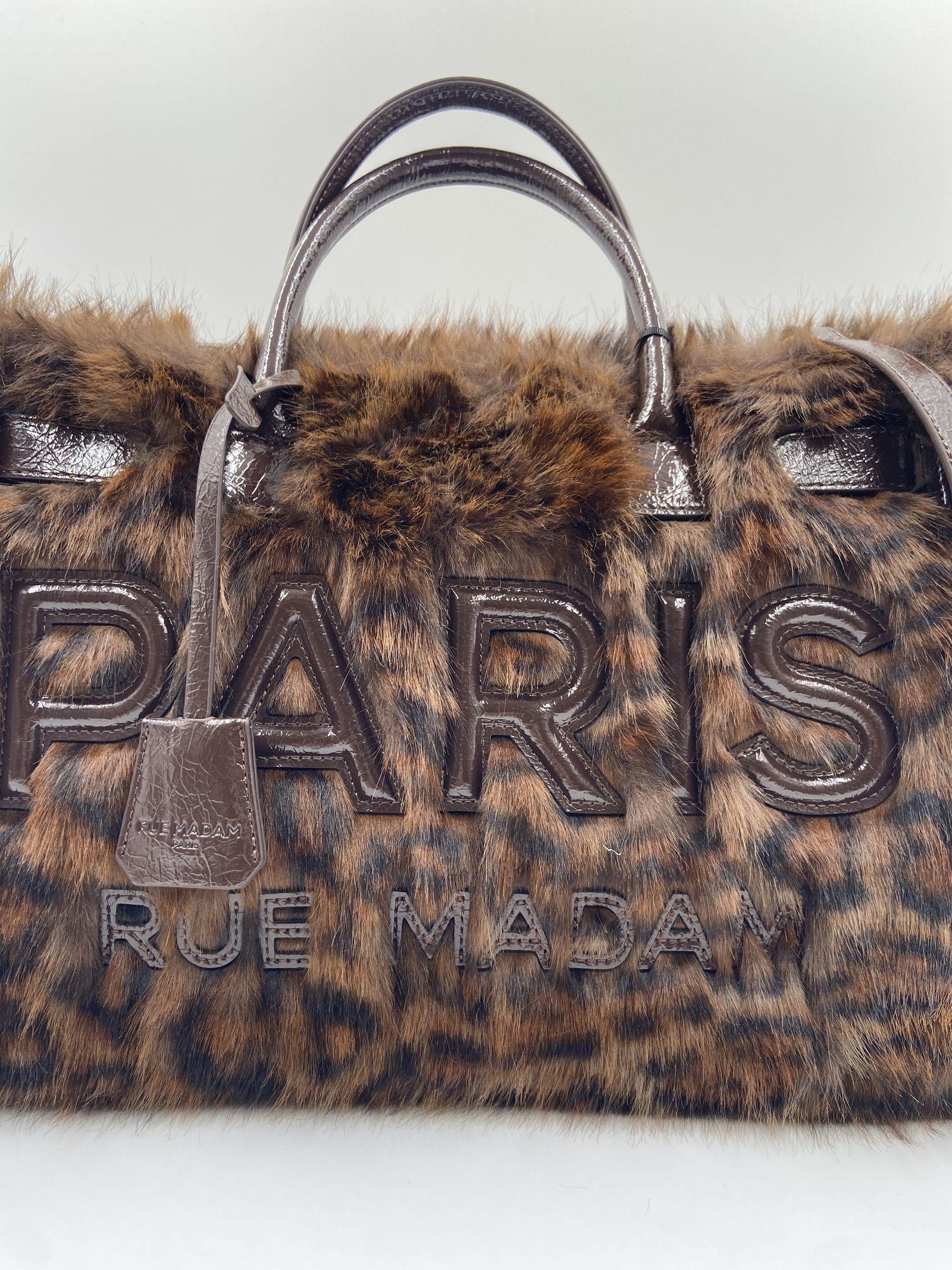 Borsa realizzata in fake-fur, con fantasia maculata, caratterizzata da interno foderato in tessuto colore nero, doppio manico in pelle lucida marrone, tracolla regolabile e removibile, chiusura con zip dorata, tasca piccola interna con zip e una a parete aperta, logo davanti, fondo con piedini. Si distingue per l'effetto pelliccia pello corto colore marrone, dalla fantasia maculata con una base similpelle marrone lucida.Dimensioni: H 25cm x L 37cm x P 16cm