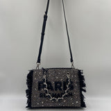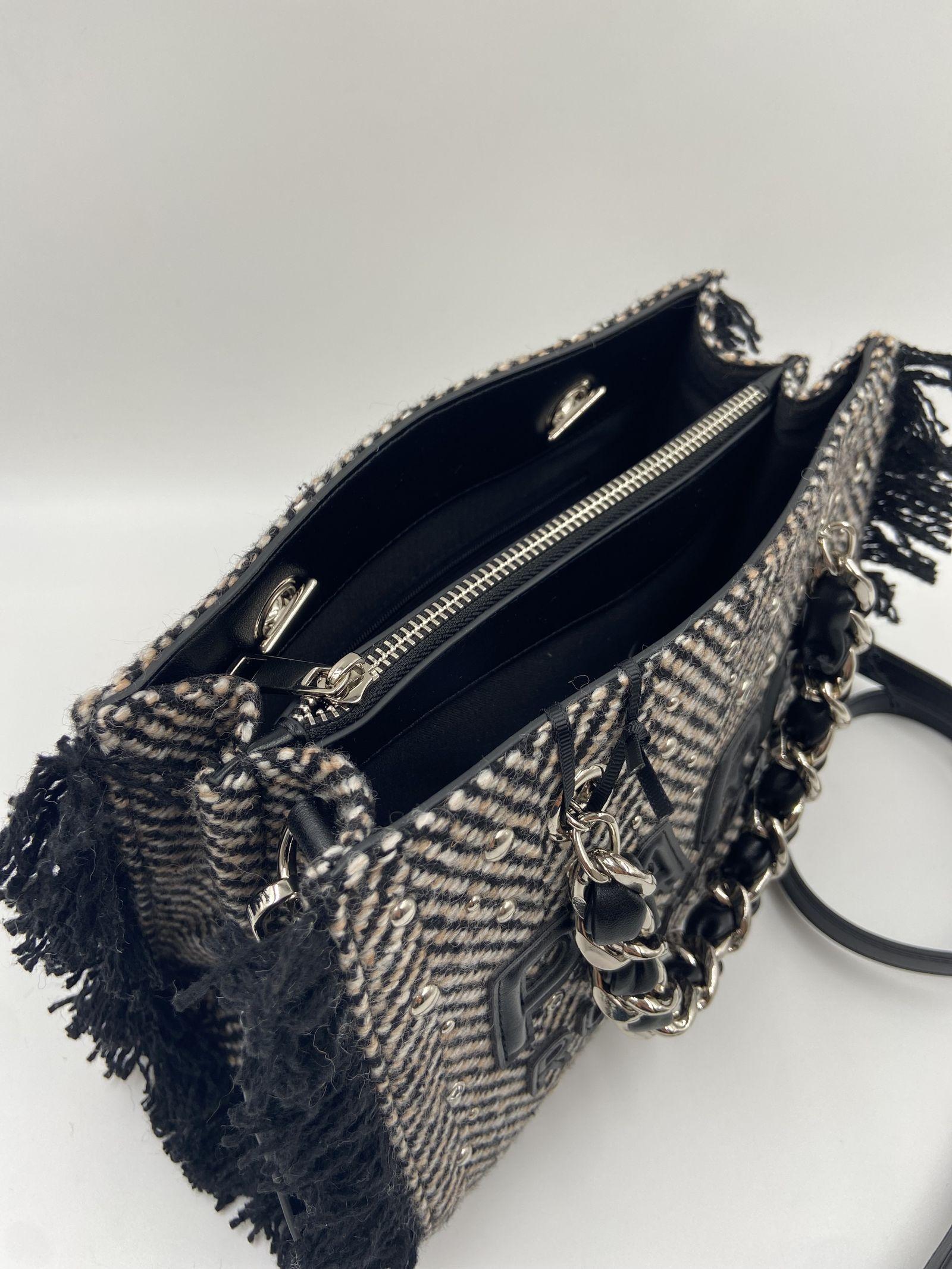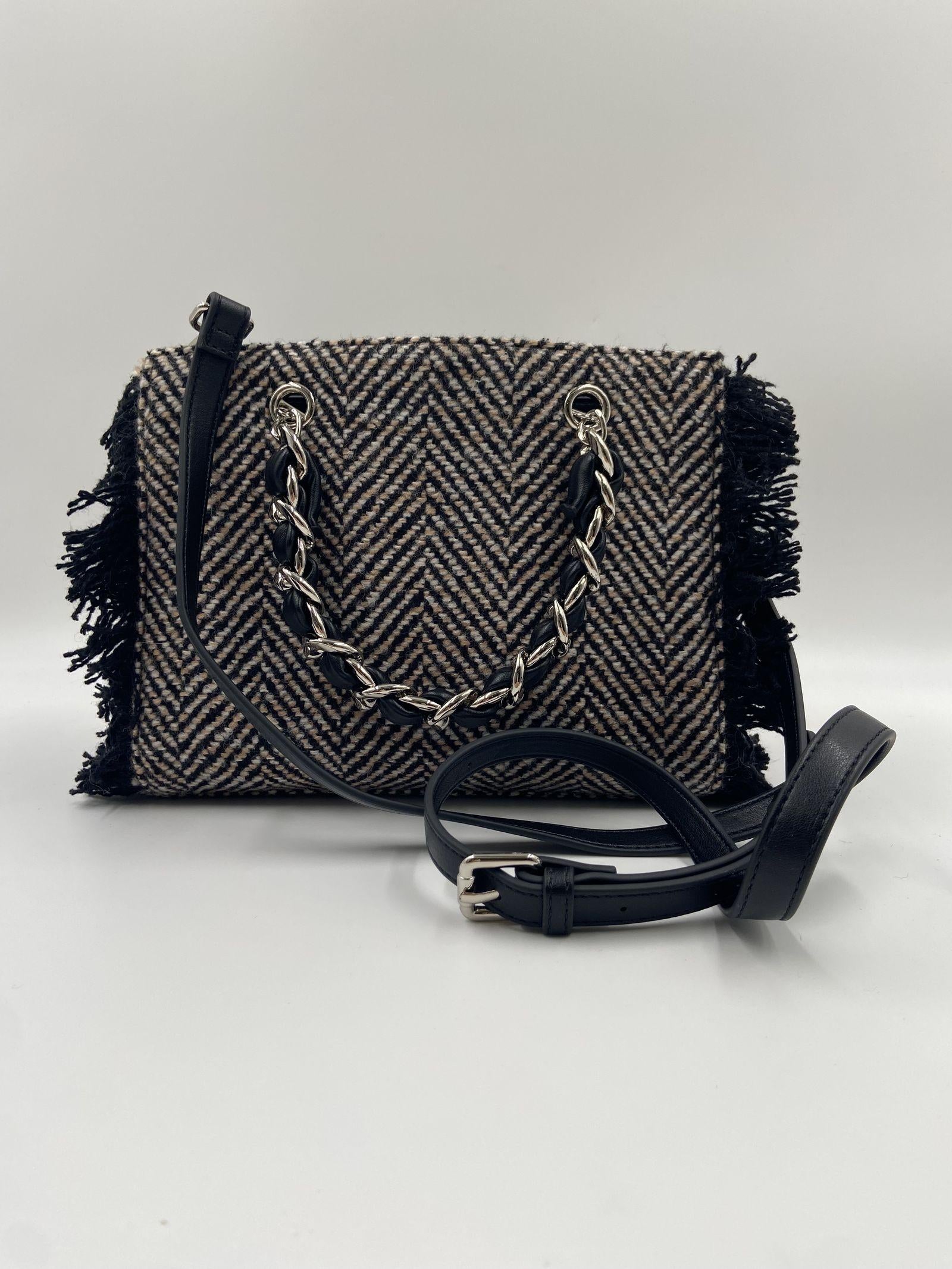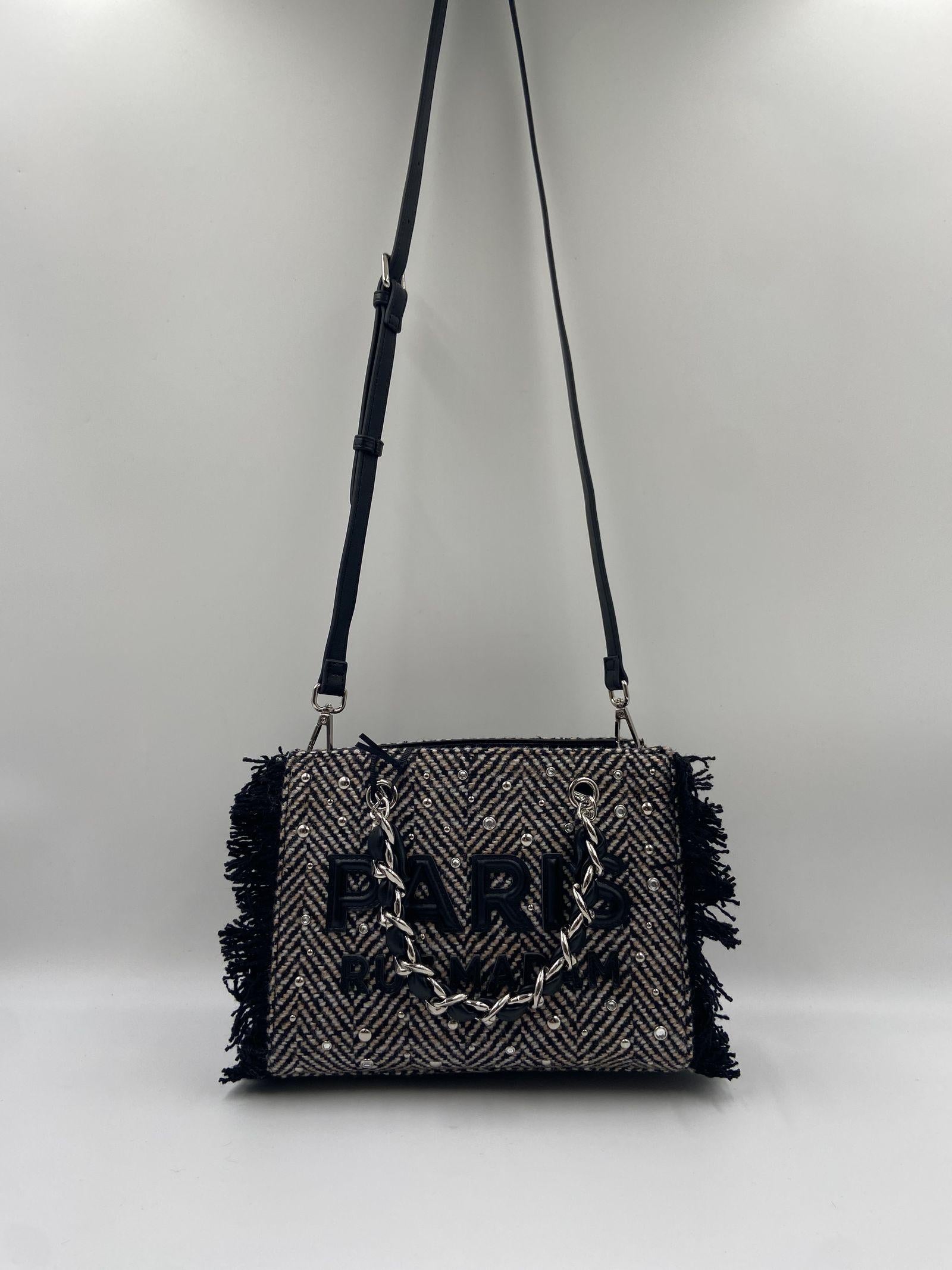 Borsa realizzata in tessuto, caratterizzata da interno foderato colore nero con una tasca interna a parete aperta e una con zip, tracolla regolabile e removibile, due scomparti e uno centrale chiuso con zip colore argento, doppio manico, logo davanti in rilievo, fondo con piedini, chiusura con bottone magnetico. Si distingue per le frange corte posizionate lateralmente e il tessuto esterno impreziosito da applicazioni strass, manici in similpelle colore nero intreciati con catene metalliche colore argento e occhielli argento lucido.Dimensioni: H 19cm x L 23cm x P 9cm