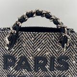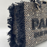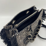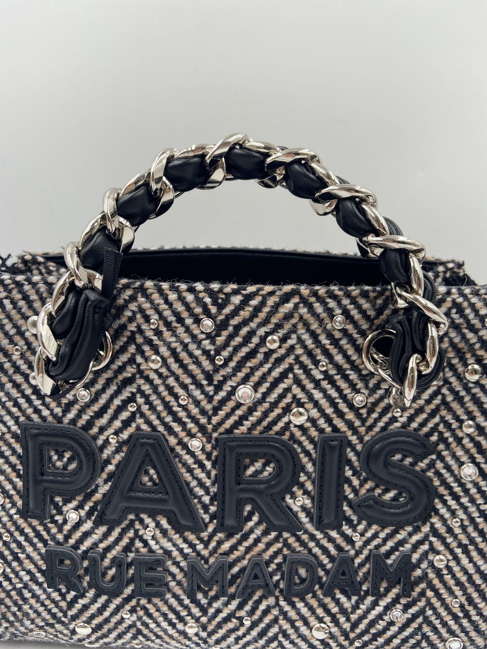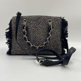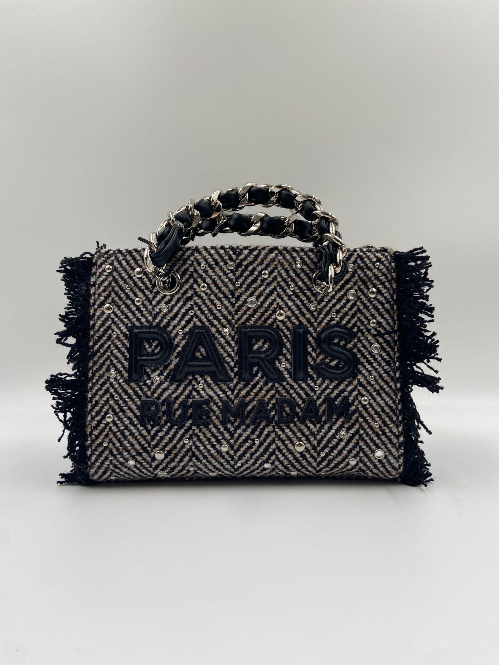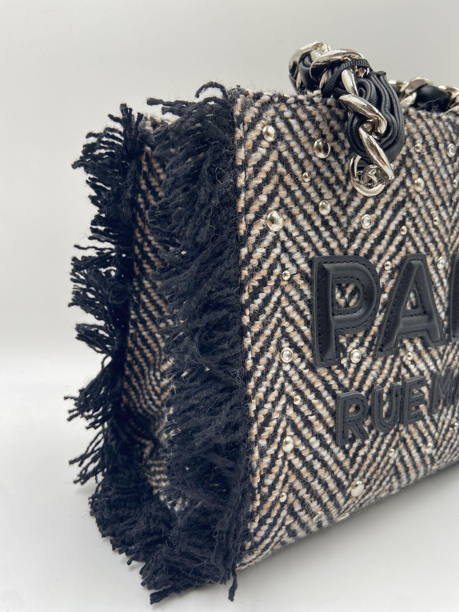 Borsa realizzata in tessuto, caratterizzata da interno foderato colore nero con una tasca interna a parete aperta e una con zip, tracolla regolabile e removibile, due scomparti e uno centrale chiuso con zip colore argento, doppio manico, logo davanti in rilievo, fondo con piedini, chiusura con bottone magnetico. Si distingue per le frange corte posizionate lateralmente e il tessuto esterno impreziosito da applicazioni strass, manici in similpelle colore nero intreciati con catene metalliche colore argento e occhielli argento lucido.Dimensioni: H 19cm x L 23cm x P 9cm