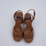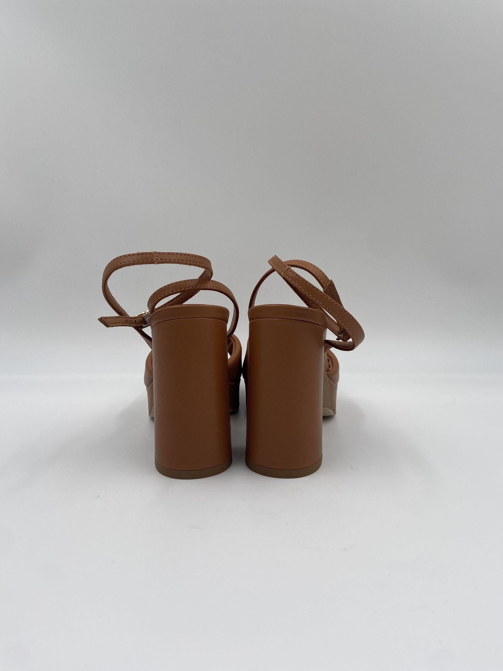 Sandalo con tomaia aperta dalla forma squadrata con sottopiede imbottito e tallone chiuso con cinturino fissato con fibbia alla caviglia, tacco alto e largo 10 cm e un plateau di 3 cm.