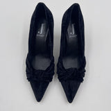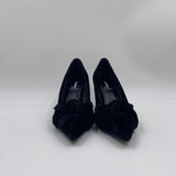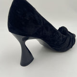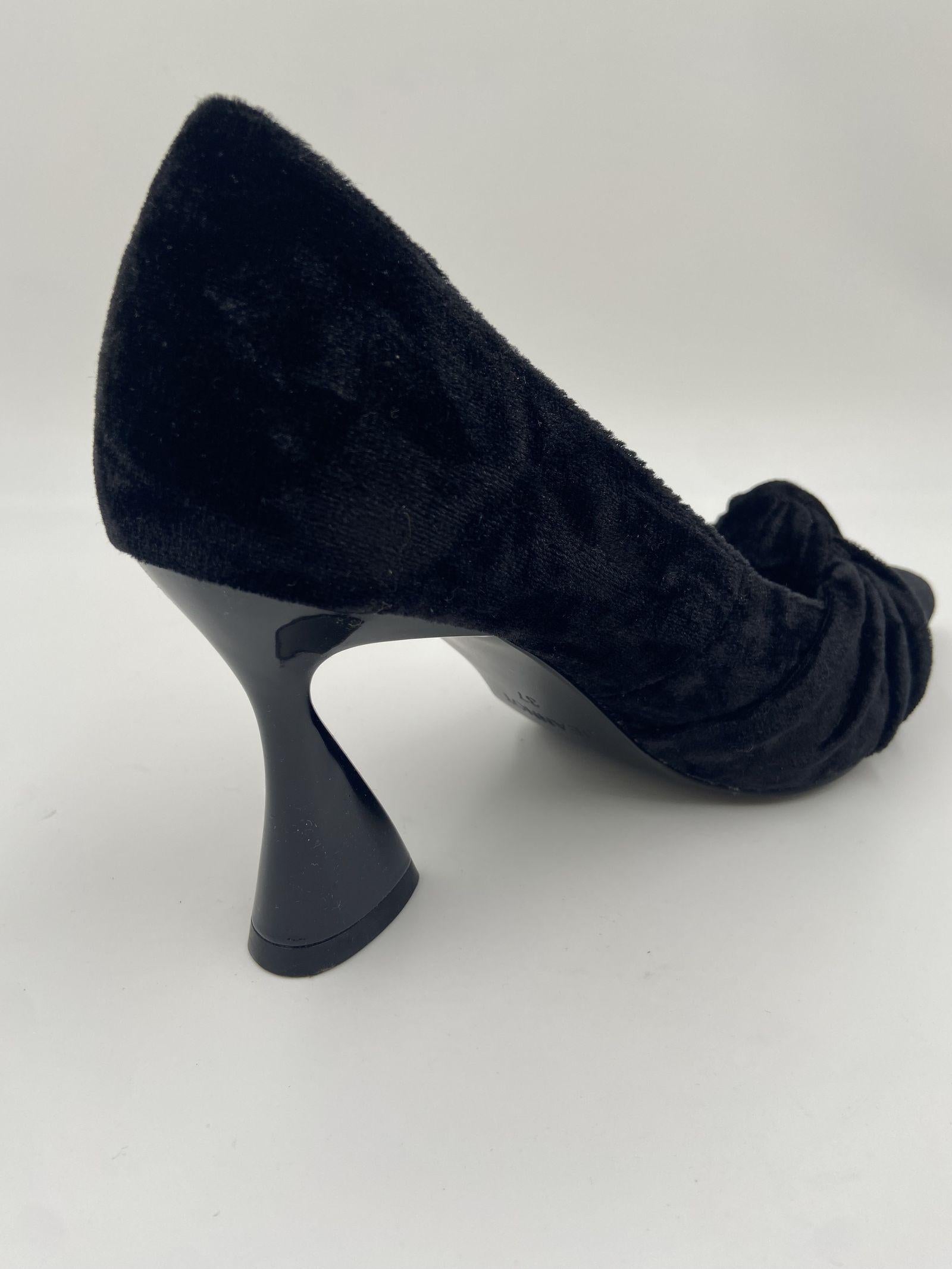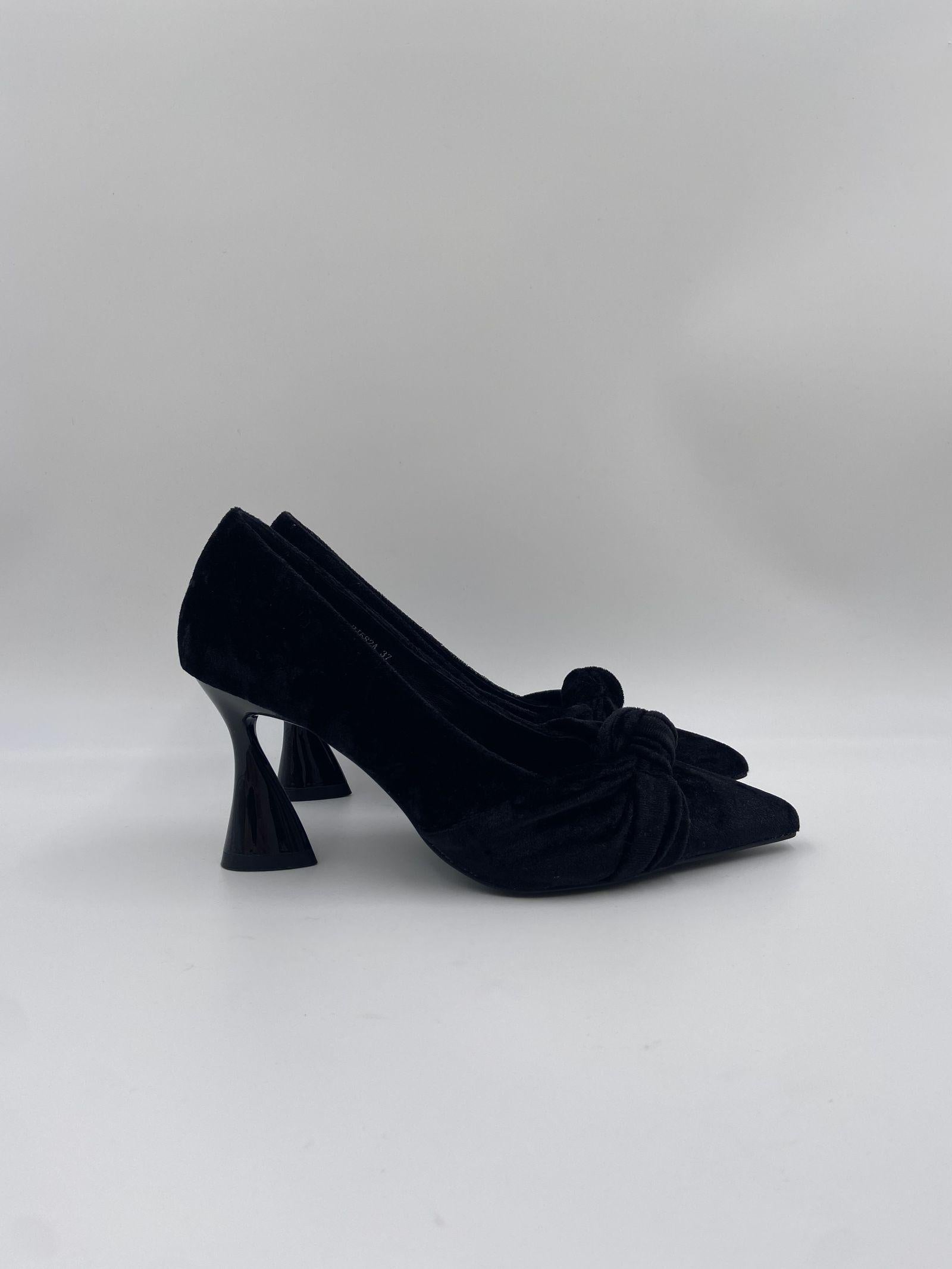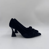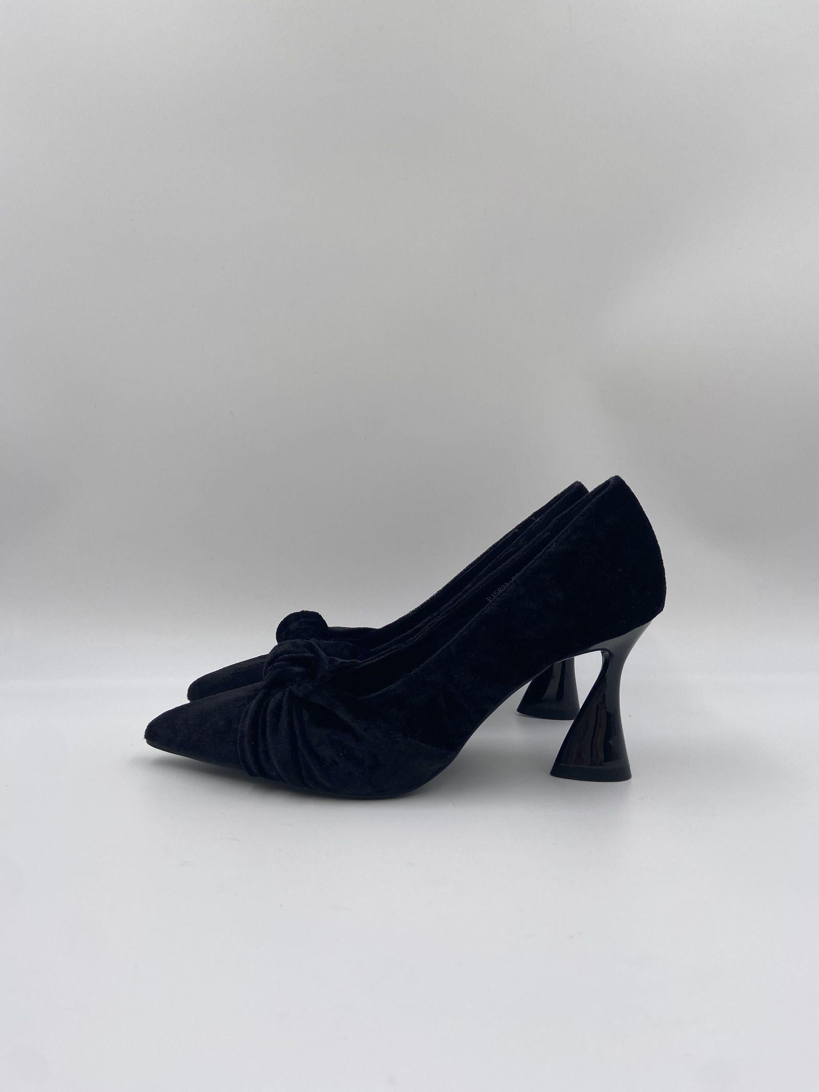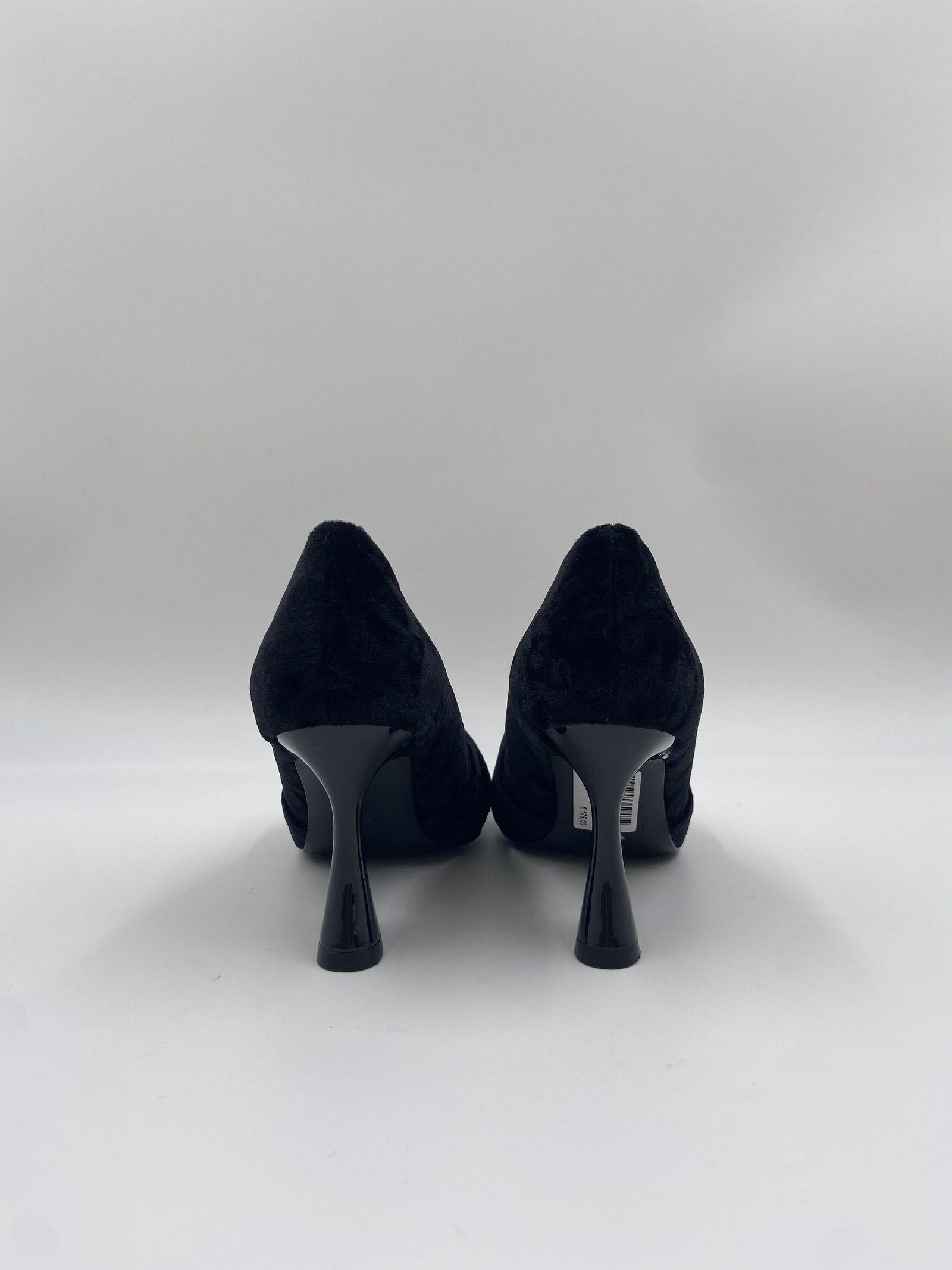 Sandalo realizzato in velluto, caratterizzato da una punta con motivo fiocco a incrocio, fodera e sottopiede in pelle, tacco a rocchetto in tinta laccata e alto 7.5 cm, suola in gomma.