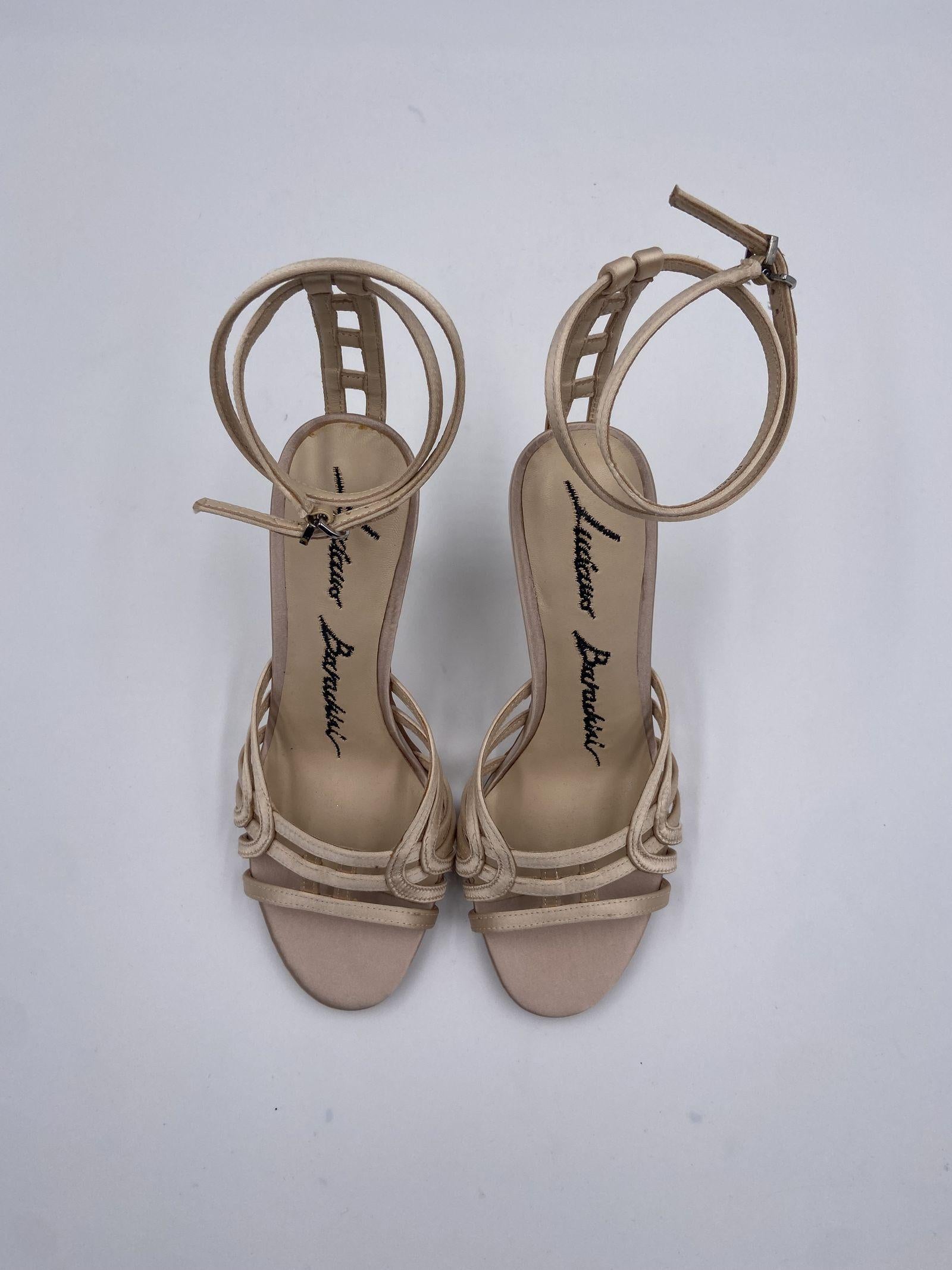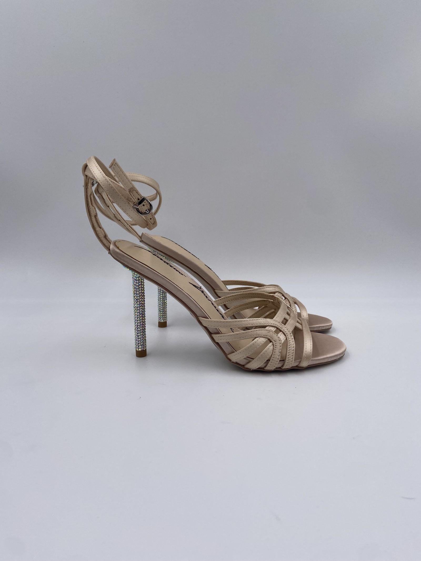 Sandalo alto realizzato in raso satinato,caratterizzato da fasce anteriori sovrapposte, colore tono su tono, chiusura con cinturino incrociato alla caviglia regolabile con fibbietta in metallo, tacco a spillo impreziosito da strass applicati, suola in gomma, altezza tacco 10 cm.