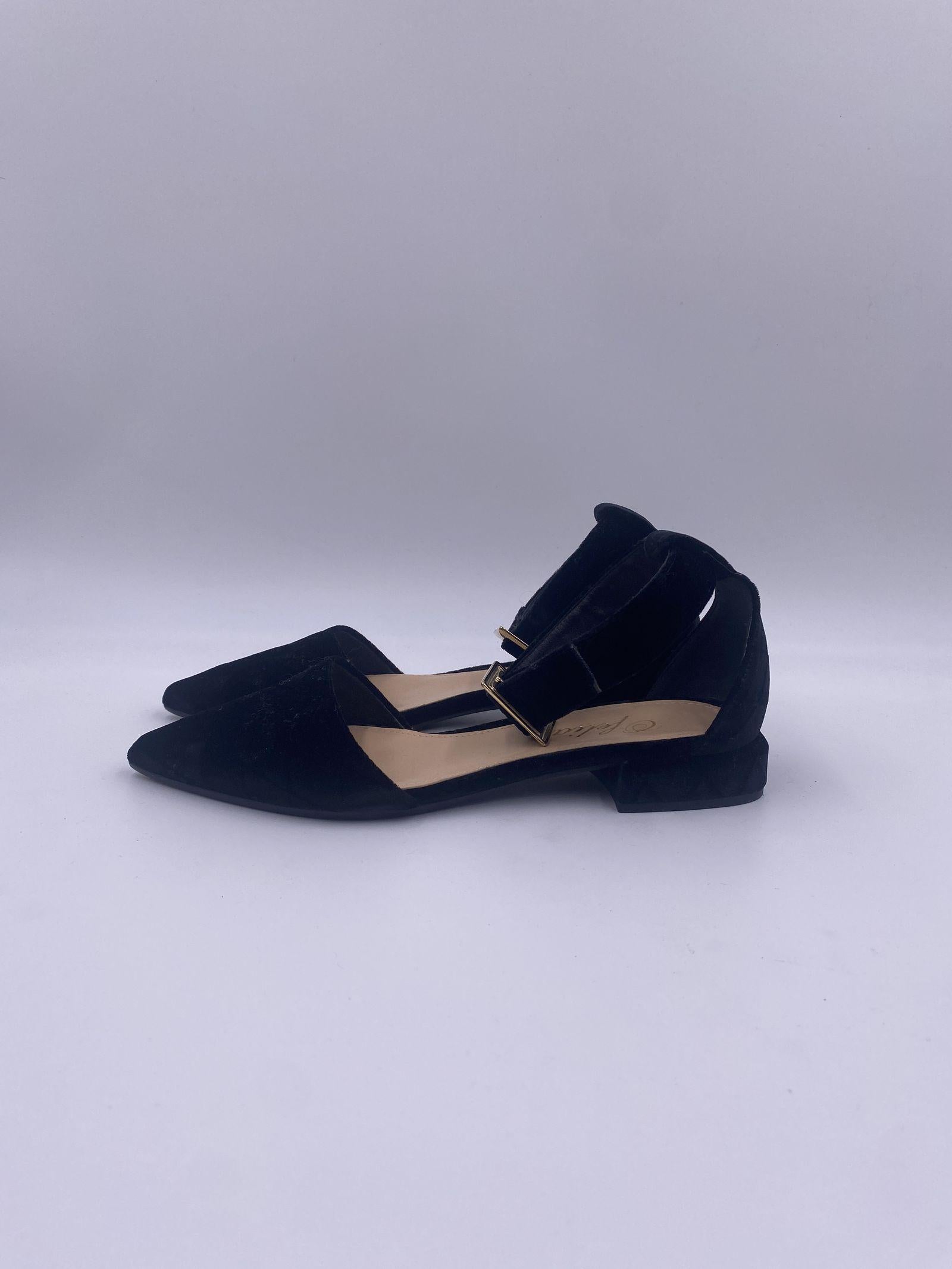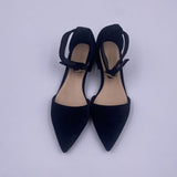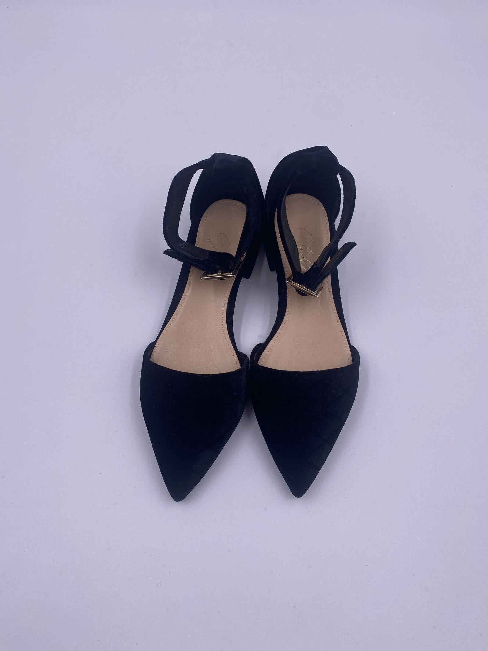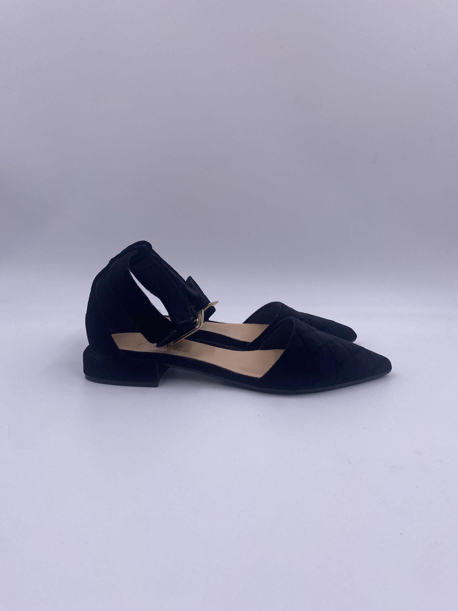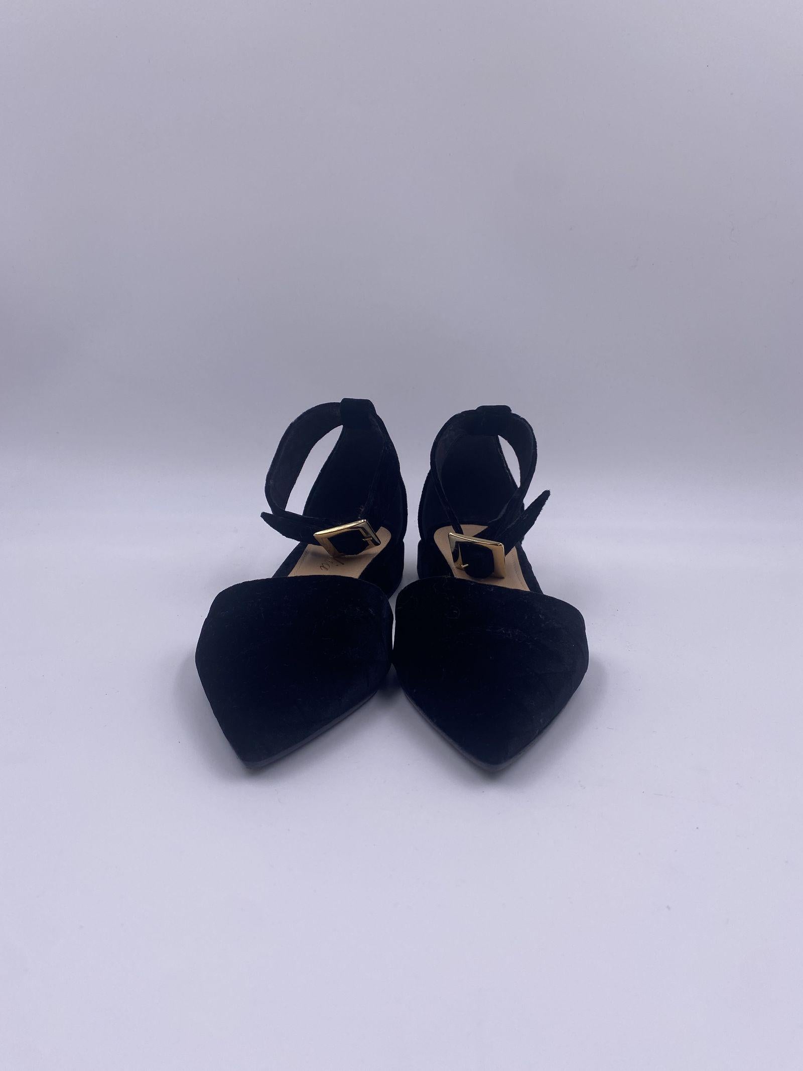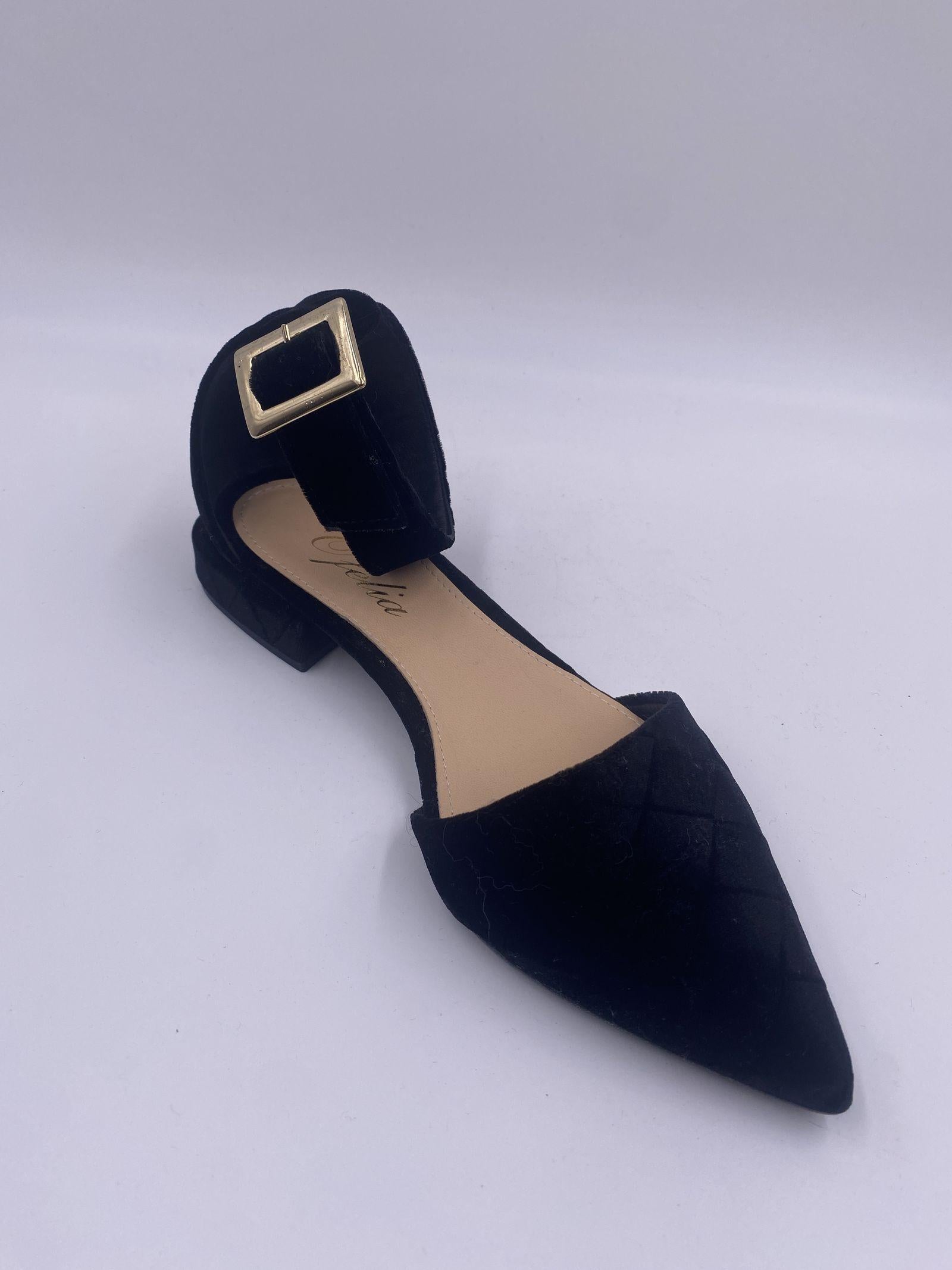Sandalo realizzato in velluto nero, caratterizzato da punta chiusa affusolata, tallone chiuso e cinturino alla caviglia con fibbia color oro, tacco basso 2 cm rivestito, suola in cuoio.