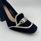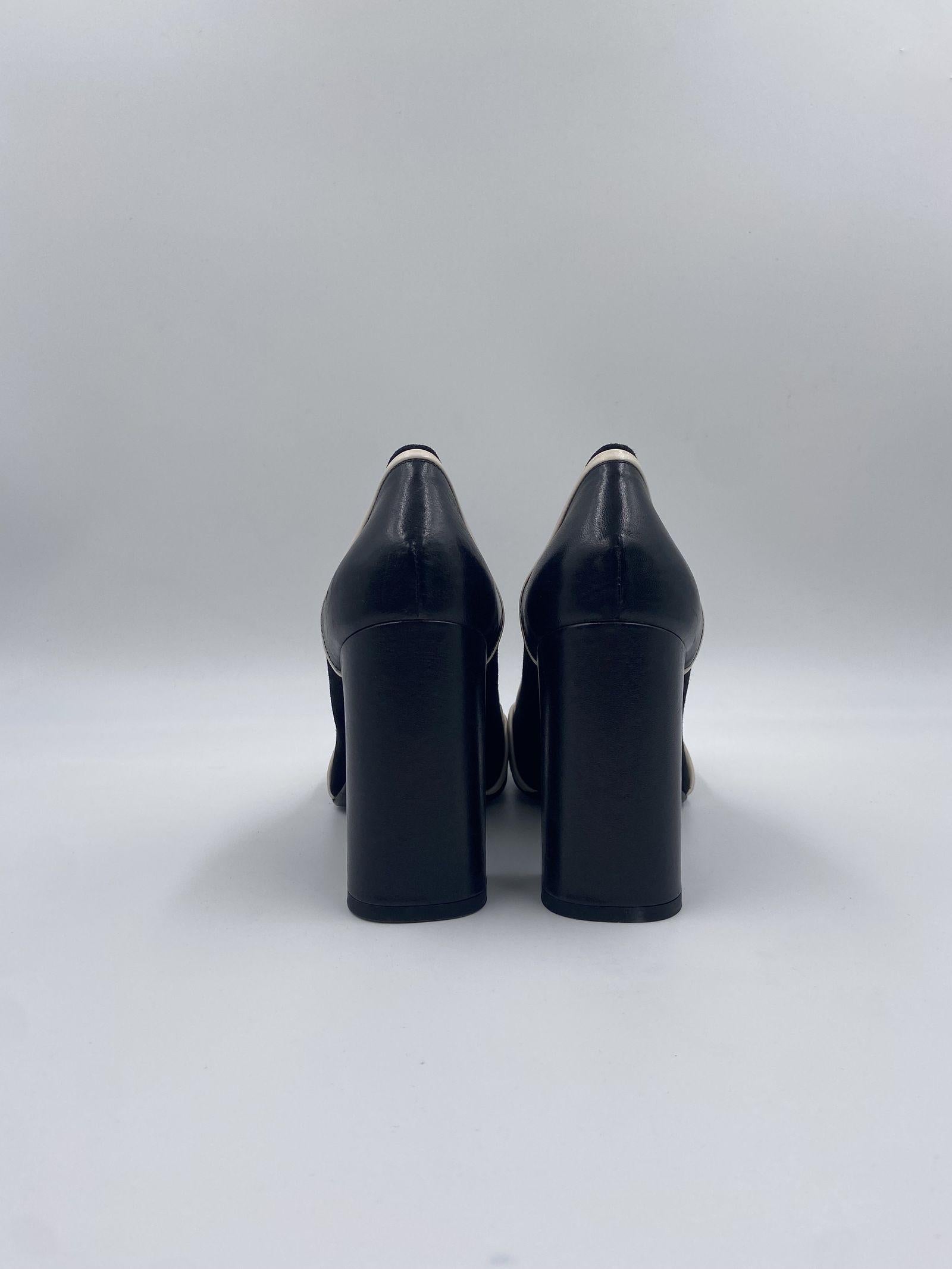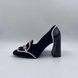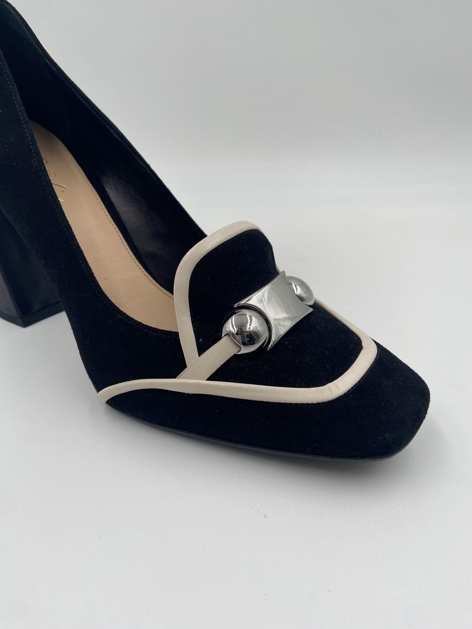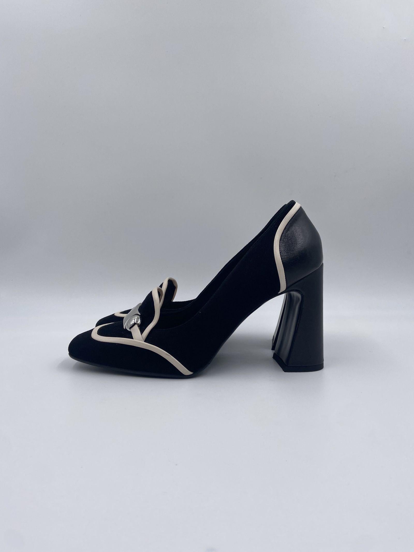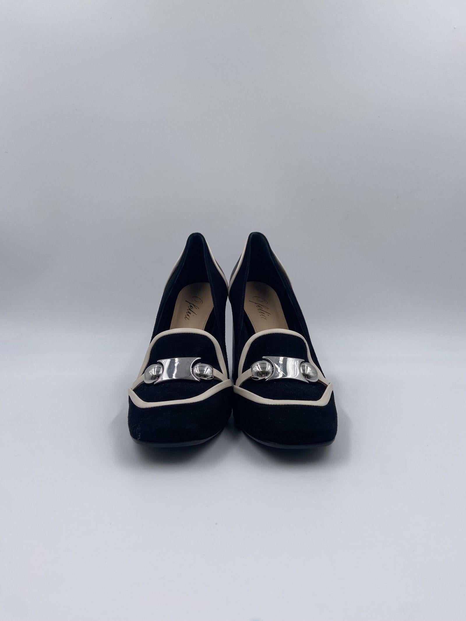 Dècolletè doppio materiale, davanti in pelle scamosciata con insenature color crema e sulla punta arricchito con una placchetta metallica, dietro sul tallone e tutta la lunghezza del tacco in pelle lucida. Ha suola in cuoio e tacco leggermente largo, alto 10 cm.