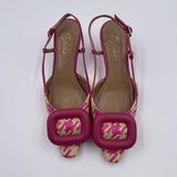 Sandalo basso dalla punta affusolata chiusa, realizzato in raffia intreciata, davanti con un accessorio in legno quadrato, chiusura alla caviglia con cinturino e fibbia, tacco basso a rocchetto, altezza 3 cm, suola in cuoio.