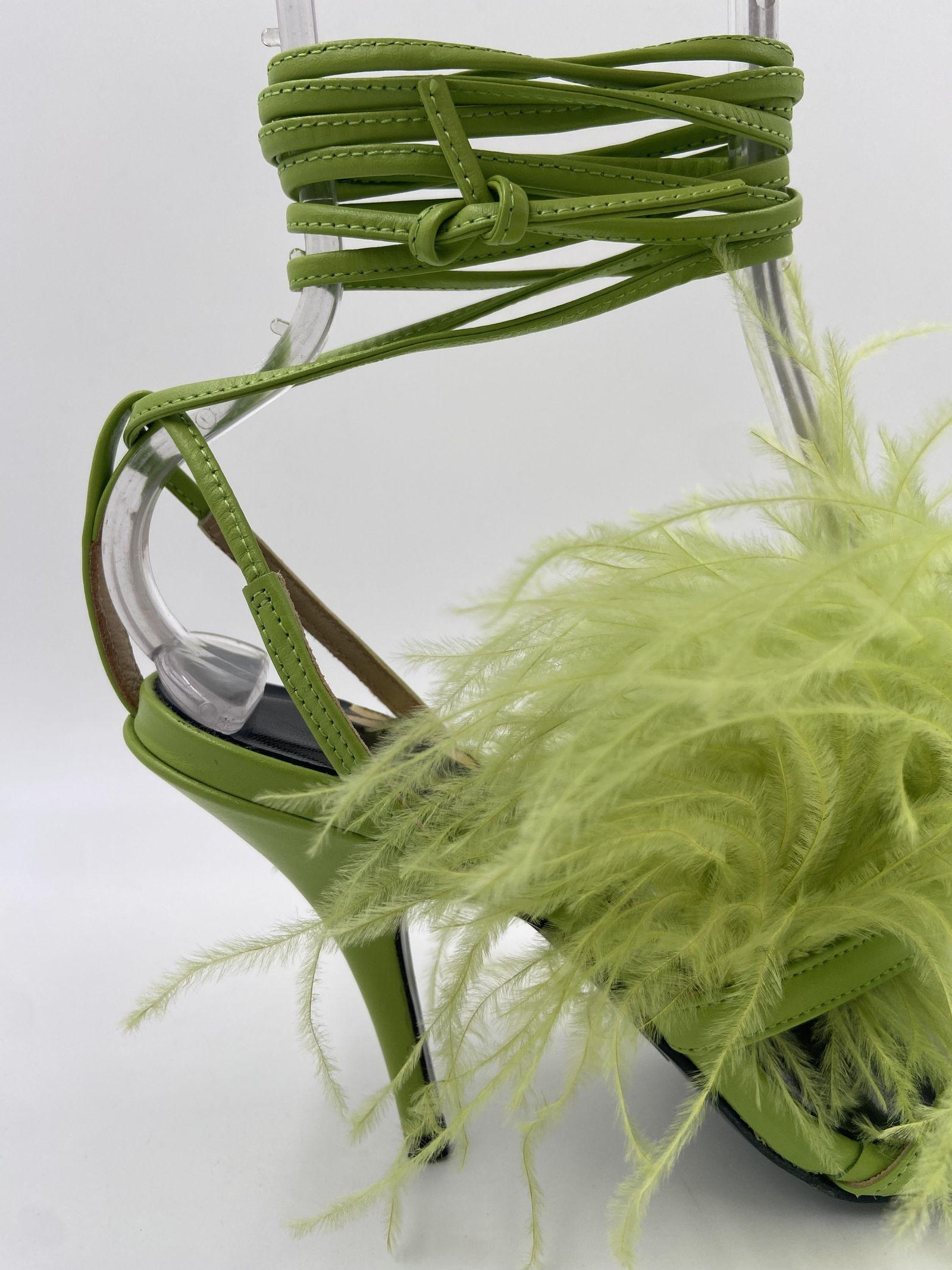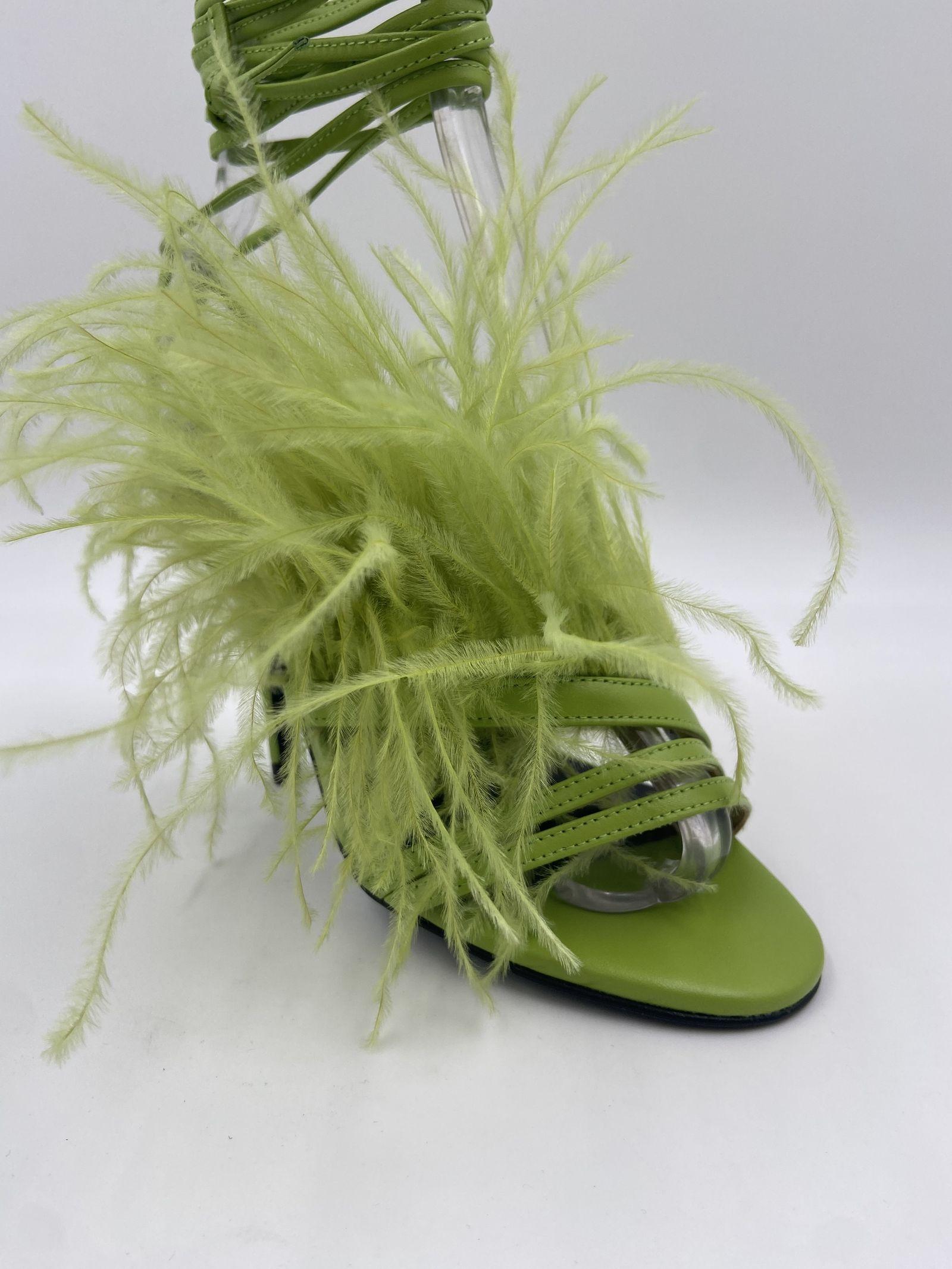 Sandalo in pelle di vitello liscia, dalla punta tonda, caratterizzato da listini sottili sulle dita, arricchiti con applicazioni piume tono su tono, tacco a stiletto e cinturini da annodare alla caviglia, fodera in pelle, altezza tacco 10 cm.