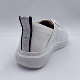 Wembley è la scarpa che rappresenta l'equilibrio tra comodità, stile e sobrietà, in questa variante bianca con occhielli argento. Realizzata in pelle, con logo sul lato e retro, una suola alta 40 mm, e una soletta interna removibile alta 10 mm.