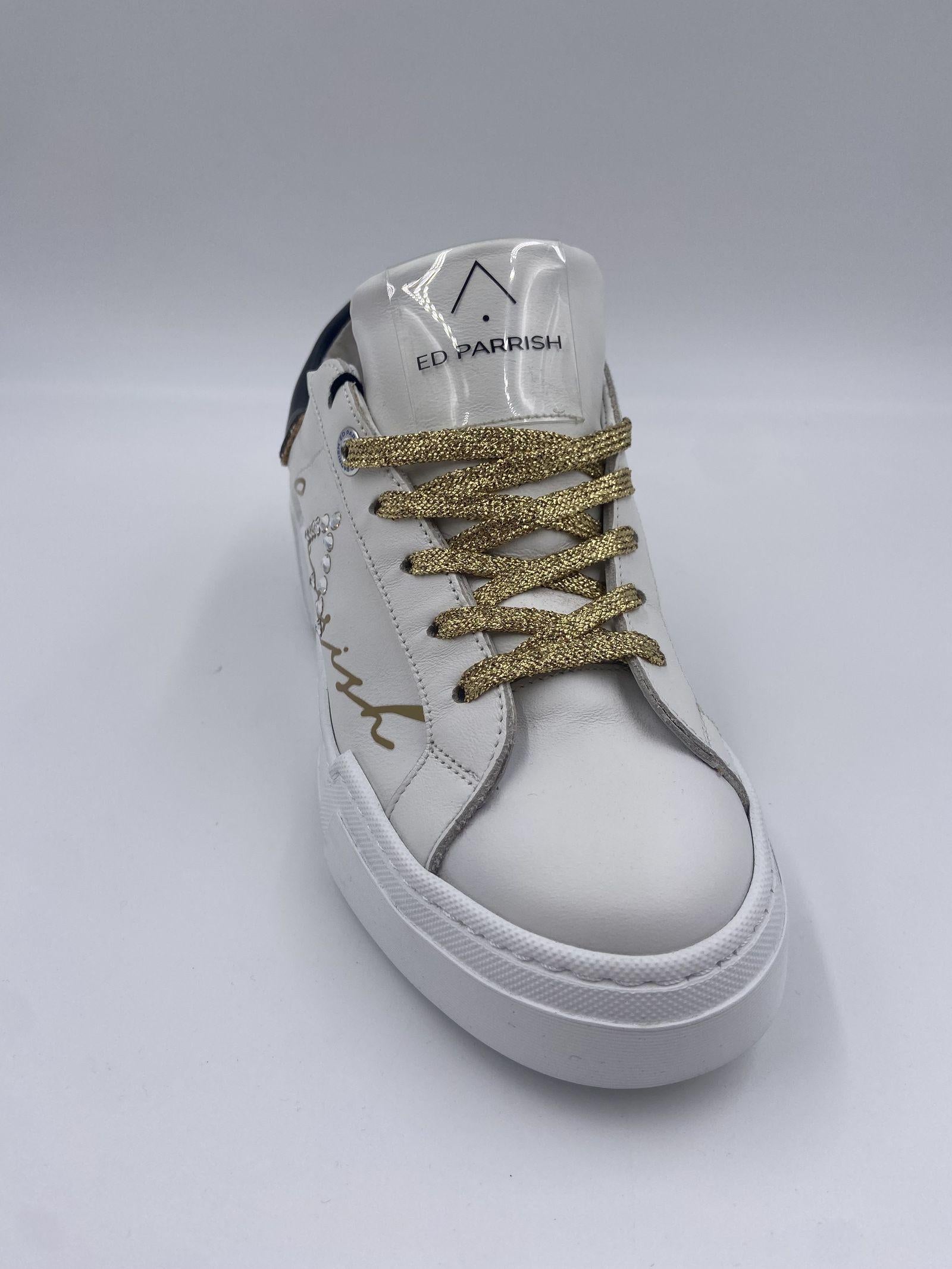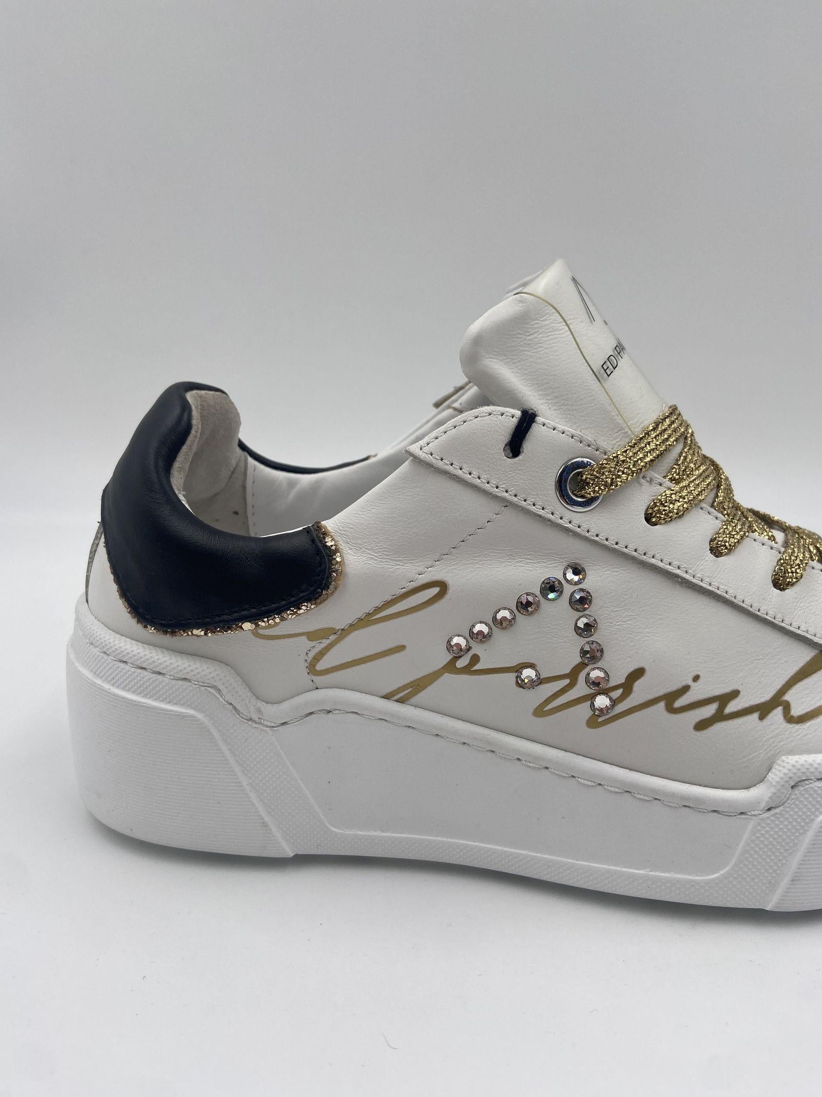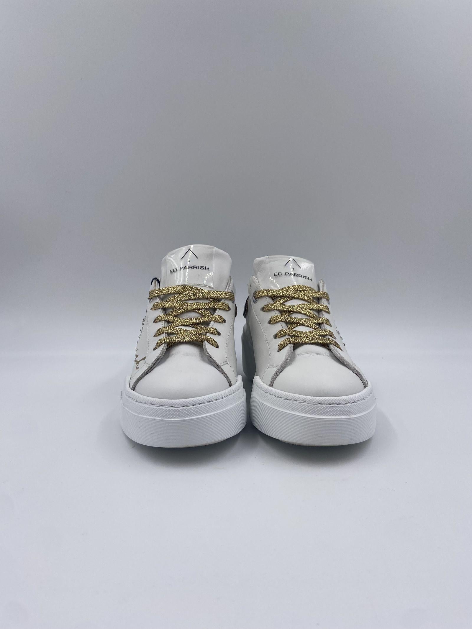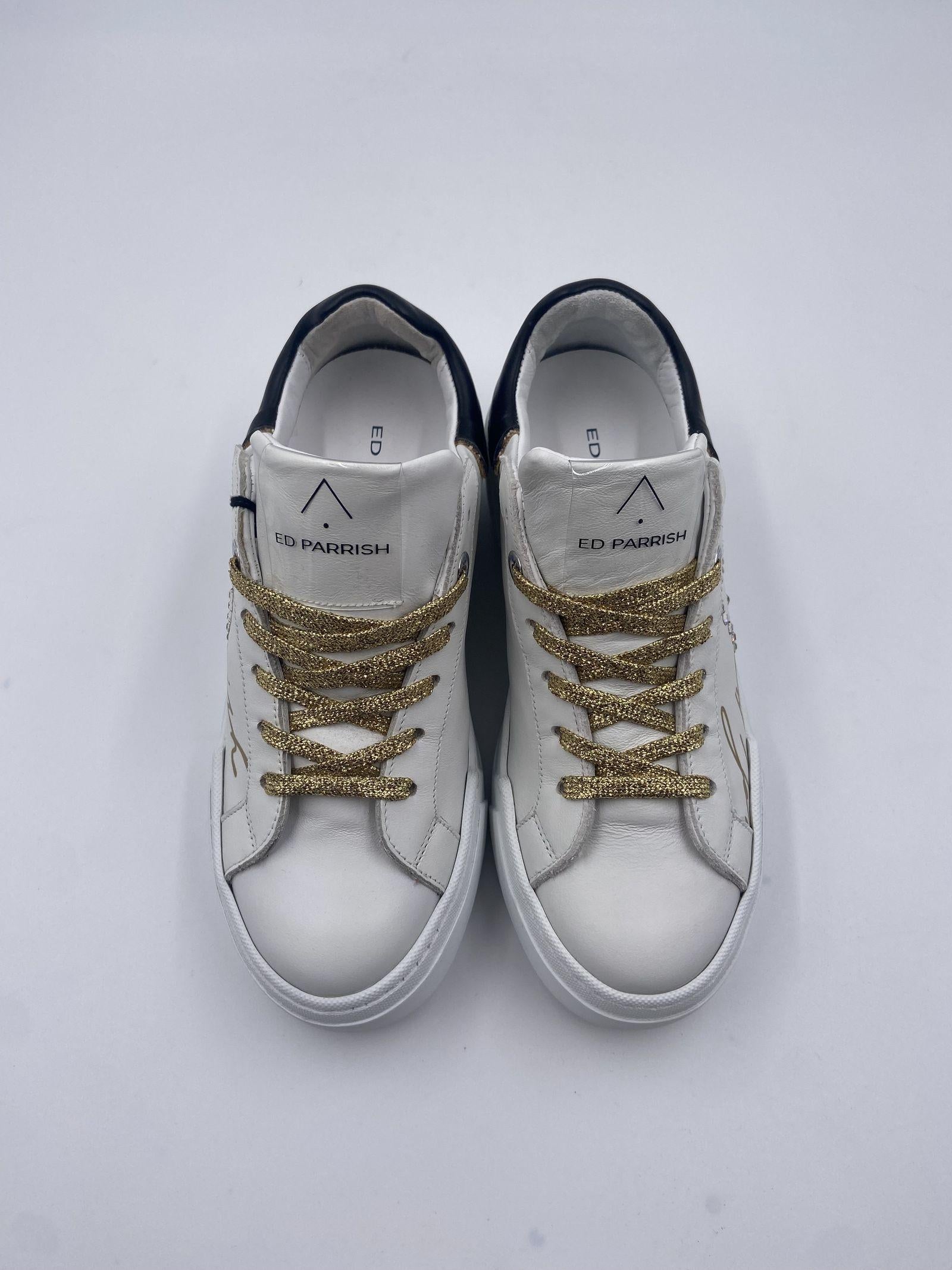 Sneaker realizzata in pelle bianca, con spoiler nero, con suola oversize bianca, logo ED PARRISH scritto per esteso in colore oro sul lato, laccio in cotone colore oro, fodera in pelle e tessuto, sottopiede in pelle, suoletta interna morbida ed estraibile, suola in gomma extralight, altezza tacco 60, platform 30 battuta 30.