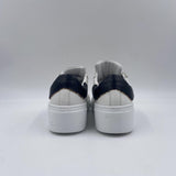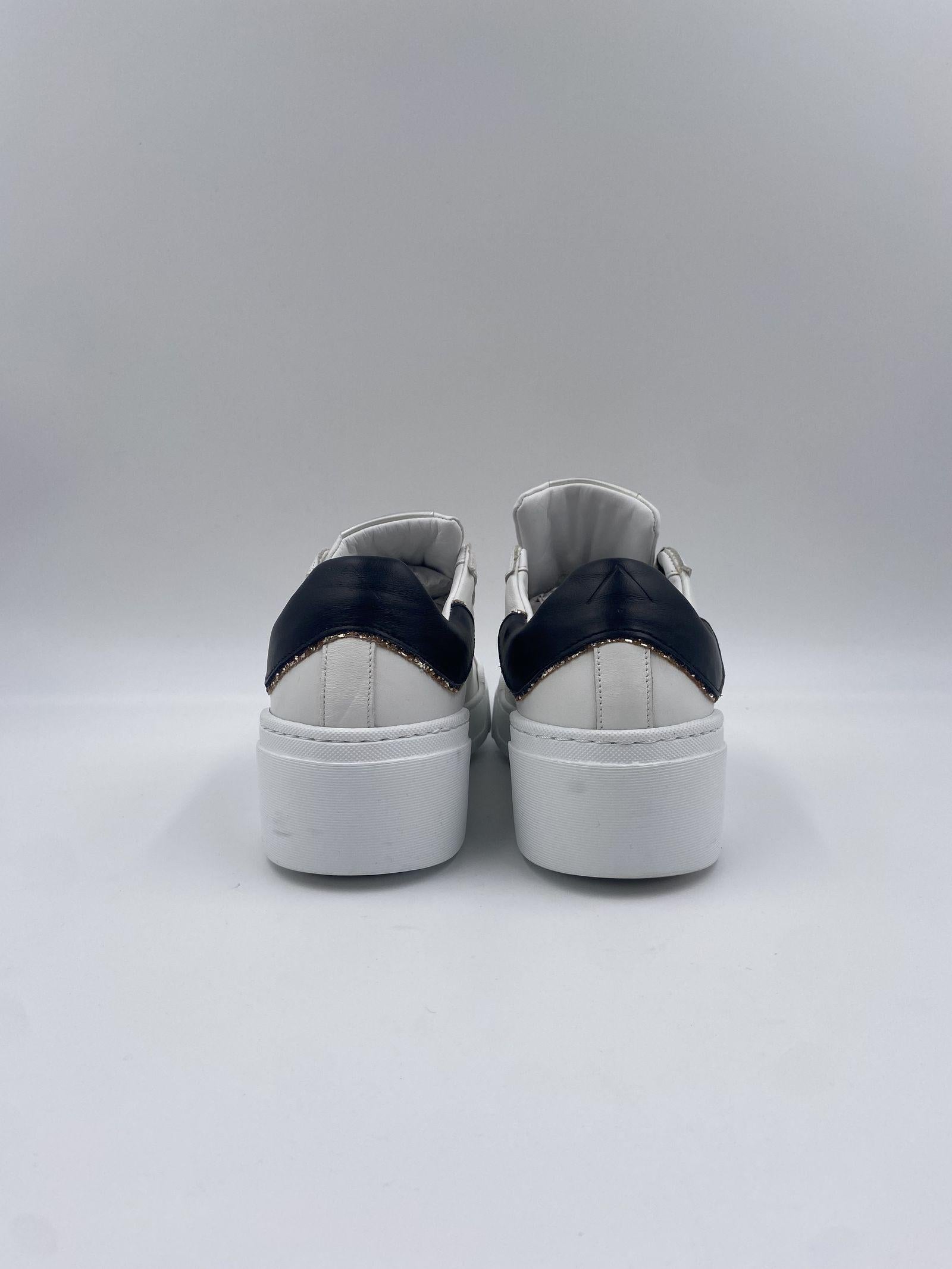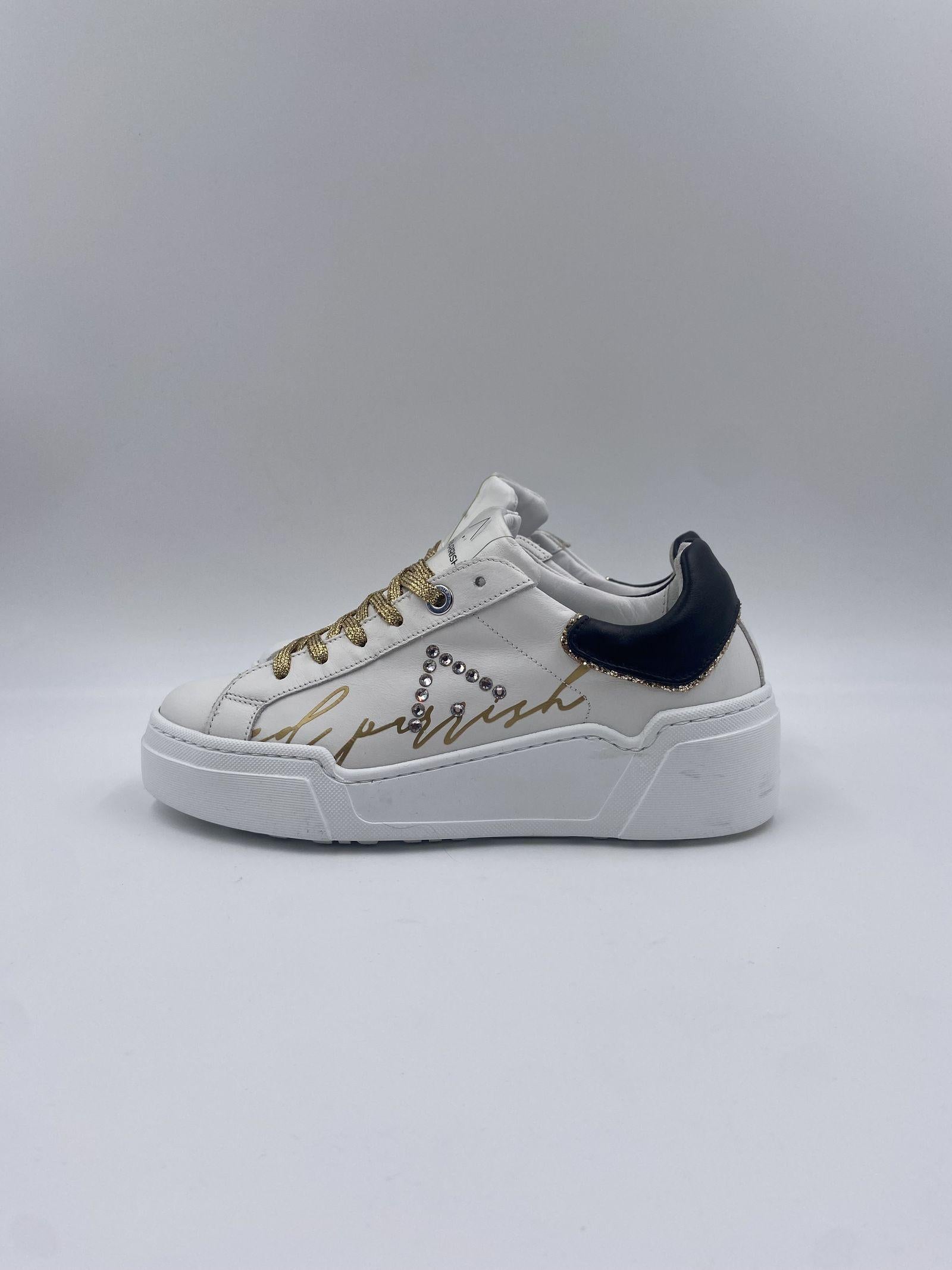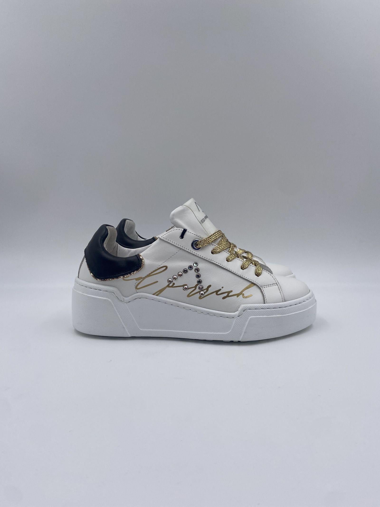 Sneaker realizzata in pelle bianca, con spoiler nero, con suola oversize bianca, logo ED PARRISH scritto per esteso in colore oro sul lato, laccio in cotone colore oro, fodera in pelle e tessuto, sottopiede in pelle, suoletta interna morbida ed estraibile, suola in gomma extralight, altezza tacco 60, platform 30 battuta 30.