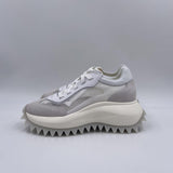 Sneakers running Vic Matiè realizzata in crosta di vitello, pelle e rete trasparente adornata da cuciture zig zag a contrasto, una suola monoblocco extralight, logata con riporto in gomma e battistrada con maxi spikes, e un plantare anatomico rivestito in puro cotone.