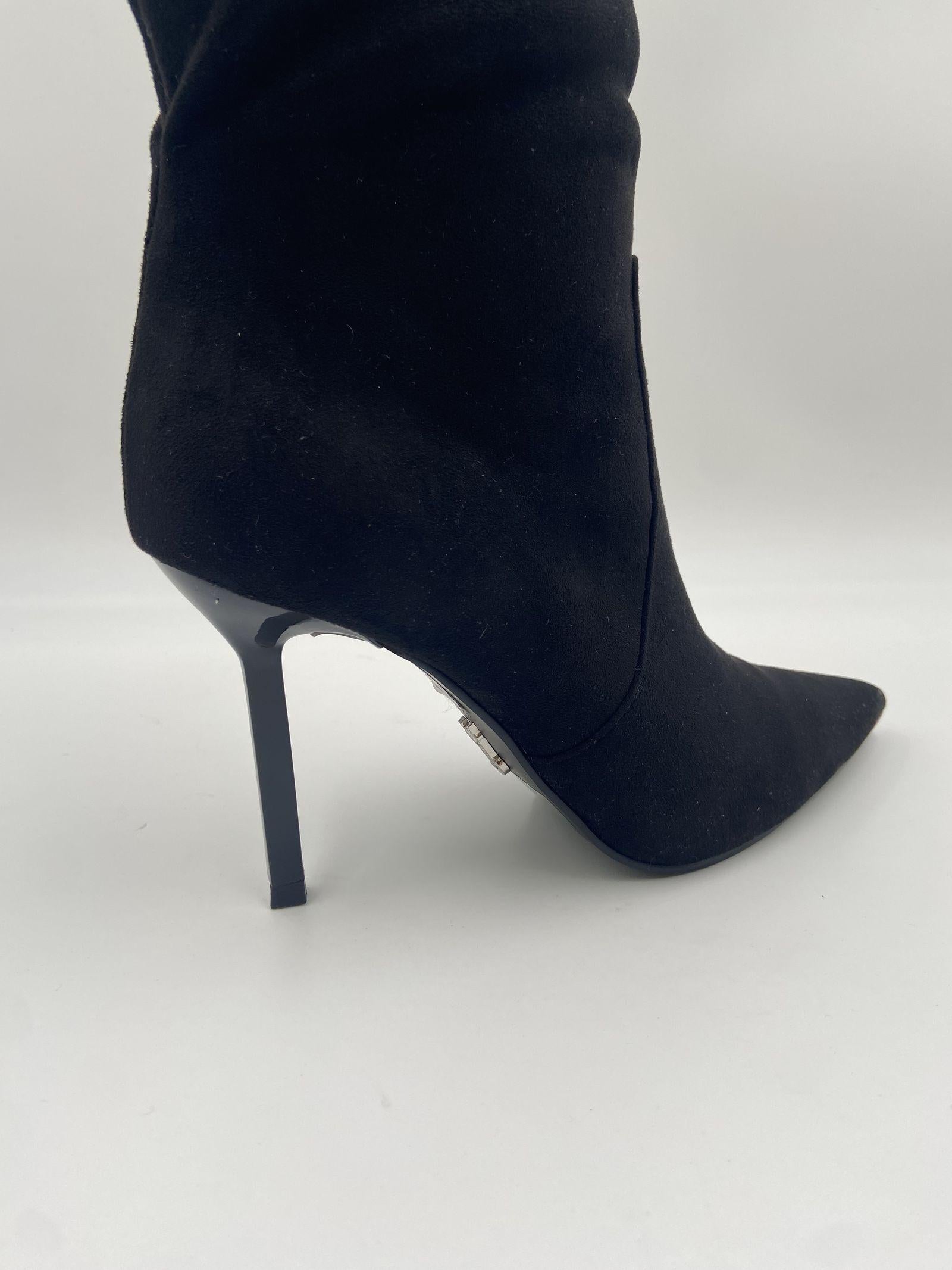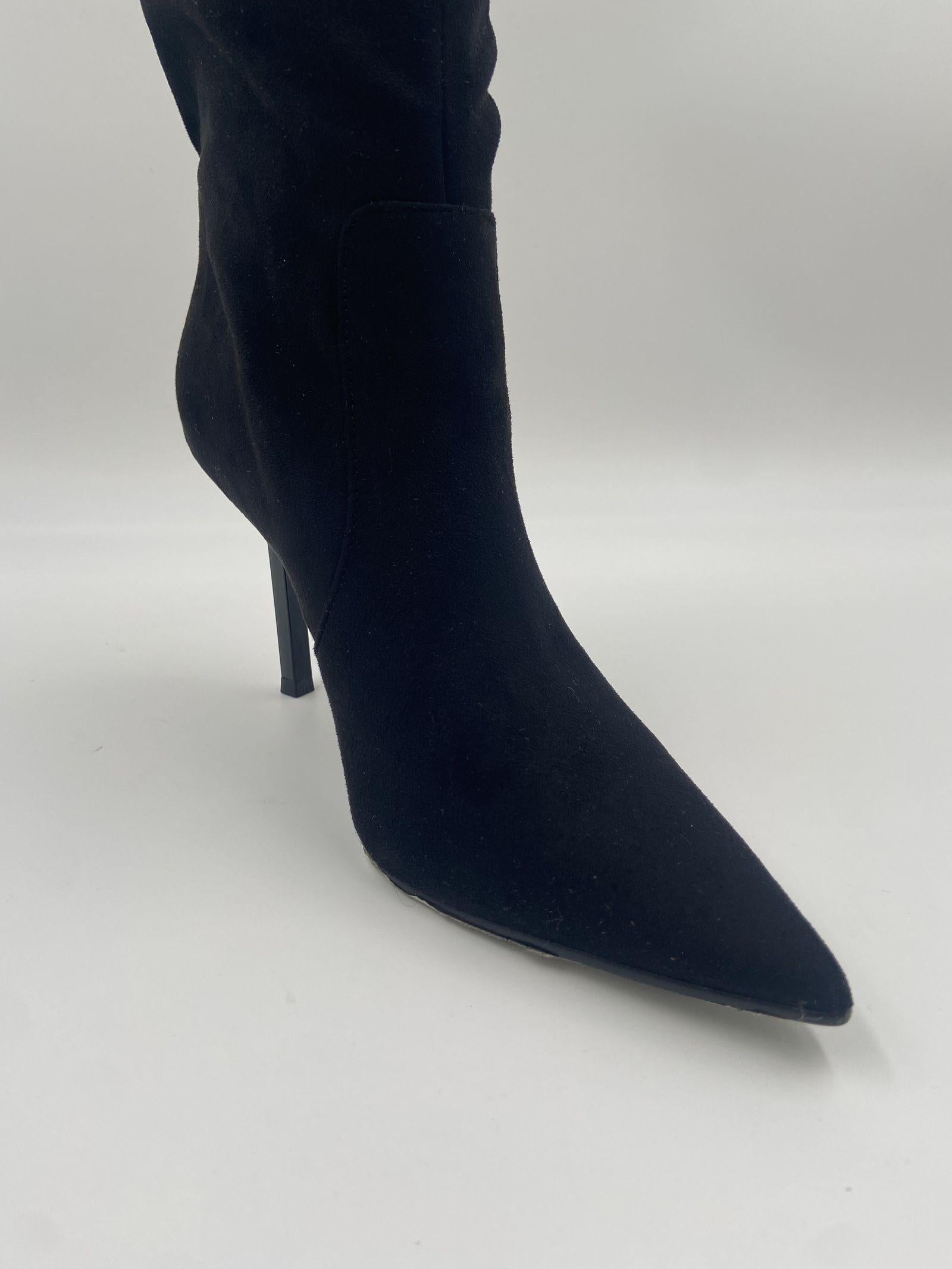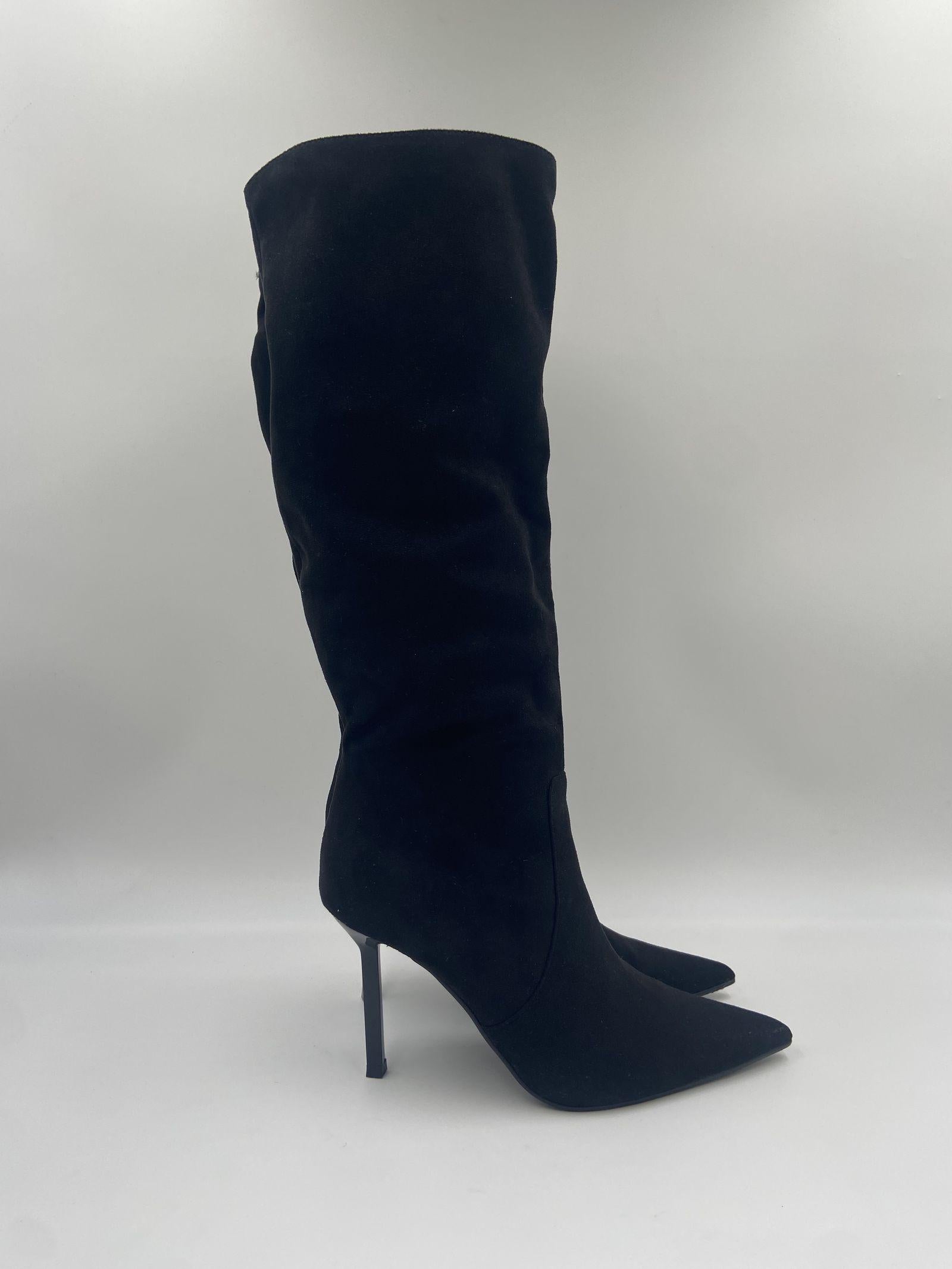 Stivale alto al ginocchio, realizzato in pelle scamosciata elasticizzata, a punta, tacco a stiletto e suola in gomma, interno in tessuto.