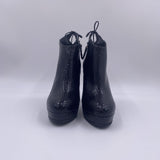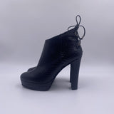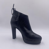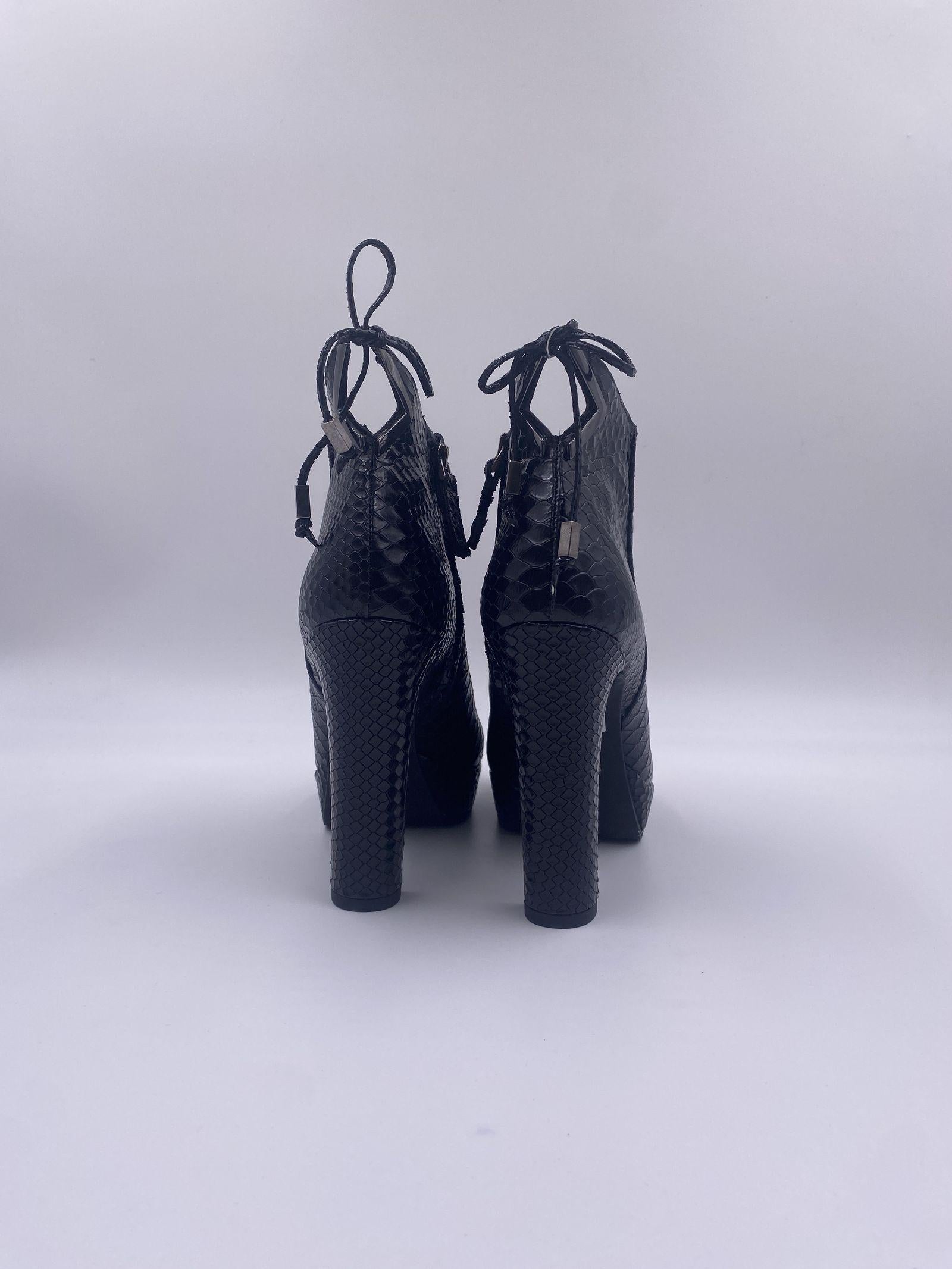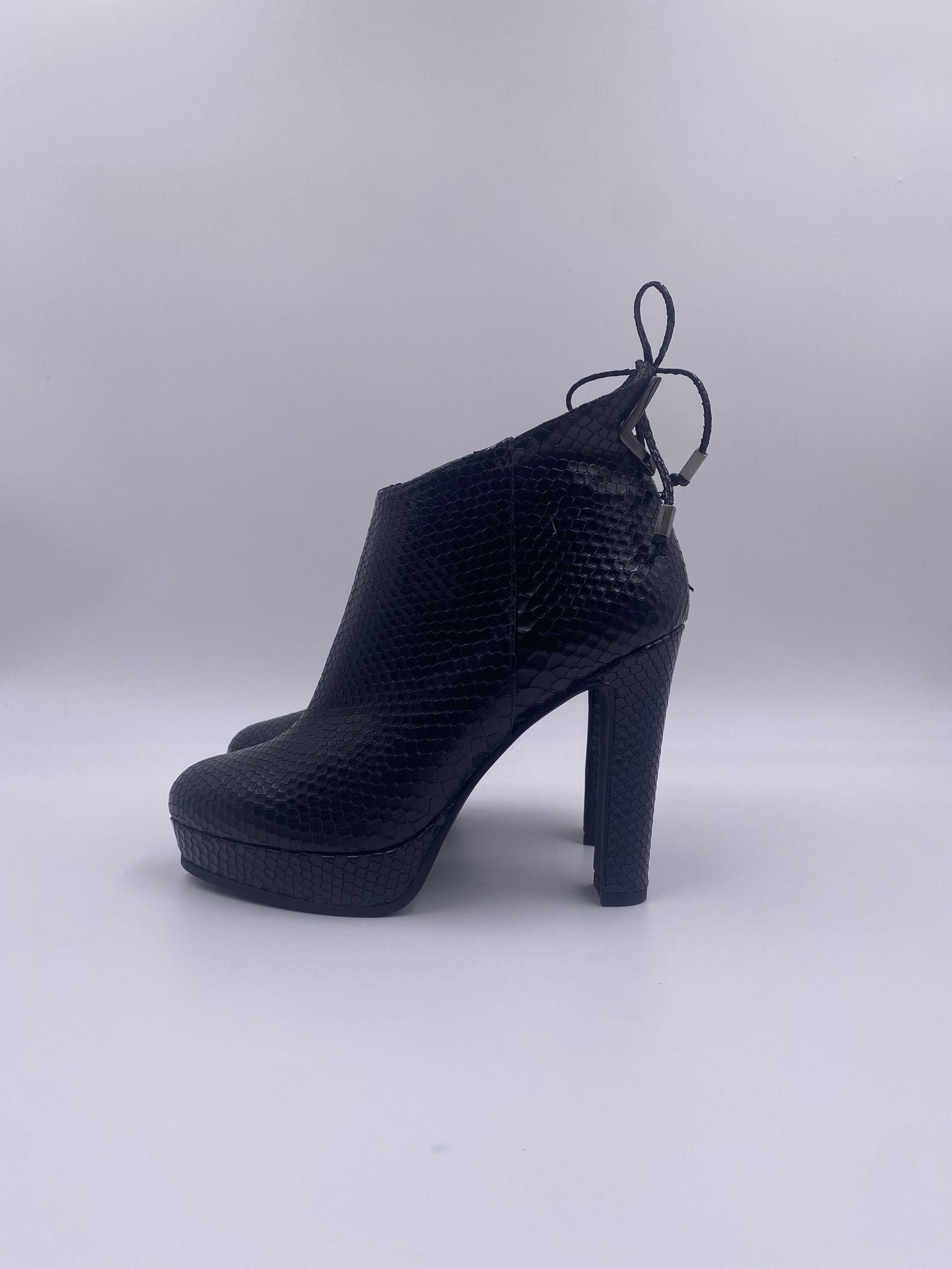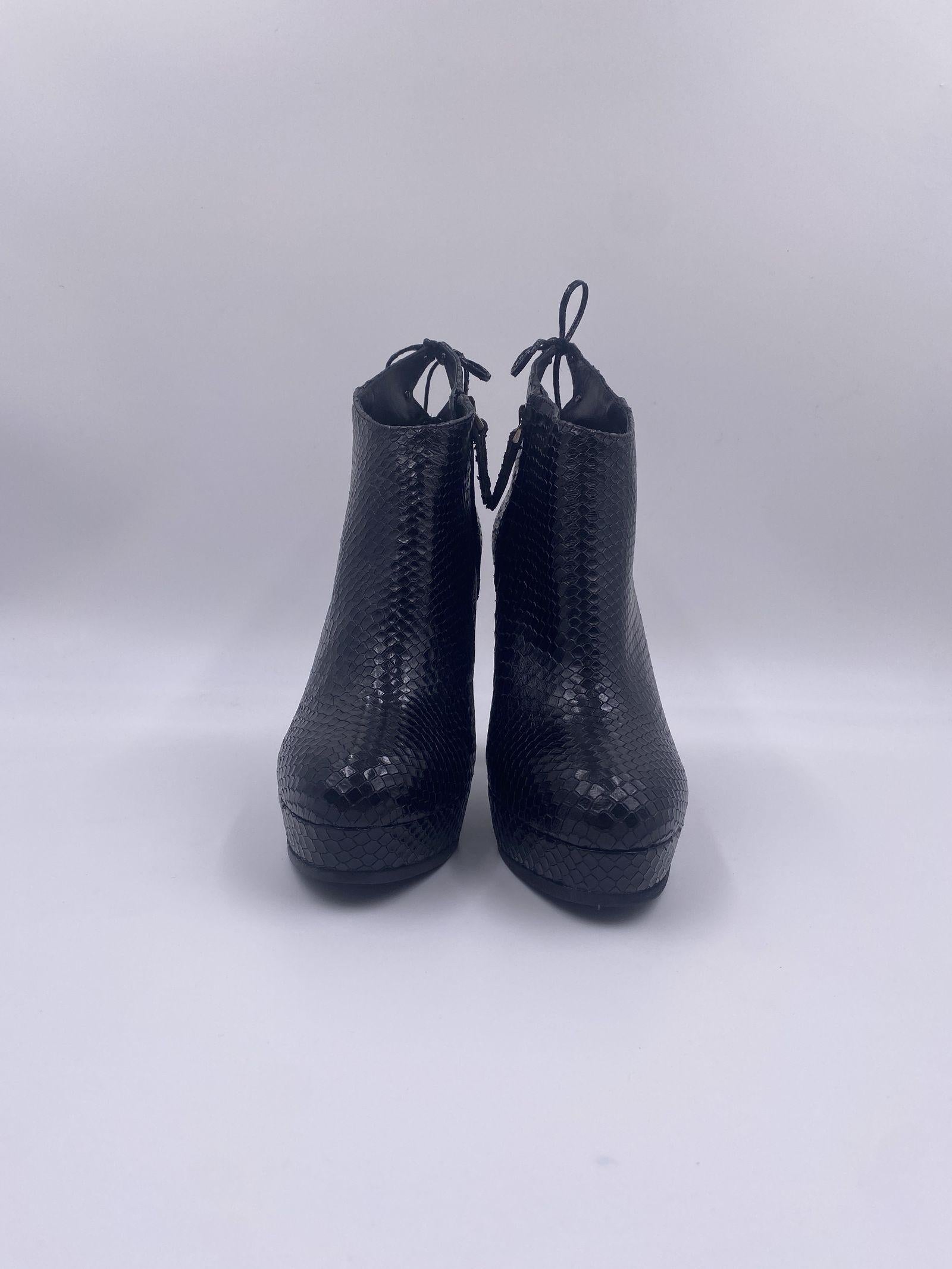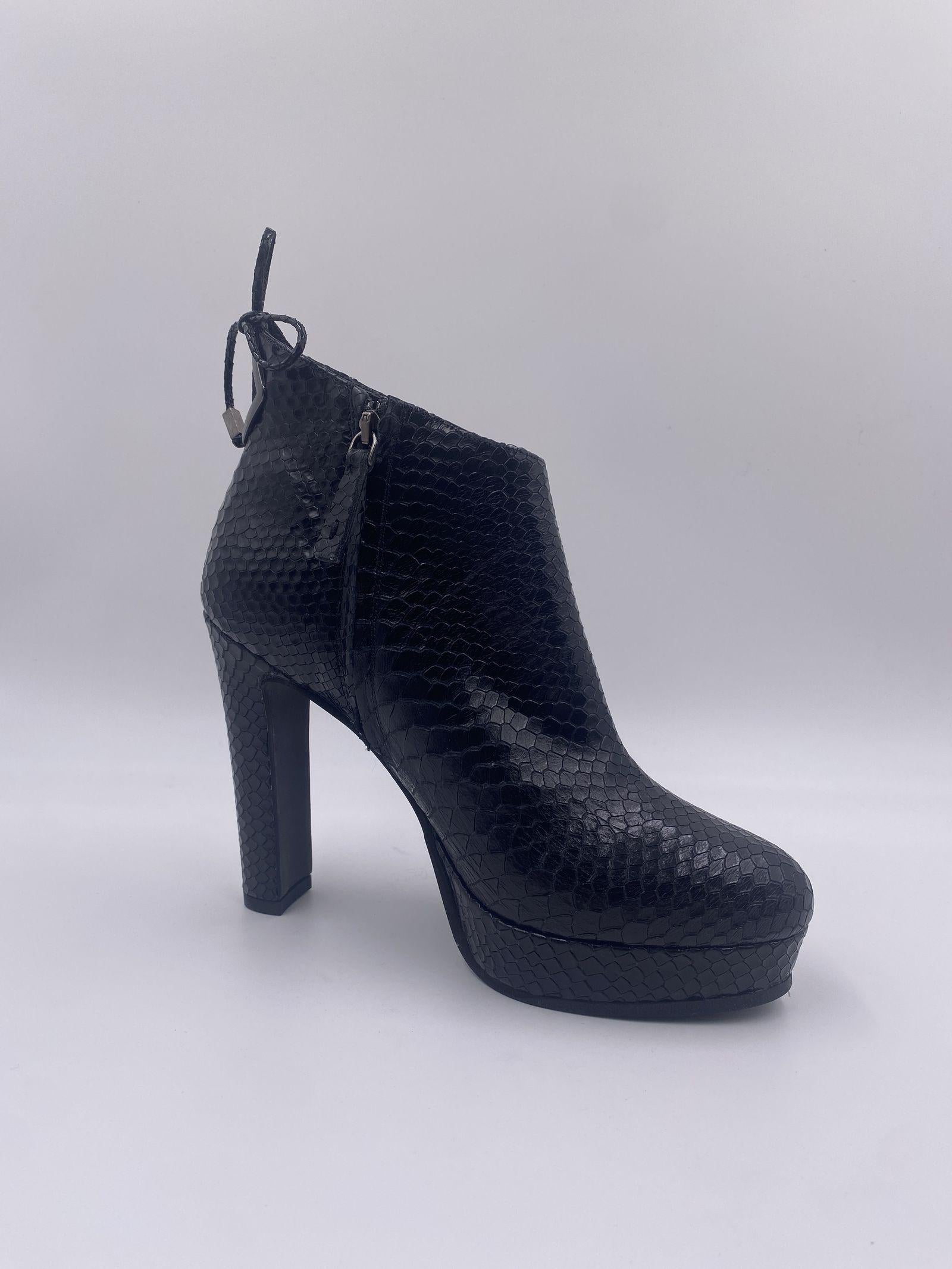 Tronchetto in nappa con lavorazione pitonata, a punta tonda, caratterizzato da chiusura laterale con cerniera, plateau alto 3 cm, tacco a stiletto leggermente largo, suola in cuoio nera. Dietro il tallone arricchito da un laccio annodato e placchetta geometrica metallica.