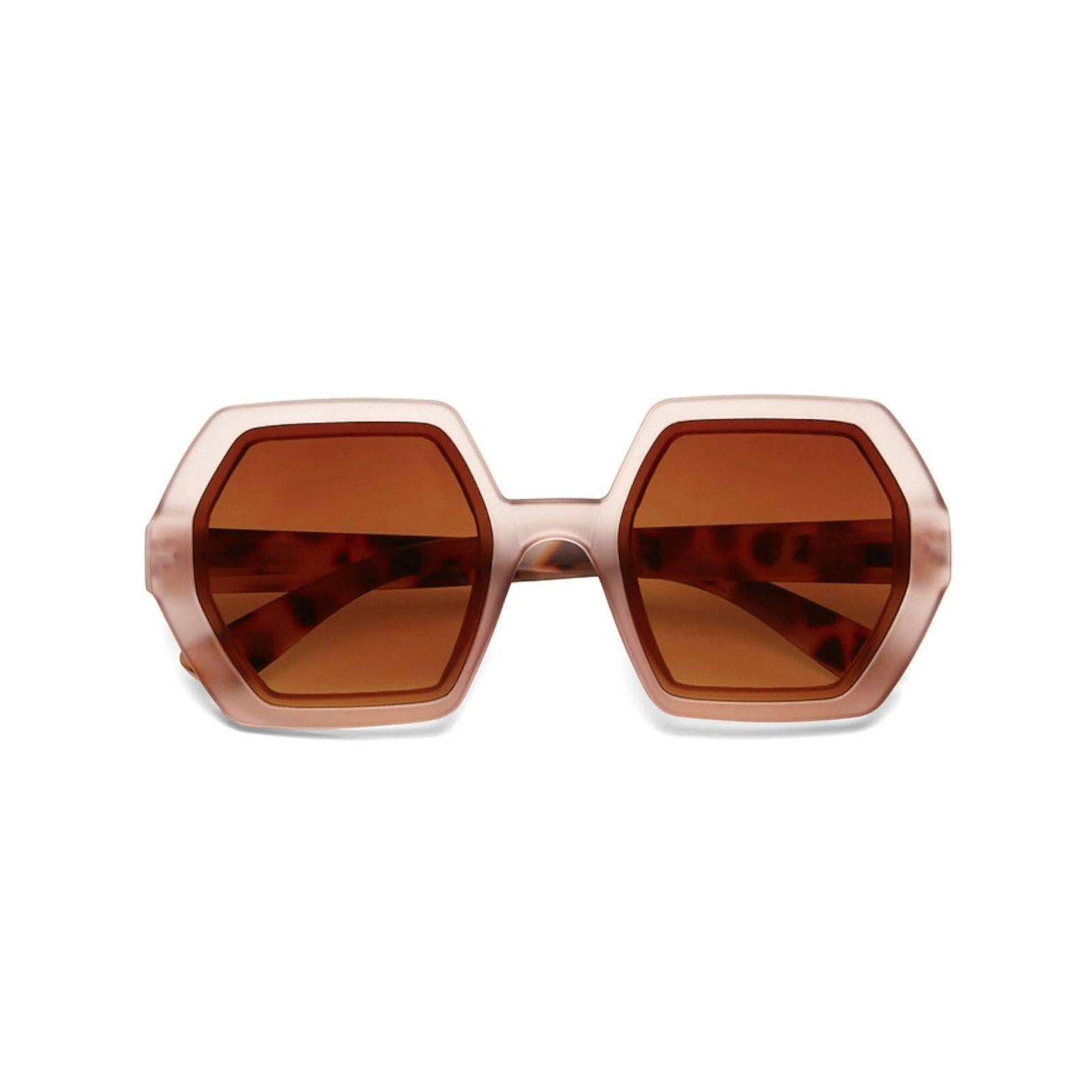 Emma è un occhiale da sole premontato esagonale con montatura soft touch e lenti overlap.Colore Montatura: Pink havanaColore Lenti: Gradiente marrone