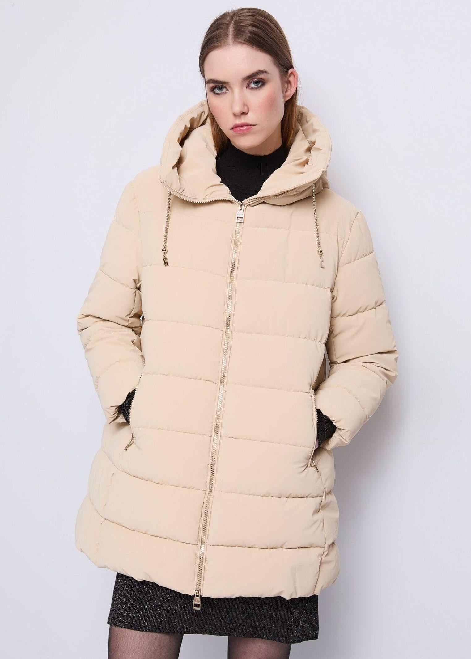 Piumino lungo con cappuccio e coulisse, realizzato con cuciture orizzontali che definiscono la silhouette e donano un tocco moderno. La chiusura con cerniera dorata a doppio cursore e le tasche frontali con zip coordinata aggiungono dettagli eleganti e funzionali. La vestibilità aderente e la lunghezza sotto i fianchi valorizzano la figura, offrendo calore e stile in ogni occasione, perfetto per un look invernale sofisticato e contemporaneo.
