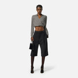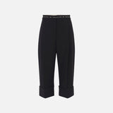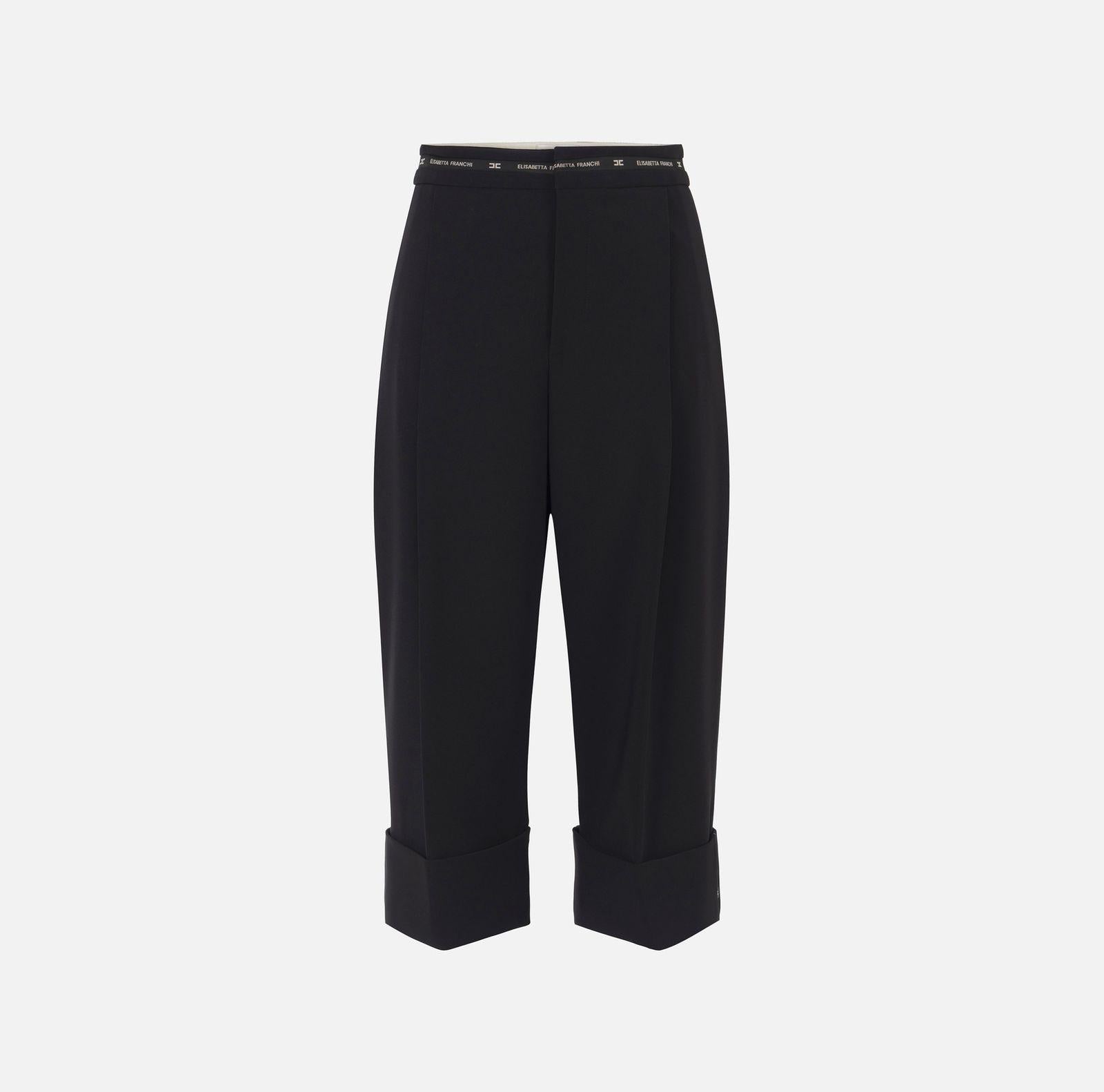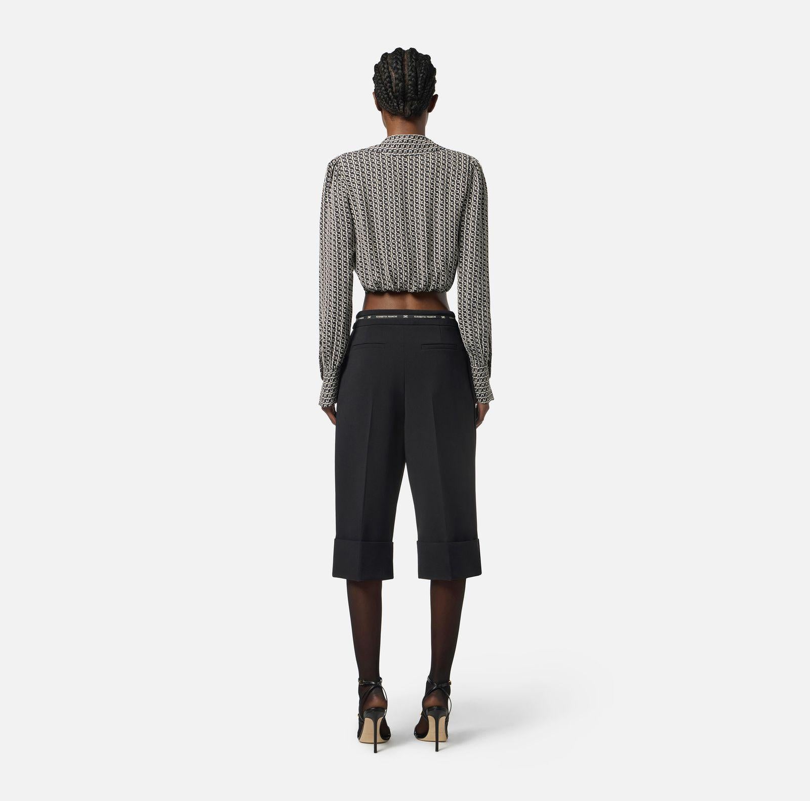 Bermuda realizzato in crepe leggero dalla vestibilità regular. Il dettaglio di stile è il nastro in vita ispirato alla sartoria maschile posizionato esternamente, con logo a contrasto. Ha una lunghezza sotto al ginocchio e risvolto al fondo.