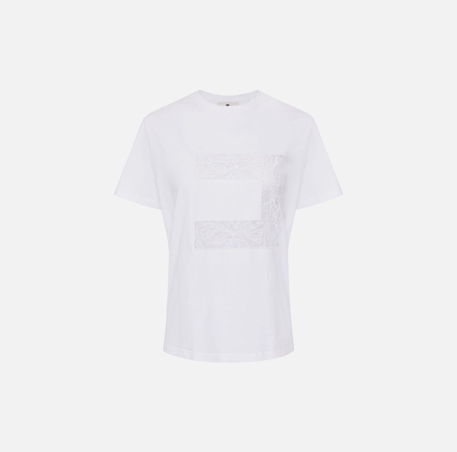 T-shirt realizzata in jersey di cotone, a maniche corte, caratterizzata da macro logo in voile ricamato che decora il davanti e il retro del capo con un tema floreale.