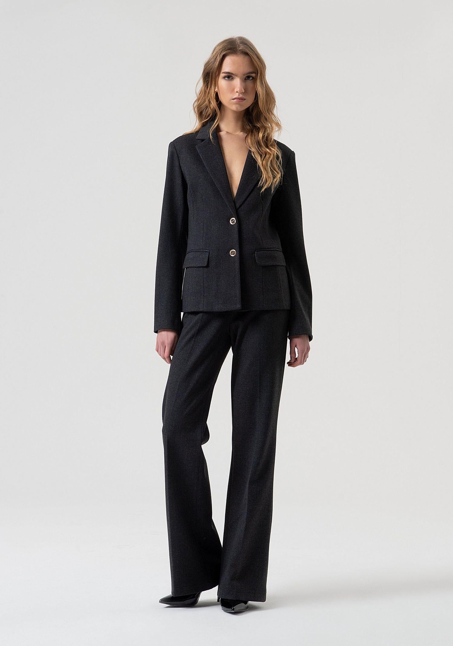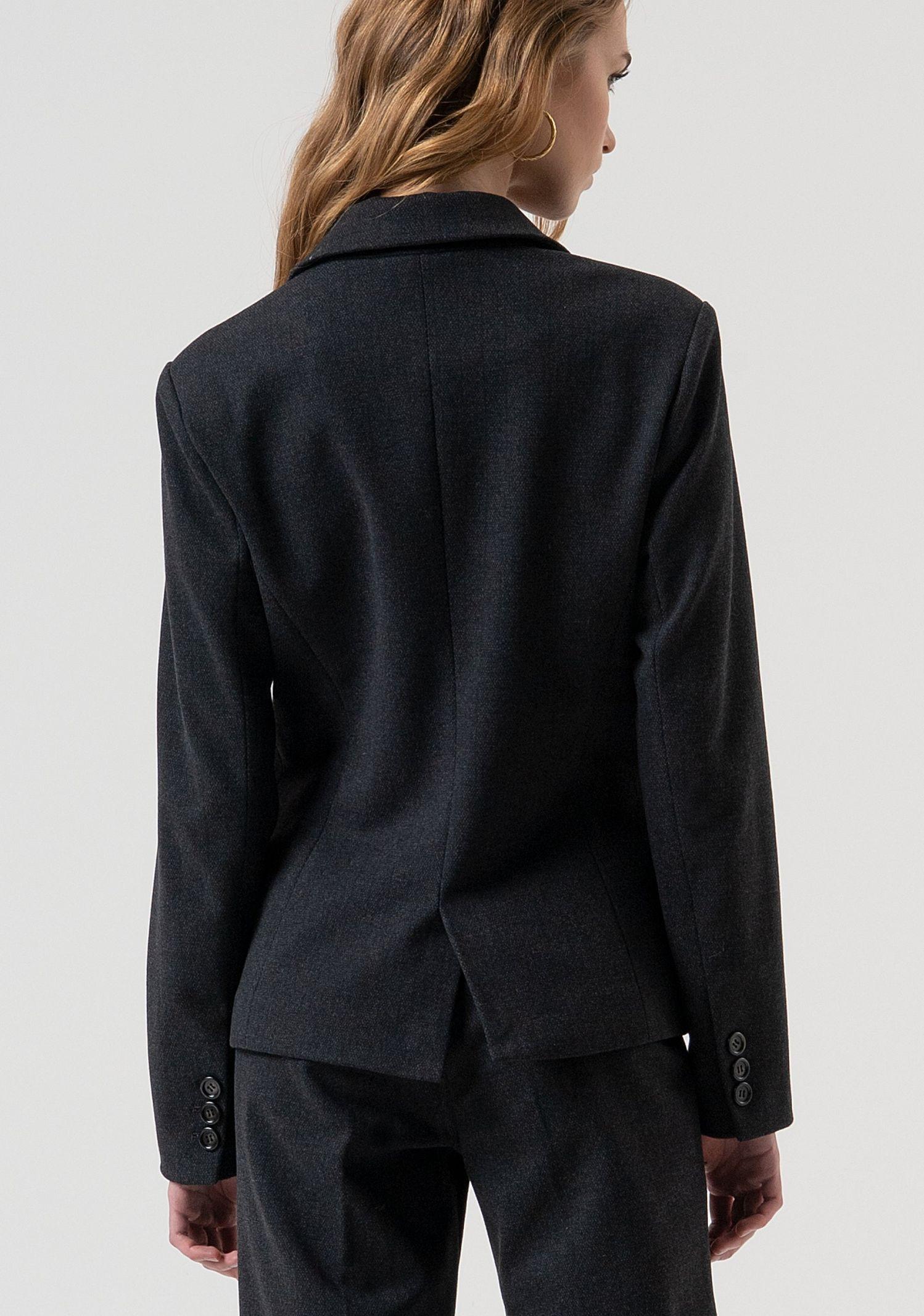 Blazer dalla vestibilità regular realizzato in punto milano, un tessuto compatto ed elastico che assicura comfort e una vestibilità impeccabile, caratterizzato da un design monopetto con revers classico dal taglio pulito, chiusura centrale con bottoni argento per un look essenziale e raffinato, tasche frontali con pattina che uniscono funzionalità e stile, maniche lunghe dalla linea morbida che seguono naturalmente la silhouette, perfetto per completare look formali o casual chic con un tocco di eleganza discreta.