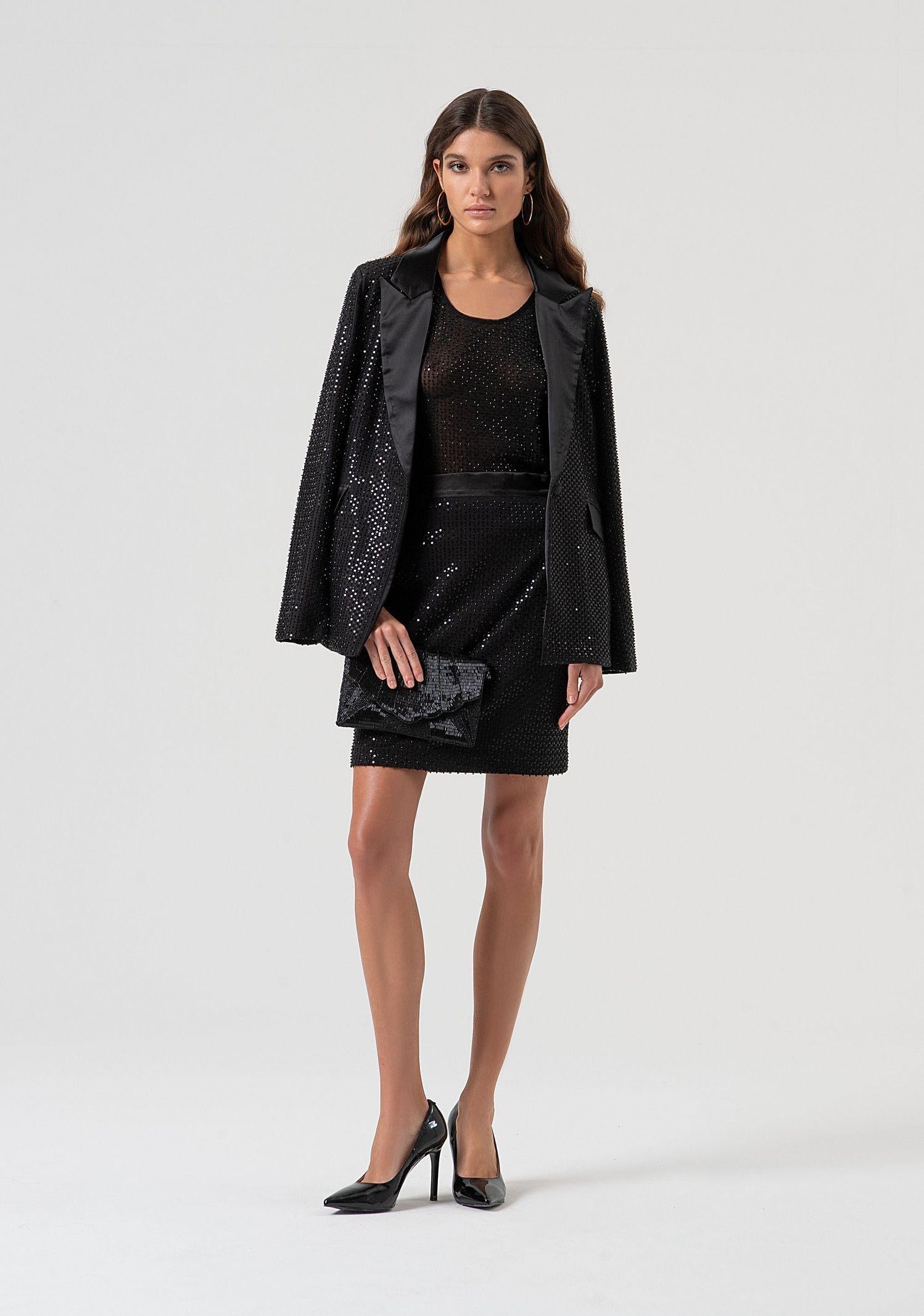 Gonna mini dalla linea slim, pensata per valorizzare la silhouette con eleganza e brillantezza. Il design essenziale è impreziosito da una cascata di strass che dona luce e carattere al capo, rendendolo perfetto per serate speciali o occasioni in cui non vuoi passare inosservata. La vita regolare assicura una vestibilità comoda e bilanciata, mentre la lunghezza mini aggiunge un tocco grintoso e femminile. Un capo statement da abbinare a top essenziali o blazer strutturati per un look da vero effetto wow.
