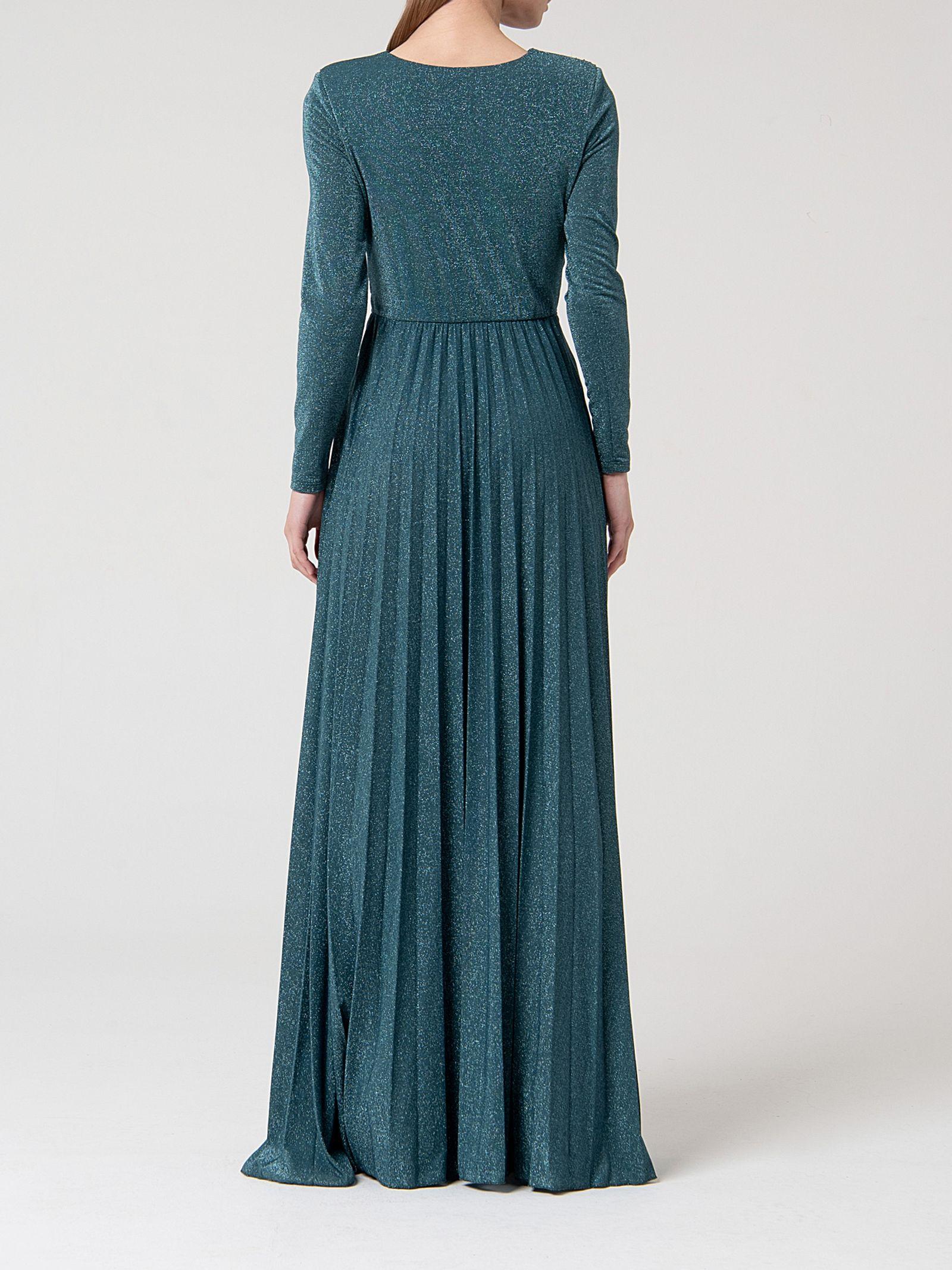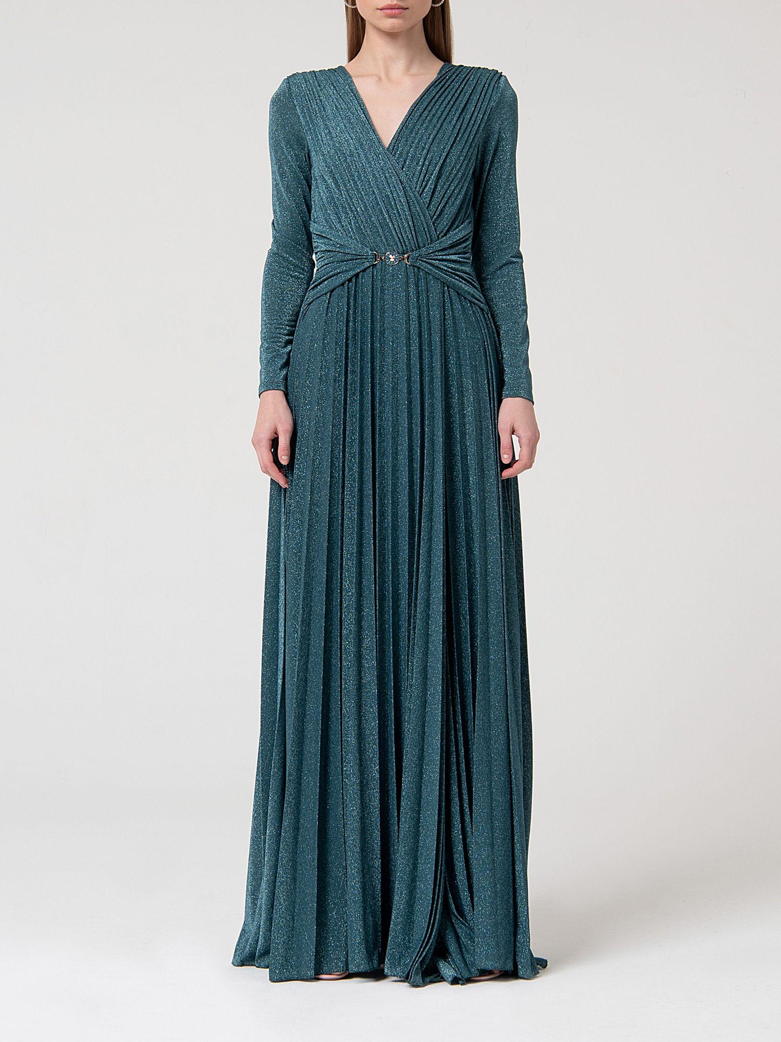 Abito lungo a maniche lunghe in tessuto lurex plissè impreziosito da glitter in tinta, con incrocio in vita e charm in metallo dorato, elastico in vita e sotto una gonna plissè con spacco lungo laterale. Questo abito è caratterizzato da un body interno e spalline imbottite.