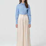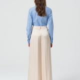 Pantalone a palazzo in raso con vita regolare e pences davanti, due tasche laterali alla francese, e con un fondo ampio. Grazie al tessuto in raso molto fluido e leggero dona un ottimo senso di comfort, ideale per occasioni sia formali che nel tempo libero.