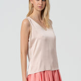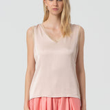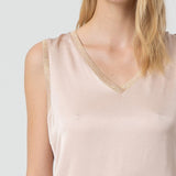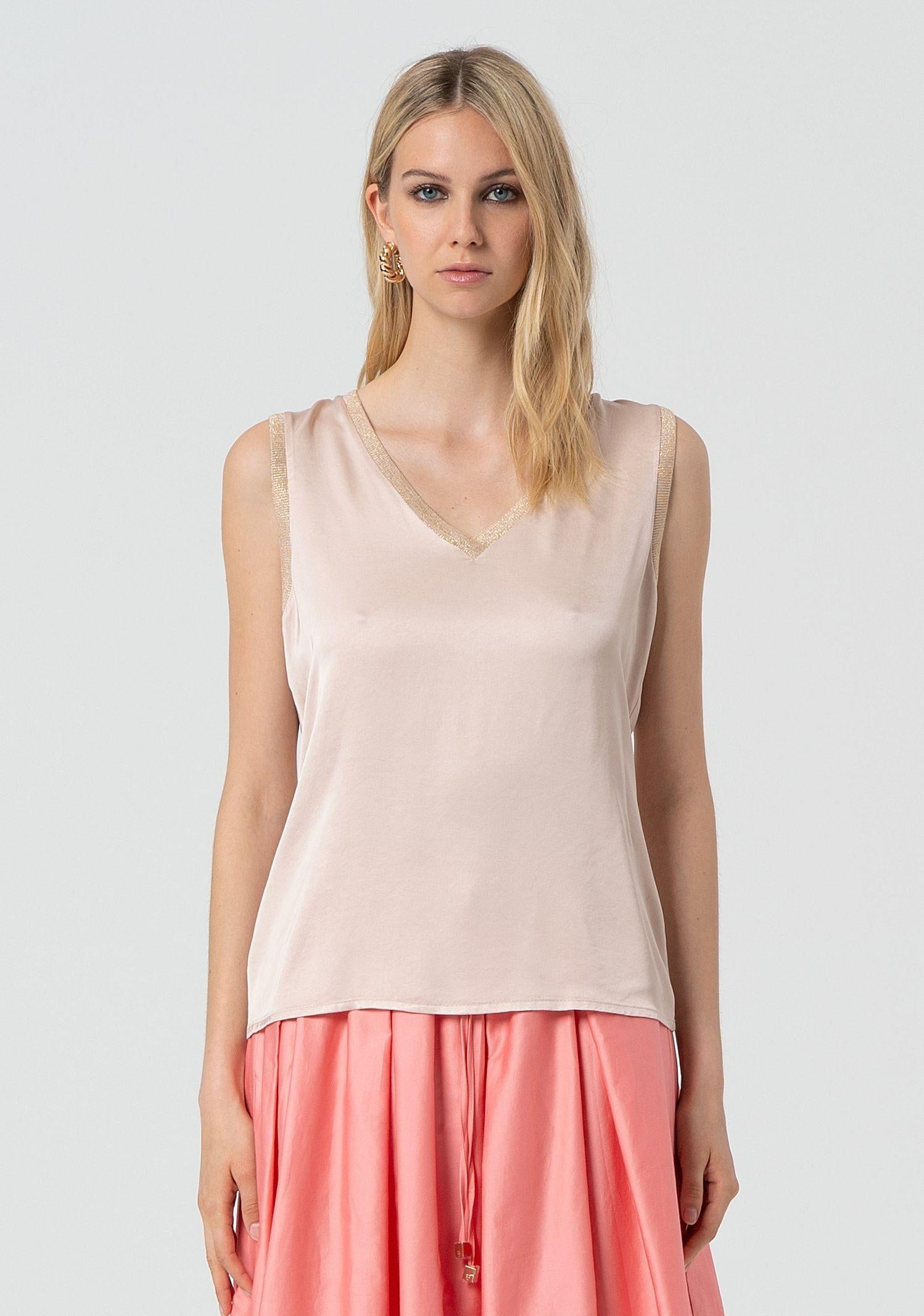 Top senza maniche, con scollatura a V caratterizzata da una fascia in lurex ton su ton. In tessuto viscosa lucida e vestibilità regolare.