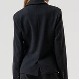 Blazer dalla vestibilità regular realizzato in punto milano, un tessuto compatto ed elastico che assicura comfort e una vestibilità impeccabile, caratterizzato da un design monopetto con revers classico dal taglio pulito, chiusura centrale con bottoni argento per un look essenziale e raffinato, tasche frontali con pattina che uniscono funzionalità e stile, maniche lunghe dalla linea morbida che seguono naturalmente la silhouette, perfetto per completare look formali o casual chic con un tocco di eleganza discreta.