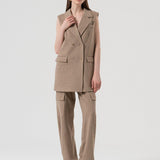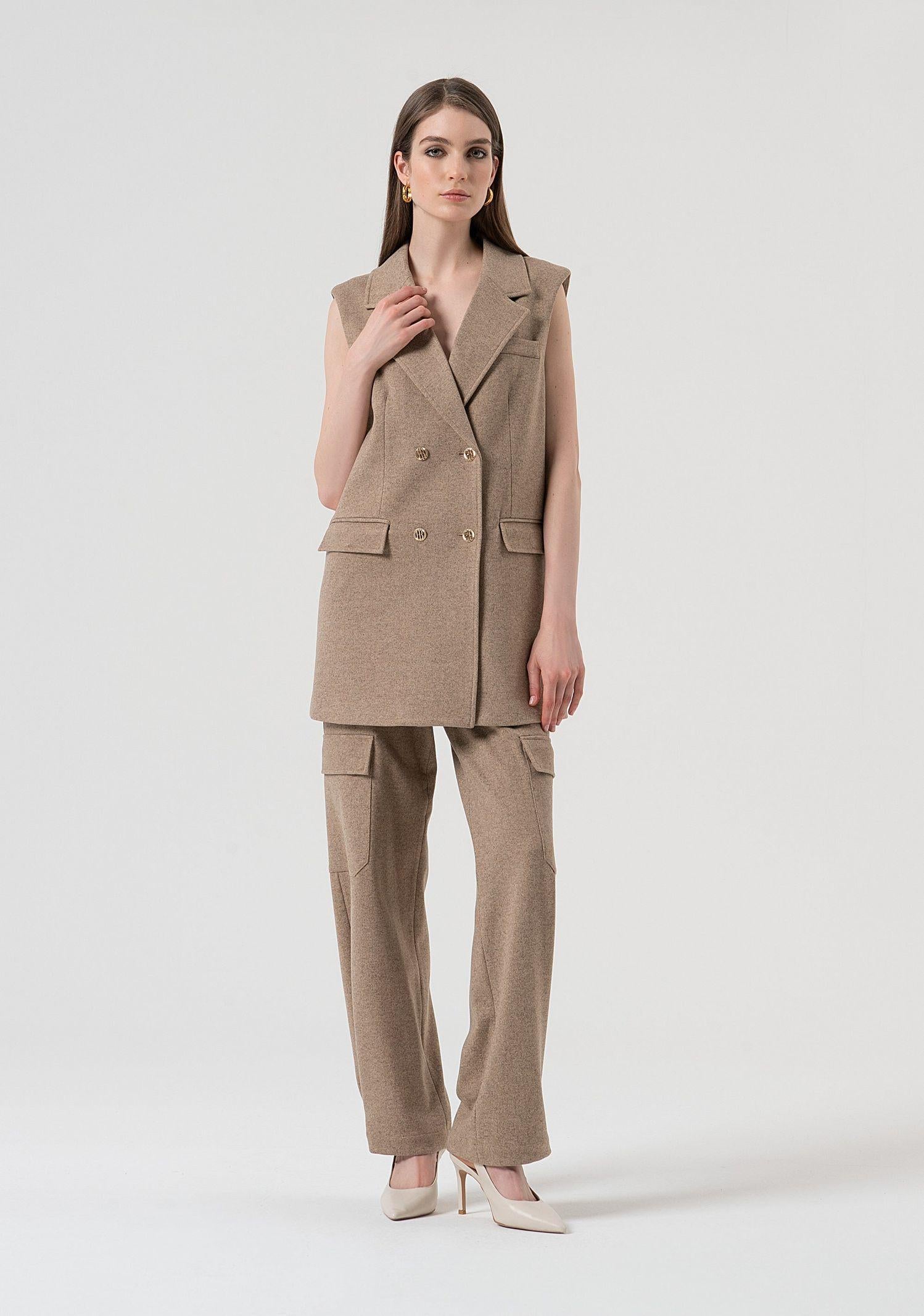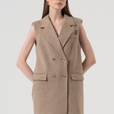 Gilet lungo dalla vestibilità regular realizzato in punto milano, un tessuto compatto ed elastico che garantisce comfort e tenuta della forma, caratterizzato da un design doppiopetto che dona struttura e raffinatezza, revers classico dal taglio definito, chiusura frontale con bottoni metallici a contrasto che aggiungono un dettaglio prezioso e contemporaneo, tasche frontali con pattina che uniscono funzionalità ed eleganza, spalline leggermente imbottite per valorizzare la linea delle spalle e creare una silhouette definita e bilanciata, ideale da indossare sopra camicie o maglie leggere per un look sofisticato sia da giorno che da sera.