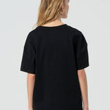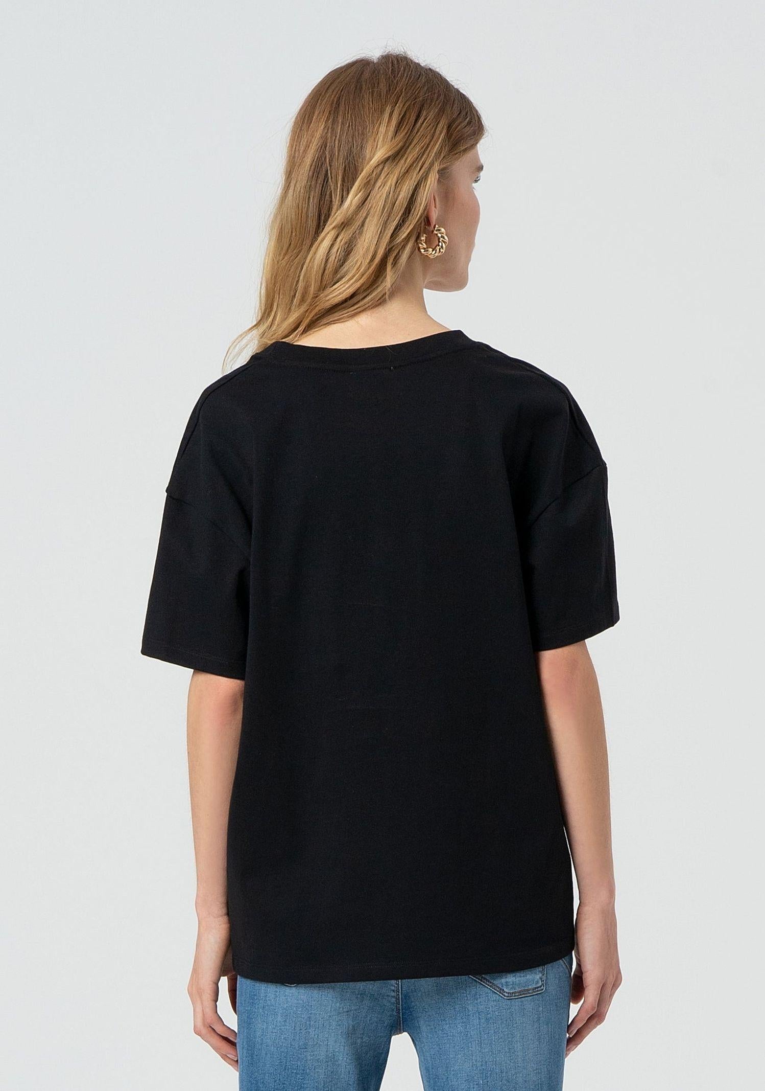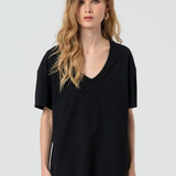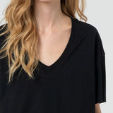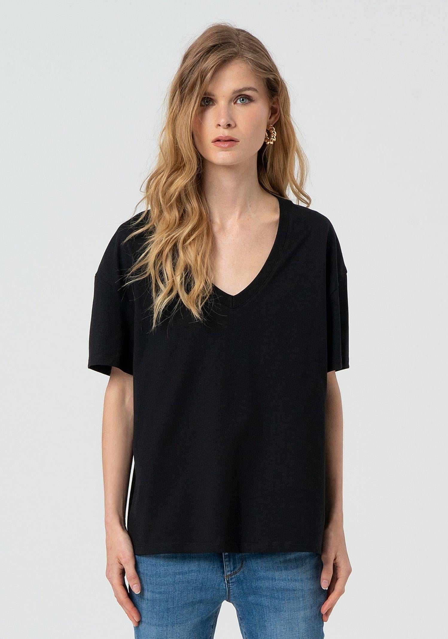 T-shirt realizzata in jersey di cotone, caratterizzata da scollatura a V a coste e maniche corte, lunghezza sotto ai fianchi, vestibilità over.