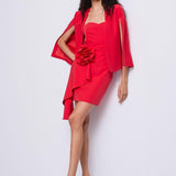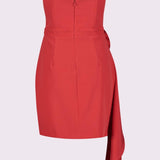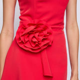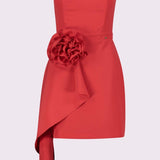 Abito aderente con scollatura a cuore senza spalline e una gonna con drappeggio laterale impreziosito da un fiore grande, chiusura posteriore con una cerniera a scomparsa.