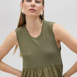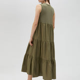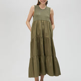 Abito lungo con spalline a canotta e una gonna a volant, realizzato in cotone leggero. Presenta tasche laterali e dettagli di perle dorate nella parte superiore, aggiungendo un tocco di eleganza.
