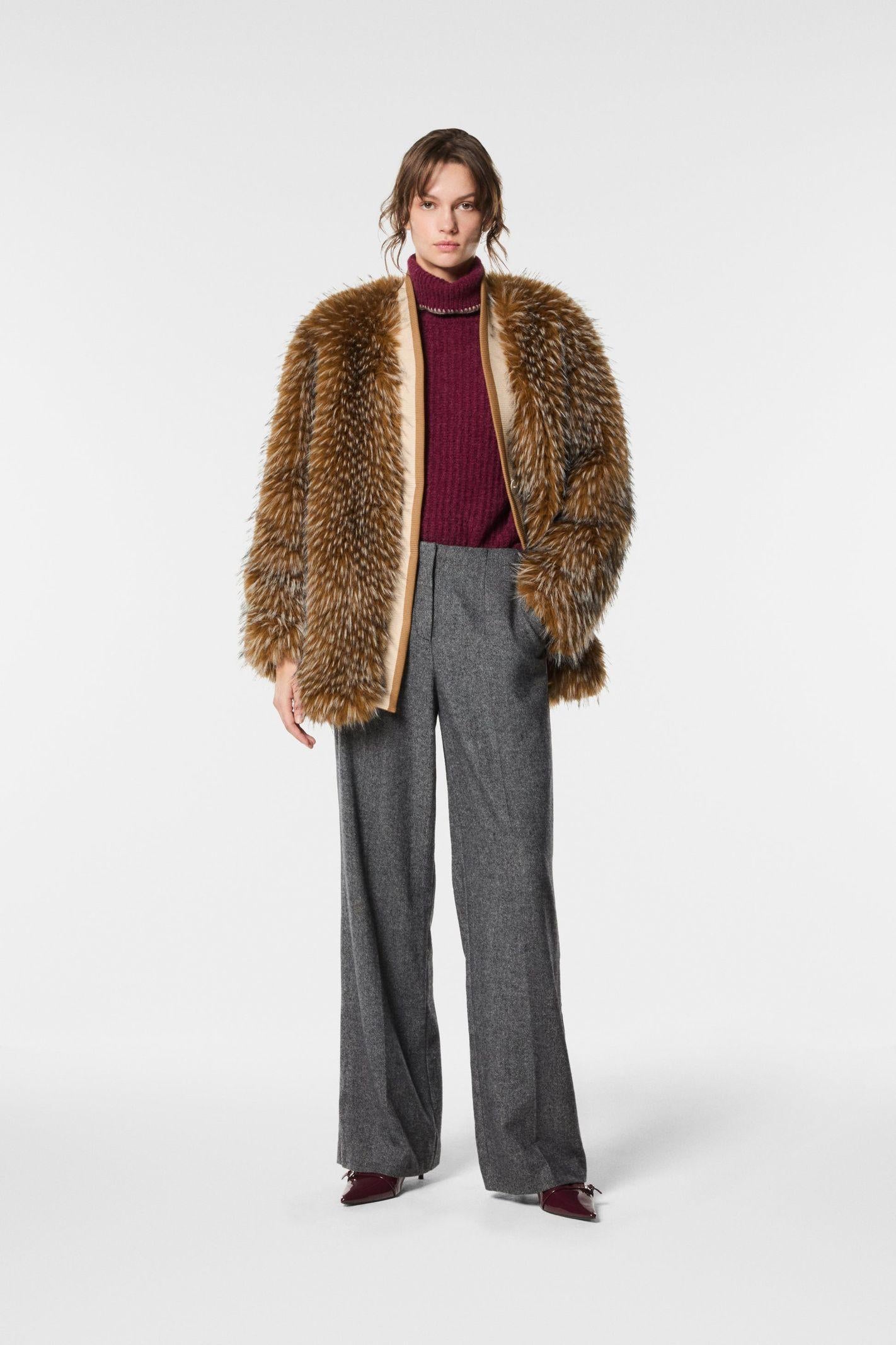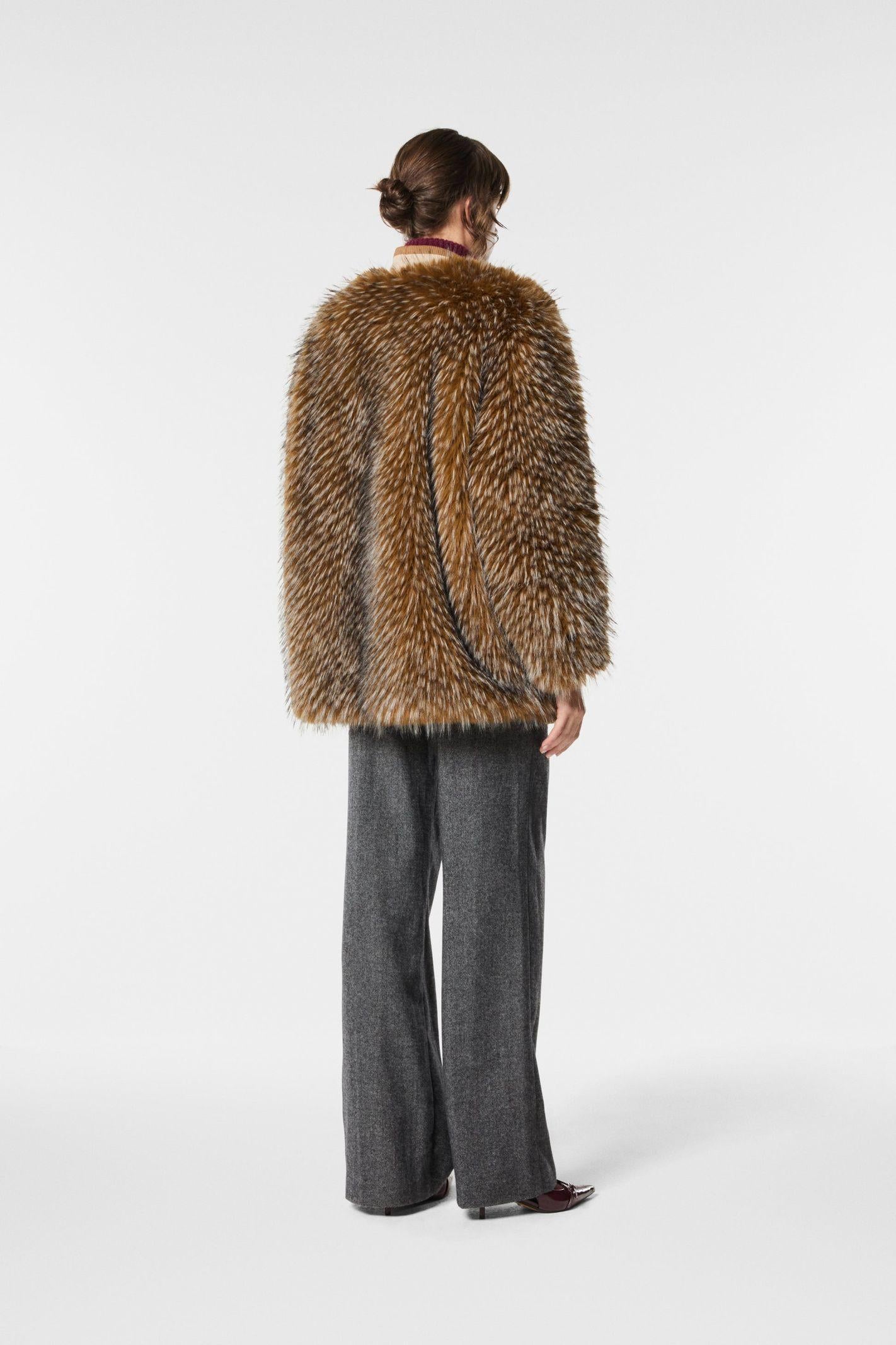 Ecopelliccia in ecomurmasky con bordi a contrasto, sinonimo di stile e praticità. Caldo e chic, completa con eleganza i look invernali, aggiungendo un tocco moderno e femminile.