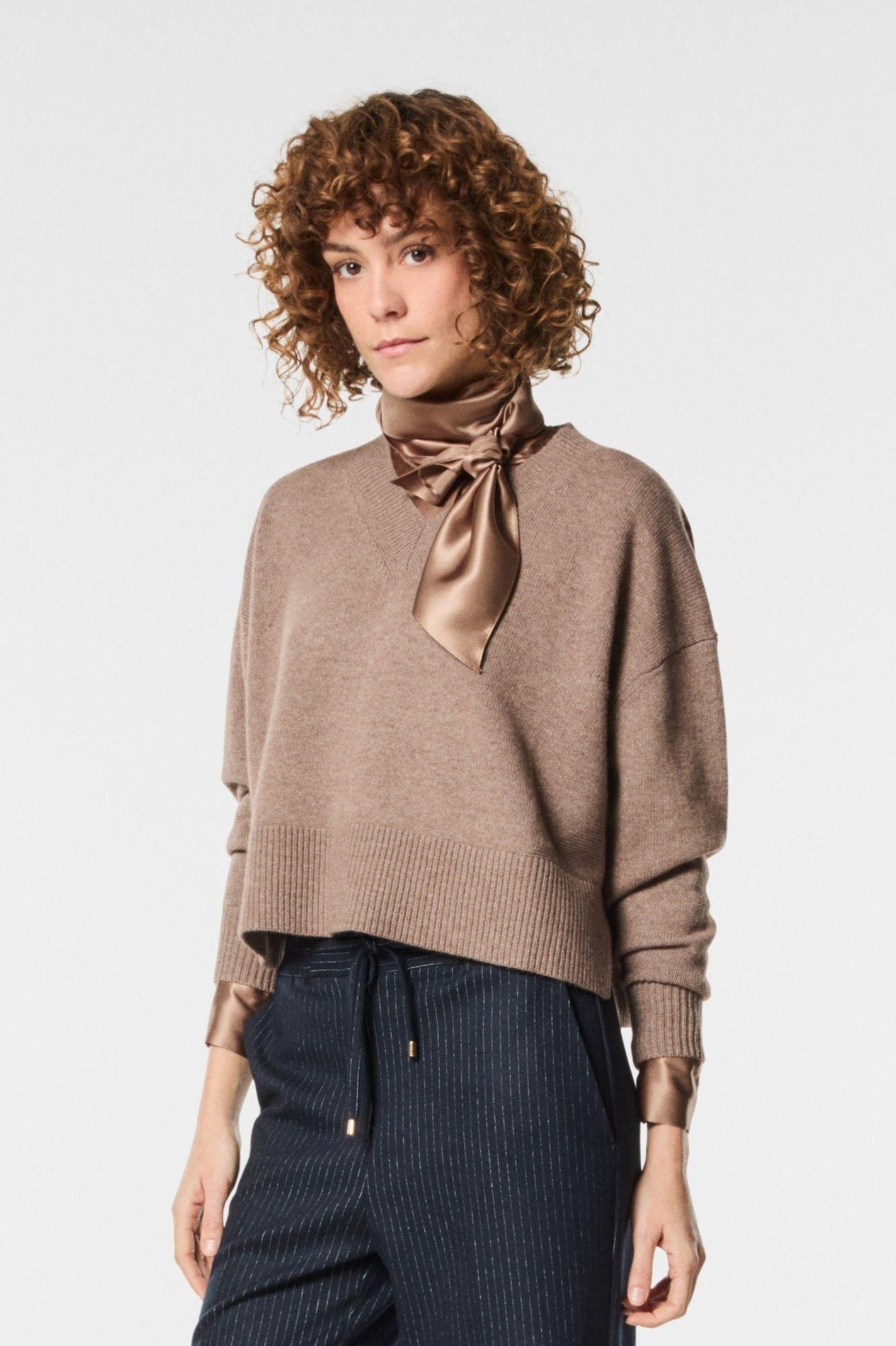 Un classico intramontabile rivisitato in chiave raffinata: questa maglia con scollo a V in morbido misto cashmere unisce eleganza e comfort. Perfetta per un look casual-chic, si abbina facilmente a camicie, gonne o pantaloni, diventando un capo versatile e sofisticato da indossare in ogni occasione.